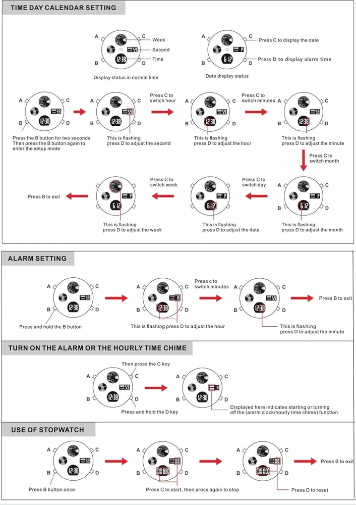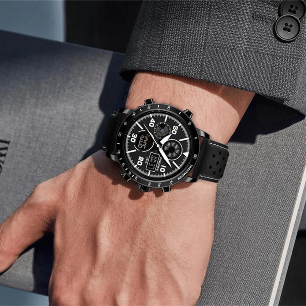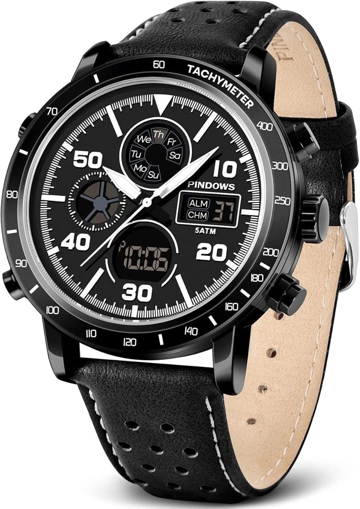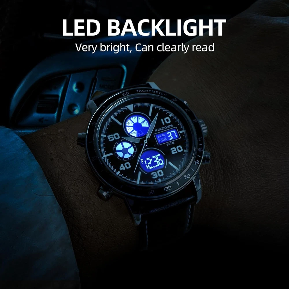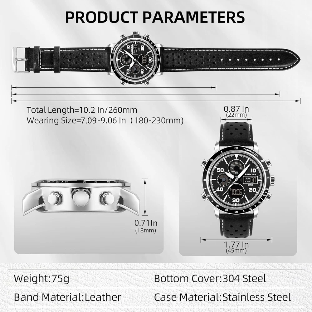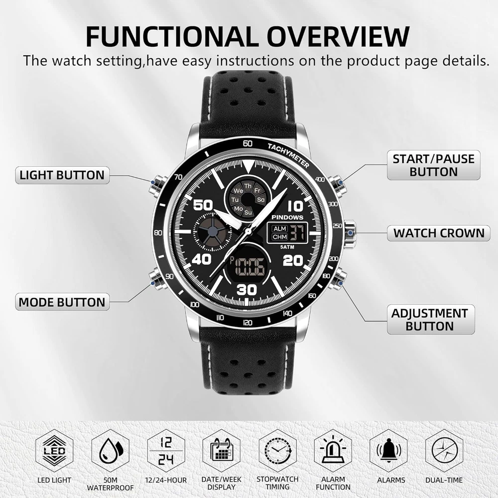 Mens Watches for Men,Military Digital Analog Sports Watch,Outdoor Waterproof Quartz Wrist Watch for Men with Stopwatch Alarm Countdown Dual Dial Time,LED Back Light 【Multifunctional Digital Watch】 This men's digital watch has a simple yet stylish dial with alarm, stopwatch, analog digital display, dual time zone, 12/24 hour system, day of the week display, and LED backlighting, allowing you to read the time with watch setting,have easy instructions on the product page details. 【High Quality Movement】This men's business watch is made of high quality Japanese quartz movement, which can provide stable and precise timekeeping, and is the best choice for daily life and business can wear this men's watch for business, leisure, indoor and outdoor activities or daily use. 【Waterproof and Scratch Resistant】 MEN'S WATERPROOF WATCH with 5ATM /50M waterproof function can withstand sweat, accidental rainfall, etc., but it is not suitable for diving or showering. ●● (Please do not press any buttons underwater and keep away from hot water and steam.) In addition, this men's watch features a stainless steel case and matching mineral glass, which greatly improves wear and scratch resistance. 【Removable Comfort strap and Fashionable Gift】This men's digital watch is a fashionable business-oriented men's watch with leather strap, Removable and replaceable,which is delicate and soft and comfortable to wear. It is suitable for men and young people to wear in daily leisure or work can pick this men's watch as an ideal gift for father,lover,kids,friends and other men on anniversary,birthday,Christmas, Thanksgiving, Father's Day, Valentine's Day. 【After-Sales Service】: store is committed to providing better products and 12 s after-sales service. If you have any problems with the quality or watch settings, please feel free to contact me, we will provide you with a satisfactory solution. Features & Function: Stainless Steel Watch Stopwatch timing Alarms Dual time Hourly Chime 12/24H format LED Light Specification: Case Diameter= 45 mm Dial Thickness= 18mm Band Width= 22mm Wearing Band Length=180-230mm Total Length of Watch=260mm Watches Weight= 75 Grams Package Details: 1 * Men Watches 1 * English Manual 1 * Watch Packaging Box **NOTE**: water mist entering the dial, please do not wear it in a hot bath and no press the button in the water. the watch has any quality problems, or is unclear about the settings, we will Provide satisfactory service or teach you the settings.