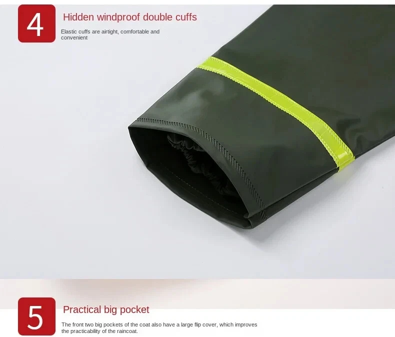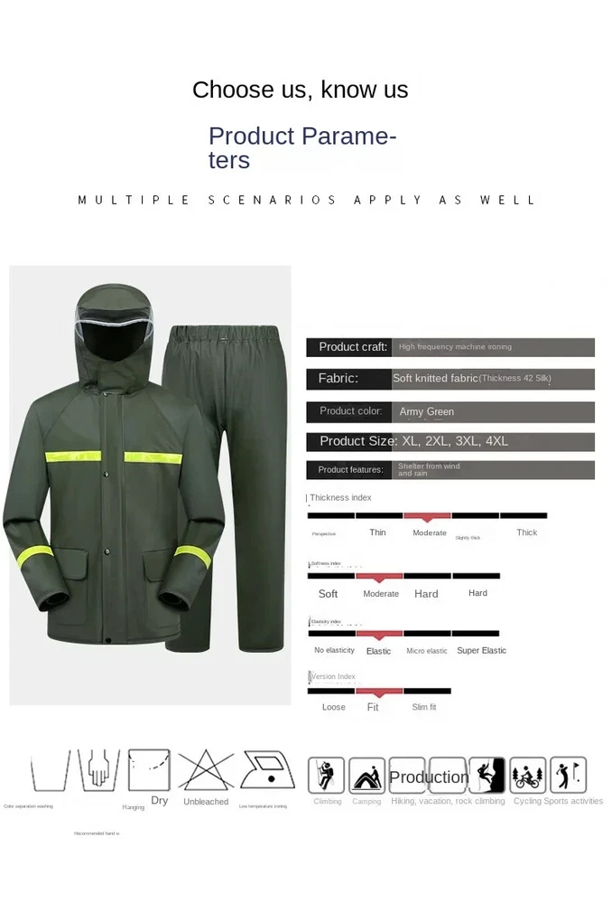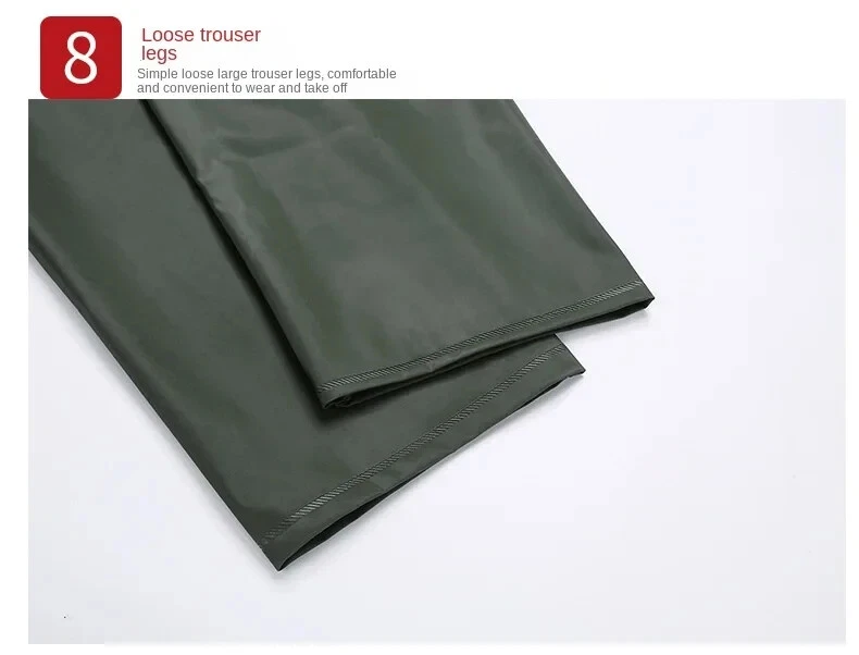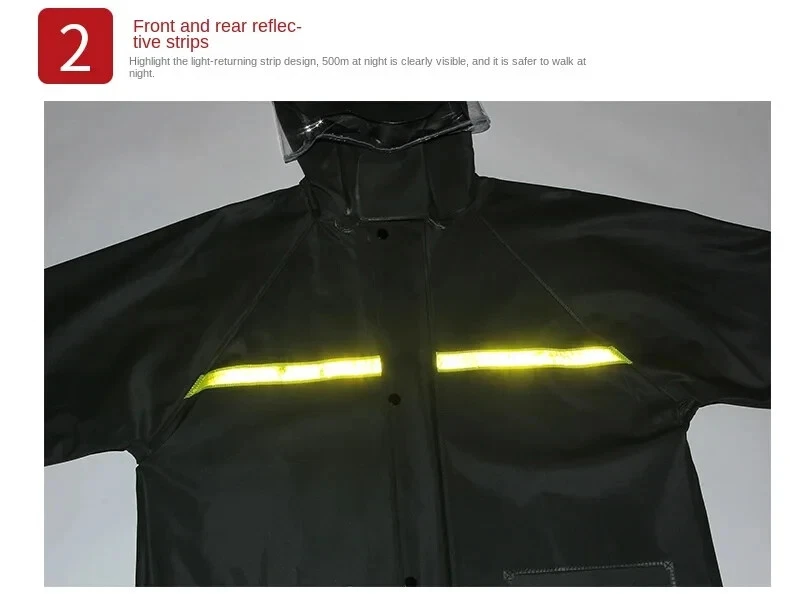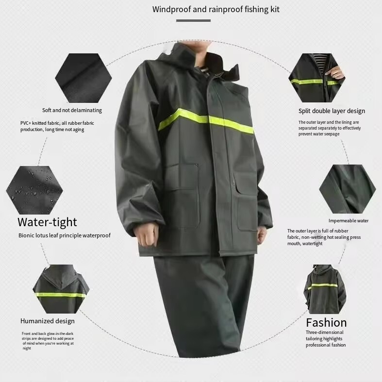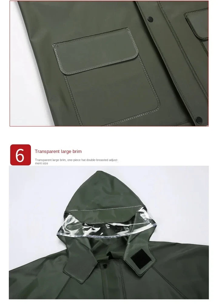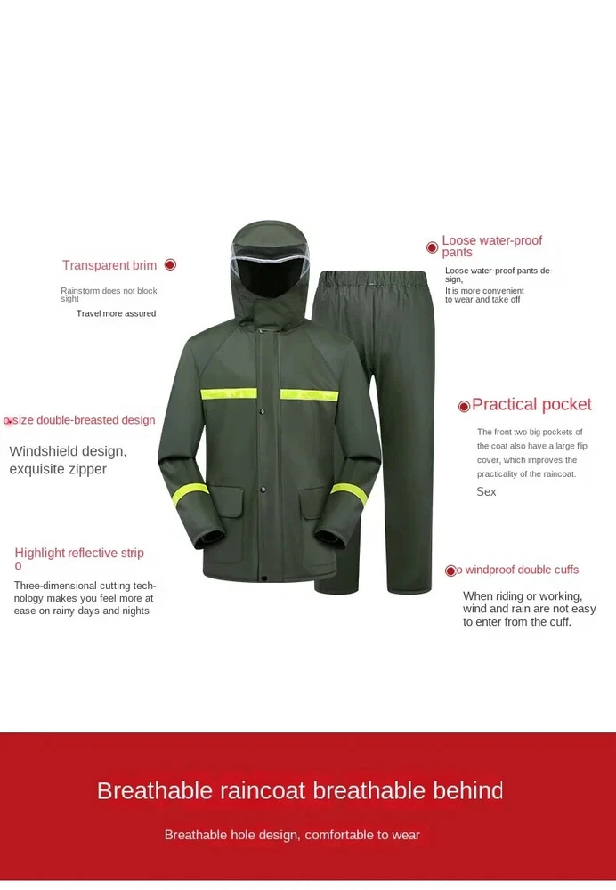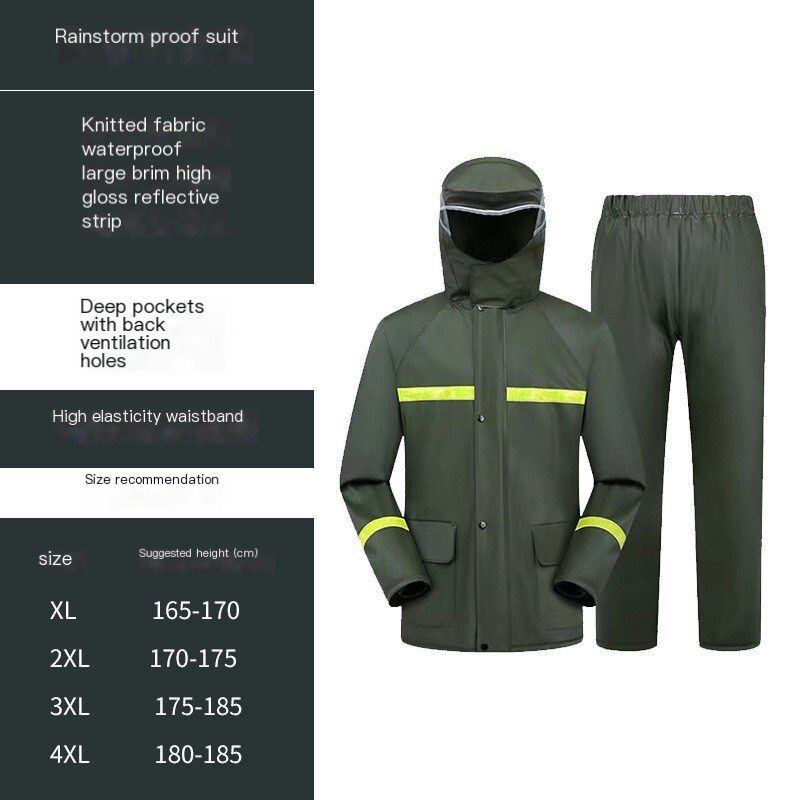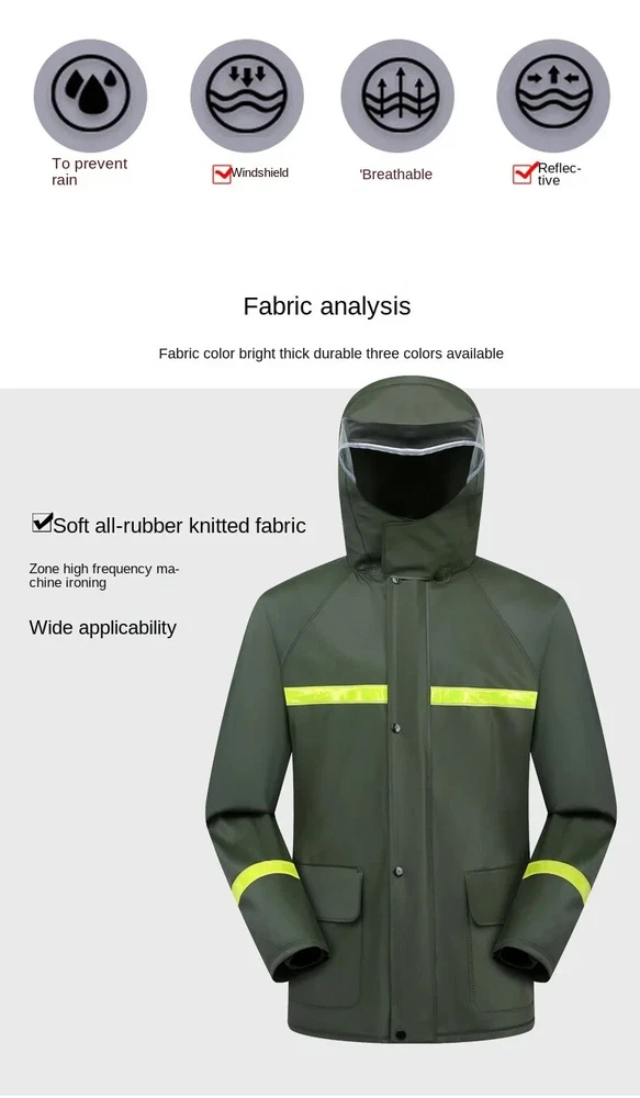Item Description : Stay Dry and Stylish with Our Green Two-Piece Raincoat! Whether you're caught in a sudden downpour or preparing for an outdoor adventure, this green two-piece raincoat offers comfort, functionality, and convenience. Featuring a high-definition hood with visor , multiple pockets , and a portable zipper design, this raincoat is perfect for those who need reliable protection from the elements while on the go. Product Features : Color : Vibrant Green Type : Two-Piece Set (Jacket + Pants) Material : Waterproof, Durable, and Breathable Fabric Hood : High-definition visor for clear vision in the rain Pockets : Convenient front pockets for your essentials Portable Design : Zipper closure for easy packing and portability Lightweight & Compact : Easy to carry in a bag or backpack Perfect for : Hiking, Camping, Festivals, Outdoor Sports, Commuting, and Travel Why Choose This Raincoat? Versatile Protection : Ideal for both light drizzles and heavy downpours, keeping you dry without compromising on comfort. Durable and Comfortable : Made from high-quality waterproof fabric to ensure longevity, and designed for a comfortable, breathable fit. Practical Design : The raincoat comes with convenient pockets to store your small items and a high-definition hood that ensures excellent visibility during rainy weather. Compact & Portable : With the zipper design, it’s easy to store and carry, making it perfect for travel and outdoor activities. Item Specifics : Brand : [Your Brand Name] Type : Raincoat / Poncho Gender : Unisex Color : Green Material : Waterproof Fabric Style : Two-Piece Features : Hood, Zipper Closure, Pockets, Lightweight Size Options : [Size Chart or Available Sizes] Condition : New with Tags Suitable for : Outdoor Activities, Hiking, Camping, Travel Country of Manufacture : [Country] Shipping & Returns : Shipping Options : Standard Shipping: Estimated delivery within [insert time frame]. Expedited Shipping: Available at checkout. Returns : We offer a 30-day return policy for your peace of mind. If you’re not satisfied with your purchase, simply return it within 30 days for a full refund or exchange.