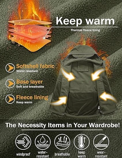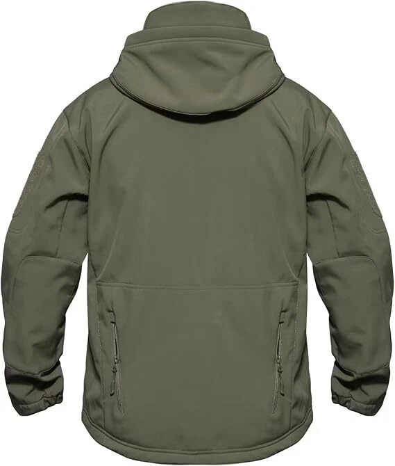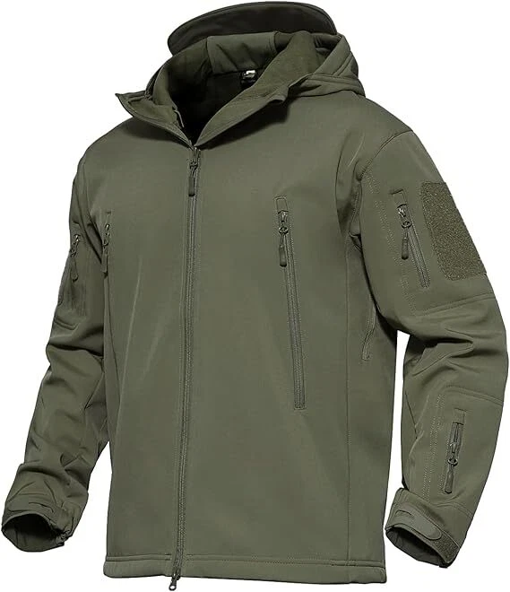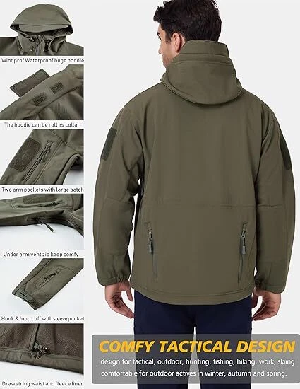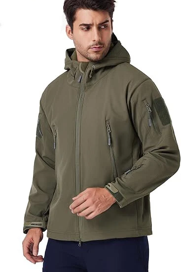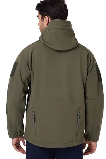 Product Description Classic tactical jacket, comfortable for all outdoor activities. it can keep you dry in the small rain and snow, also block all wind and keep the cold air out. Flexible & Multi-function. 100% polyester soft shell fabric, with thermal fleece liner, keep you pretty warm in winter. Waterproof & Windproof; Men's Clothes Zipper; Huge hood can be roll up; Two way zip up to open or close; Under arm vent zippers; Hook & loop adjustable wrist cuff; Drawstring waist and hood; Large loop on both arm for individuality patches. Tactical multi-Pockets design: 2 large zippered chest pockets; 2 back pockets; 2 small pockets on left arm and 1 small pockets on left sleeve. Good for winter, autumn and spring. Great for outdoor sport, hunting, fishing, hiking, climbing, camping, travelling, motorcycle, cycling, work and casual wear. Model Show Applicable scene