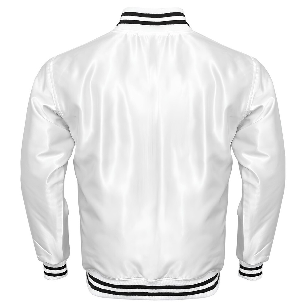VARSITY/BASEBALL JACKET White Satin - Baseball Jacket Varsity Jacket Letterman Jacket – Available in All Sizes We specialize in crafting personalized jackets featuring intricate embroidery and custom patches, designed to perfectly match your style and specifications. Product Description : This listing is for a beautiful well made Authentic Letterman Jacket Comes with Satin Specification : The varsity jacket is expertly crafted from premium-quality 100% satin for both the body and sleeves, ensuring a sleek and stylish finish. Varsity Jacket with 2 Front Side Pockets and 1 Interior Pocket Polyester Quilted Padded Lining for Superior Warmth and Insulation Soft-Shell Rib Knit Cuffs, Collar, and Bottom for Skin Protection We are confident that the exceptional quality and remarkable design of our products will exceed your expectations.