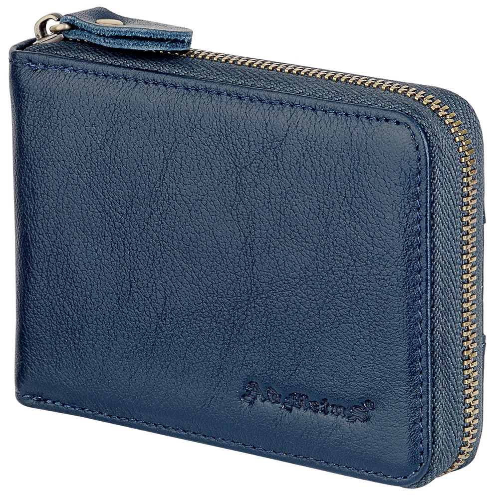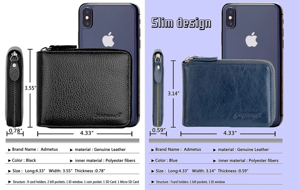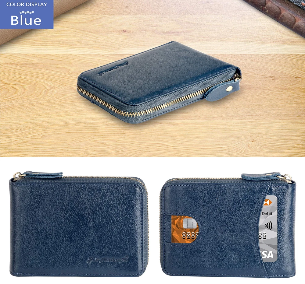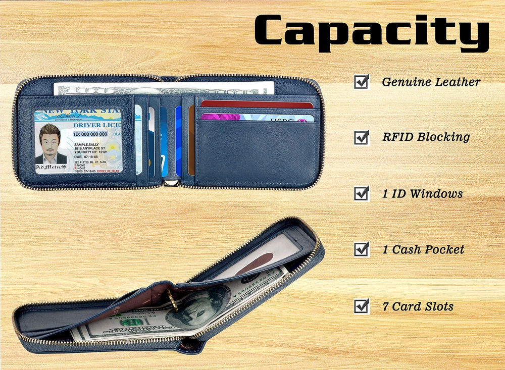GENUINE LEATHER: Made of high quality genuine leather, as time goes on, it will be more beautiful, and better touch feeling. With durable three-side metal zipper. Well craftsmanship ensure long lifetime RICH ROOM & SMALL SIZE : Include 1 quick access outside card slot/ 1 cash slot / 1 ID window/ 7 card slots, this compact wallet could hold all your daily needs. Size: 4.14" x 2.99" x0.59", much smaller and thinner than ordinary bulky zipper wallet ZIPPER SECURITY : The zipper design could protect your cash, coin,cards,bills against losing, keep them well organized ,prevent dust and other dirty thing RFID BLOCKING :wallets are equipped with advance RFID Blocking technology prevent vital cards detail from unnoticed scan, protects your privacy information CREATIVE WRAPPED: Special box design, the box looks like an ancient book, creative and beautiful. It is a great gift idea for Birthdays, Anniversaries, Father's Day, Christmas and other special occasions