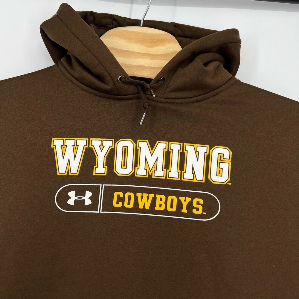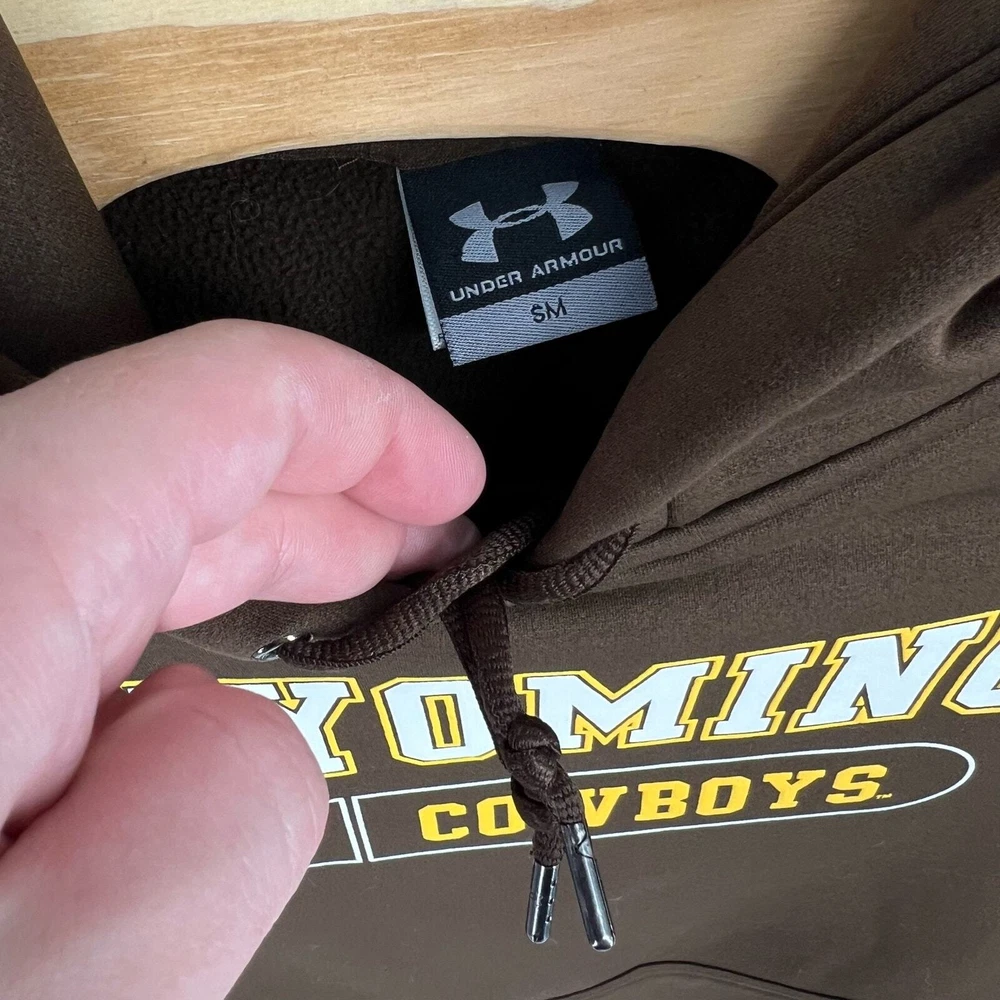 Men's brown Under Armour University of Wyoming Cowboys hoodie sweatshirt pit to pit: 22" length: 24" Fit's like: men's S Item is in good used condition. Look at photos to see the condition. All, if any, flaws have been pictured. See the last photo for measurements along with my suggestion of what it fits like. Please know which measurements fit you prior to purchasing, and don’t just rely on my suggestion. Feel free to ask any questions! ***Item is cross posted on several platforms***