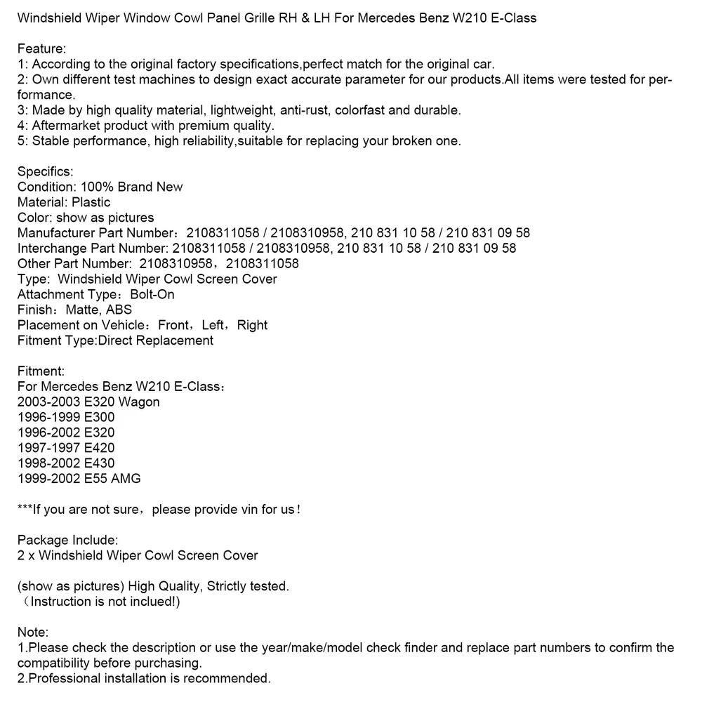Intake Manifold Boot Joint 13110-42A12 Fit Suzuki DR200 DR200SE TS250 95-13 10.79 USD Free shipping 16pcs Valve Lifters Active Fuel Management AFM DOD for GM Chevr 5.3L 6.0L UE 89.99 USD Free shipping FUEL PUMP FUSE RELAY fit for Yamaha YZF R1 R6 FZ1 Fazer FZ8-N Naked 5VK-81950-40 28.87 USD Free shipping Universal Hex Socket Bolt Screw Nut Head Cover Cap M6 6MM Motorcycle Gold US 9.79 USD Free shipping 75-90-115-200-225 Fuel Injectors 37001 For Mercury Outboard Mariner 804528 29.87 USD Free shipping One Way Sprag Clutch Bearing Assy For Kawasaki KX450 KX450X KX450SR 2019-2023 23.38 USD 24.87 USD Free shipping 6% off Cylinder Head Plug for Coolant Temperature Sensor Hole M12-1.5 LS1 LSX LS3 11.79 USD Free shipping 1× Universal 12V Red Car Auto LED High Mount Third 3RD Brake Stop Tail Light USA 14.87 USD Free shipping Generator Stator For Honda TRX 300 TRX300 FW FOURTRAX 1988-2000 *18 Poles* 45.79 USD Free shipping Left Tail Lamp Bulb Holder with Bulbs For Mercedes W204 C-Class 2007-2010 35.87 USD Free shipping Aluminium Brake Pedal Extension Peg Extender Universal Gray For Most Motorcycles 14.79 USD Free shipping Fuel Pump 16700-K26-B01 Replace Fit For Honda Msx125 16-18/2020 Grom125 17-20 US 52.87 USD Free shipping A Fantastic Shop Send us a message Our Store Seller Profile Feedbacks Save this seller Contact Windshield Wiper Window Cowl Panel Grille RH&LH For Mercedes Benz W210 E-Class/ Windshield Wiper Window Cowl Panel Grille RH & LH For Mercedes Benz W210 E-Class Feature: 1: According to the original factory specifications,perfect match for the original car. 2: Own different test machines to design exact accurate parameter for our products.All items were tested for performance. 3: Made by high quality material, lightweight, anti-rust, colorfast and durable. 4: Aftermarket product with premium quality. 5: Stable performance, high reliability,suitable for replacing your broken one. Specifics: Condition: 100% Brand New Material: Plastic Color: show as pictures Manufacturer Part Number:2108311058 / 2108310958, 210 831 10 58 / 210 831 09 58 Interchange Part Number: 2108311058 / 2108310958, 210 831 10 58 / 210 831 09 58 Other Part Number: 2108310958,2108311058 Type: Windshield Wiper Cowl Screen Cover Attachment Type:Bolt-On Finish:Matte, ABS Placement on Vehicle:Front,Left,Right Fitment Type:Direct Replacement Fitment: For Mercedes Benz W210 E-Class: 2003-2003 E320 Wagon 1996-1999 E300 1996-2002 E320 1997-1997 E420 1998-2002 E430 1999-2002 E55 AMG ***If you are not sure,please provide vin for us! Package Include: 2 x Windshield Wiper Cowl Screen Cover (show as pictures) High Quality, Strictly tested. (Instruction is not inclued!) Note: 1.Please check the description or use the year/make/model check finder and replace part numbers to confirm the compatibility before purchasing. 2.Professional installation is recommended. About US About Our Items We strive to describe all items accurately and thoroughly, with the utmost care and attention to detail. However, to ensure a mutually satisfactory transaction, we kindly ask for your assistance in thoroughly reviewing the item description and photos, and addressing any questions before placing a bid. Customer Satisfaction We stand behind our commitment with exceptional service, a 100% money-back guarantee, and a dedication to customer satisfaction. I am readily available to address any inquiries or concerns you may have, both before and after your purchase. Our aim is to ensure your shopping experience is enjoyable and that you're delighted with your purchase. Feedback Your feedback is crucial to our business's success. If you're satisfied with your purchase and the service you received, we would greatly appreciate your positive feedback, along with an overall Detailed Selling Rating (DSR) of 5. Please take a moment to leave us positive feedback. Our eBay account is set up to automatically reciprocate positive feedback once yours is received. If you're considering leaving neutral/negative feedback or opening an eBay/PayPal case, we encourage you to reach out to us immediately. We're committed to resolving any issues to the best of our ability. Shipping Parcel will be shipped using Standard shipping method. For security purposes, items will be shipped exclusively to the confirmed address on Paypal. Please ensure your Shipping address is up to date before proceeding with payment. Estimated delivery time within the United States ranges from 3 to 10 business days, depending on your location. Returns We accept returns within 60 days from the date the buyer receives the item. If the item is found to be defective upon receipt, the customer has up to 30 days from the date of receipt to request an exchange for a new item or a refund. For returns due to a change of mind, we accept items in their original selling condition. However, if the package has been opened due to a mistaken order, it does not qualify for our return policy. Please note that the buyer is responsible for covering the cost of return postage. If you encounter any issues, please reach out to us via eBay message, and we'll respond within 24 hours. Black Adjustment Rear Seat Recline Kit sets fit For Ford F150 2015-23 55.51 USD Free shipping 2PCS L+R Headlight Washer Cover 63126922155 For Mini Cooper R50 R52 R53 21.87 USD Free shipping Stainless Steel Van Ladder 093TM For Ford Transit Medium Roof Van 2014-2024 174.08 USD Free shipping Left Driver Side Door Entry Keypad Pillar Molding Trim For Ford Explorer 11-19 52.99 USD Free shipping Door Trim Molding Rear Right Lower Passenger RH Side For Nissan Rogue 2021-2023 58.99 USD Free shipping Weatherstrip Window Seal Belt 2009-2021 For Dodge Ram 1500 2500 3500 4500 5500 58.87 USD Free shipping 4pcs Outer Door Glass Weatherstrip Moulding For Toyota Yaris Vitz 2005-2010 US 48.87 USD Free shipping Silver Dash Trim Rings Speedometer Gauge Cluster Panel For BMW E38 E39 E53 X5 19.87 USD Free shipping 4PCS Weatherstrip Window Seal Belt 72410-SCA-E01 For Ho
