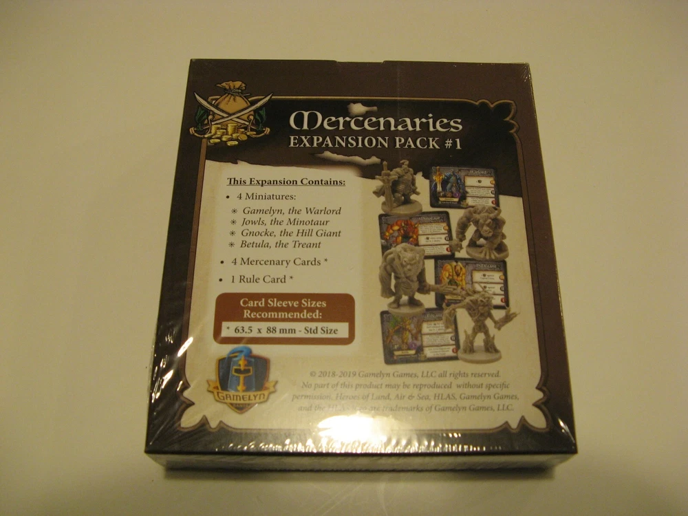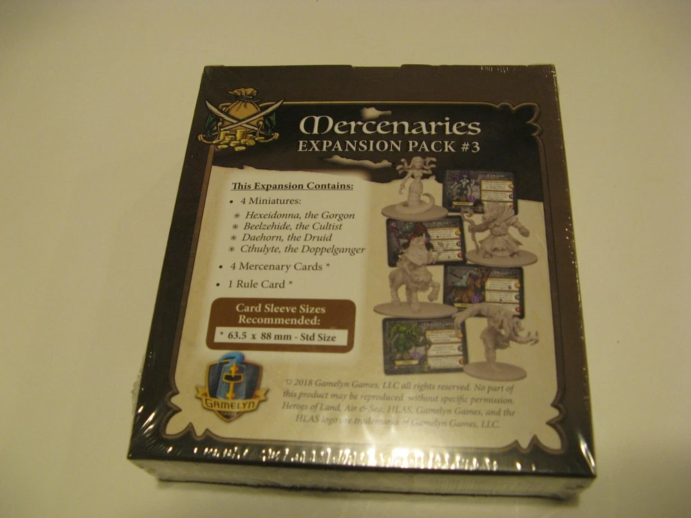 Here are the three Mercenaries Expansion Packs (Gamelyn Games, 2018-2019) for Heroes of Land, Air & Sea , the 4x board game where players compete to expand their small kingdom into a major power. #1 (HLASP202) includes 4 mercenary miniatures with cards; #2 (HLASP302) includes 2 miniatures with cards; and #3 (HLASP401) includes 4 miniatures with cards. All are new and sealed in shrink wrap. Shipping cost will be determined by the shipping calculator . And I will combine shipping whenever possible to make it as economical as I can for you. So please check my other listings! Thanks for looking!