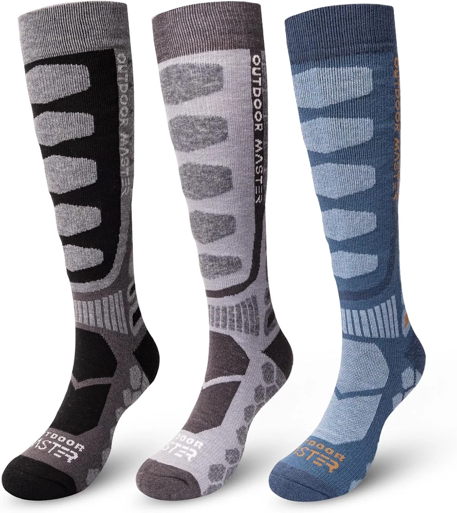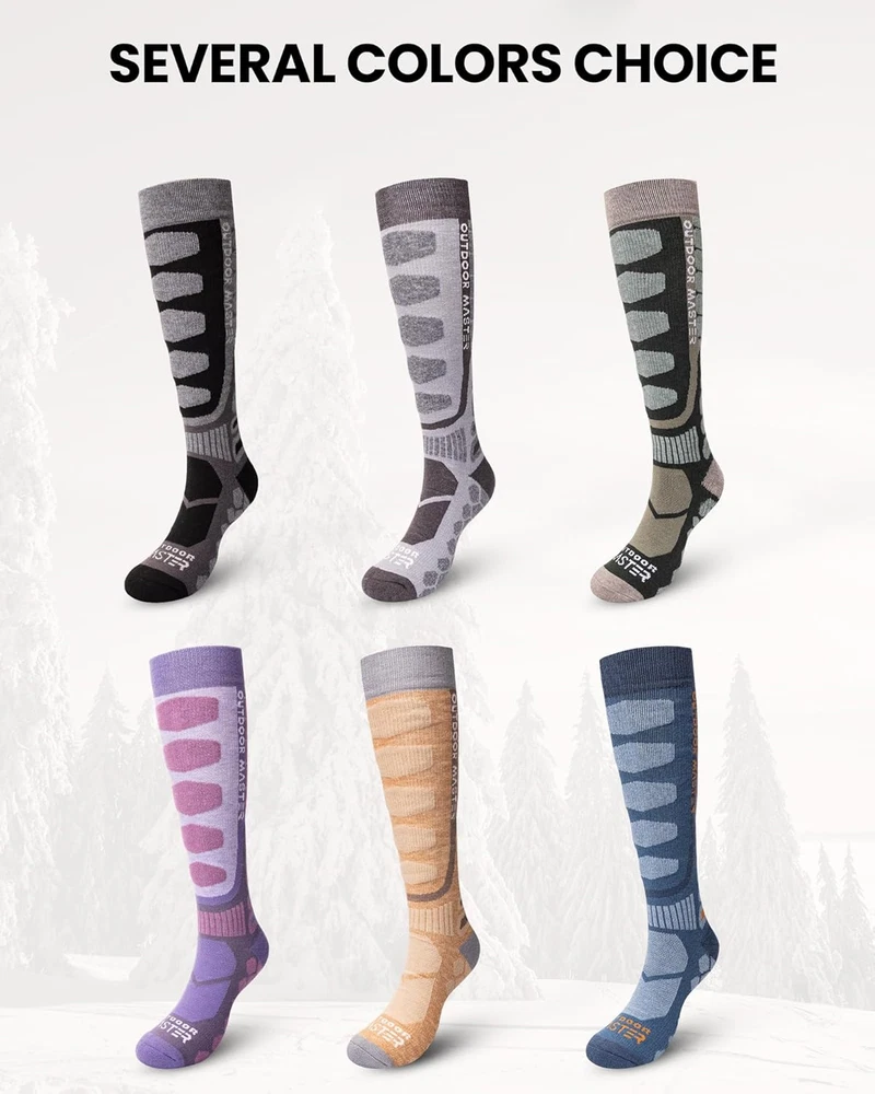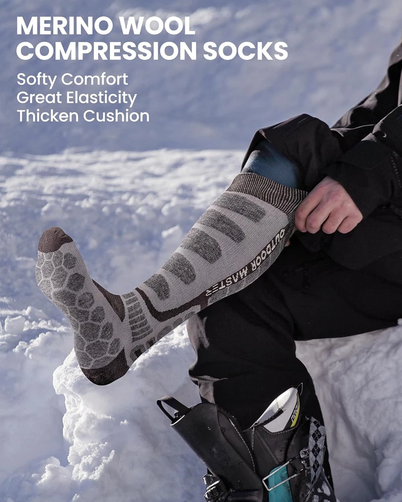 Merino Wool Imported Size: M(US MEN: 4-6.5/US WOMEN: 5.5-7.5), L(US MEN: 7-9.5/US WOMEN: 8-11), XL(US MEN: 10-13/US WOMEN: 11.5-14.5) BREATHABLE, WARM & COMFORTABLE - Made of 30% Merino Wool blend that is LIGHTWEIGHT, BREATHABLE and PREVENTS build-up of SMELL. It also helps keep feet dry due to moisture wicking properties and special breathable weaving technology. OVER CALF DESIGN & STAYS UP - High calf design & elasticity for the ULTIMATE COMFORTABLE FIT. Perfect for skiing, snowboarding and other snow sports. Equipped with NON-SLIP CUFF that ensures that the sock stays up. Socks slipping down in the boots is a thing of the past! COMPRESSIVE FUNCTION & Foot/CALF SUPPORT - Compression fuction provides a mild squeezing action to support enhanced Increase circulation. Thicken design for ankle/arch/achilles tendon offering more protection during outdoor sports. ITCH-FREE, MADE TO LAST, EASY TO WASH & BEAUTIFUL PACKAGE BAG - Have an itch-free time out in the snow with this high quality merino wool blend. And afterwards, enjoy great MACHINE WASHABLE quality that is made to last. The package bag makes them a perfect gift item! What You Get: OutdoorMaster 2/3 Pair of OutdoorMaster Ski Socks, our CUSTOMER-FAVORITE 6-month warranty and friendly customer service. Product Description MERINO WOOL & FULL COMPRESSION SKI SOCKS 1 2 3 4 5 6