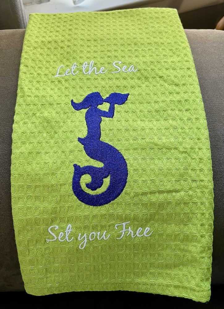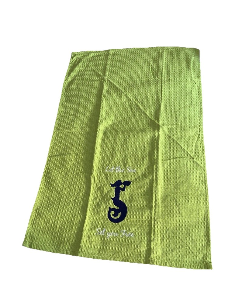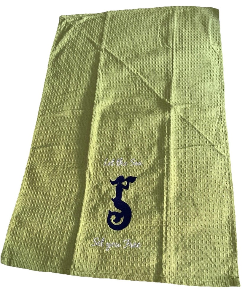 The Kay Dee Let the Sea Set You Free Mermaid Embroidered 100% Cotton Dish Towels Set of 2 is a charming addition to any kitchen. Featuring a waffle pattern and an embroidered mermaid design, these green kitchen towels are perfect for everyday use. Made from machine washable cotton, they are easy to care for and measure 27” x 18”, making them practical and stylish for any coastal nautical themed kitchen. New never used.