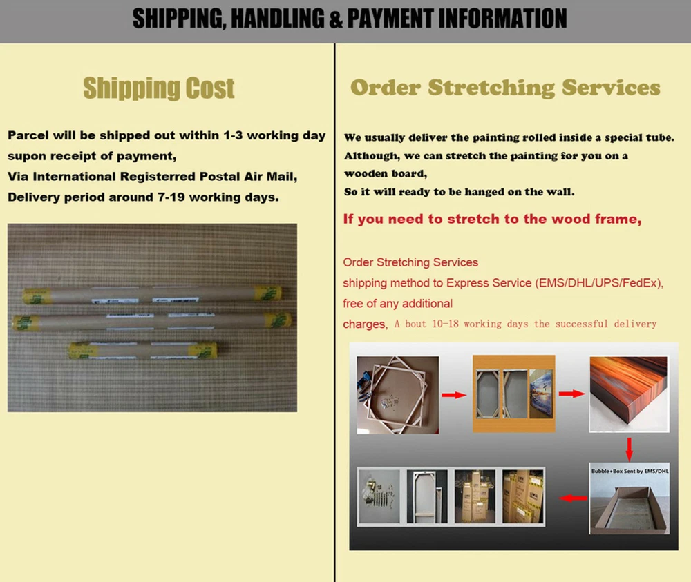 Store Home | New Arrival | Ending Soon | View Feedback | Add to Favourite | Contact us Store Categories Animal Landscape Fantasy Floral & Gardens Seascape Figures & Portraits Children & Infants Military & Political Architecture & Cityscape Western Travel & Transportation Abstract Animation Birds Celebrities & Musicians Food & Wine Holidays Insects Music & Instruments Nudes Religious & Inspirational Seasons Still Life Sports & Recreation Movie & Celebrities Other Why Buy From us Oil Painting Picture Printed On Canvas ITEMS DESCRIPTION: Unframed(Rolled canvas ,Only print) Rolled canvas are not stretched on a wood frame and will be rolled for shipping. They will not have a mirrored edge but we will add approximately 1.5 inches (4 centimeters) of white canvas on each side, which will allow customers to stretch it onto a wooden frame or easily mount it into a frame themselves. Framed(gallery wrapped), All Gallery Wrap canvas have mirrored edges - A mirrored edge copies the outer edge of an image to extend it without losing any of the original image. We'd like to explain that we usually use the term "gallery wrapped" to describe prints stretched onto wooden frames. This kind of frame is not an external or embedded metal or wooden frame but just stretching the print onto a wooden frame. We offer a range of high-quality prints that have been processed by professional designers to produce a result that closely resembles a hand-painted oil painting. These prints are created using advanced, high-quality printers on canvas, and after drying, we carefully apply a layer of three-dimensional gloss oil by hand to protect the image and enhance its texture, making it even more realistic and captivating. These prints will be a beautiful addition to your home or office, bringing a touch of artistic elegance to your living or working space. Our prints are high-quality works of art, providing you with a unique collectible value. Our prints are not DIY digital oil paintings, nor are they simple prints. They are high-quality reproductions that have been optimized for the best possible result. You can enjoy classic works of art in your home, and these prints can also serve as an important part of your home decor, adding an artistic atmosphere. We offer a range of different themes to choose from, suitable for various styles of home decoration. Please note that our prints are high-quality reproductions and, while the quality is excellent, they are not original hand-painted works. Stretch to the wood frame Stretch to the wood frame (EMS Priority Mail International Parcels) United States Stretch to the wood frame ( EMS Priority Mail Express International Shipping) United States Stretch to the wood frame ( EMS Priority Mail Express International Shipping)Other countries Shipping and Handling International Buyers – Please Note Return Policy Payment Free shipping to the world. Will usually ship within 1- 3 business days Delivery time to worldwide United States-----------7 to 15 business day United Kingdom-------7 to 12 business day Canada----------------- 7 to 15 business day Australia----------------- 7 to 15 business day French--------------------7 to 15 business day Israel--------------------- 7 to 15 business day Russian------------------7 to 18 business day Saudi Arabia-----------7 to 18 business day Ukraine-------------------7 to 15 business day Norway--------------------7 to 15 business day Austria--------------------7 to 15 business day Belgium--------------------7 to 15 business day Switzerland---------------7 to 15 business day Denmark-------------------7 to 15 business day Hungary-------------------7 to 15 business day Italy--------------------------7 to 15 business day Poland-----------------------7 to 15 business day Sweden-----------------------7 to 15 business day Finland-----------------------7 to 15 business day Ireland-----------------------7 to 15 business day Portugal---------------------7 to 15 business day Korea--------------------------7 to 15 business day Please noted : Import duties, taxes and charges are not included in the item price or shipping charges. These charges are the buyer responsibility. Please check with your country customs office to determine what these additional costs will be prior to bidding Attention:due to variation of monitor restrictions,the actual painting maybe a little different from the picture shows somtimes, please forgive it Shop with Confidence -100% SATISFACTION GUARANTEE or Prompt Full Refund. If the item arrives damaged or defective, or if it is not as described,you can return it to us by airmail within 30 days of receipt for an exchange or a full refund ,including your shipping and handling charges!!! 1.Lost Item: If item is not received due to shipping company or seller's fault (Seldom happens), buyer will get full refund (Item price + Shipping charge) or a replacement upon buyer's choice. 2.Damaged Item: If a damaged item is received due to reason of shipping process, weather, custom inspection etc., buyer should contact sellerand provide evidence of damage (a note from the carrier stating the damage and digital photos) within 7 days after receiving the item. Please check the item carefully before you sign your name, be sure to reject the item if damages is obviously to the carton/tube. Buyer will be able to qualify a full refund (Item price + Shipping charge) or a replacement only if buyer follow the instructions above. Seller has the right to keep the damaged item if it's in repairable condition, or buyer can get partial refund if buyer choose to repair the item. 3.Change Mind: If you want to return the painting for any other reason (e.g. changes mind), 20% re-stocking fee (apply to your full payment including shipping fee) will be charged, also item returned must be in original condition and within 7 days time frame after receiving. 4.Customized Order: Usually, we don't accept returned items for special order, such as customized in size, style, content, 