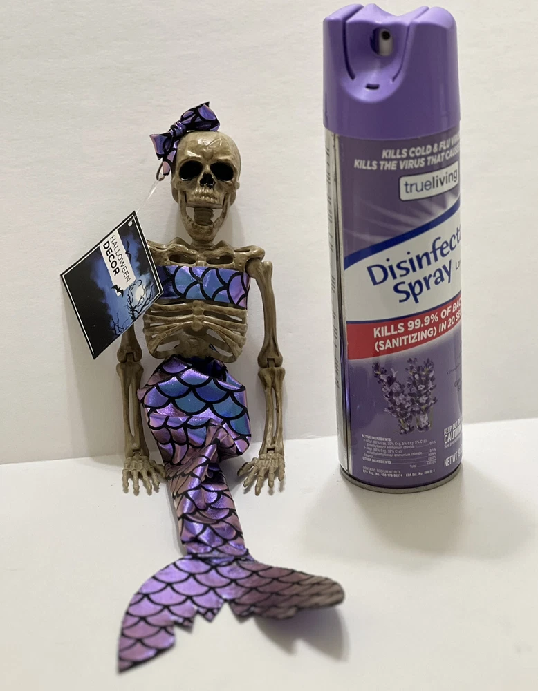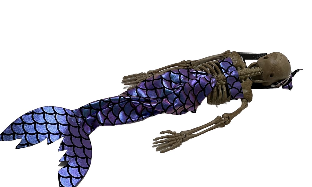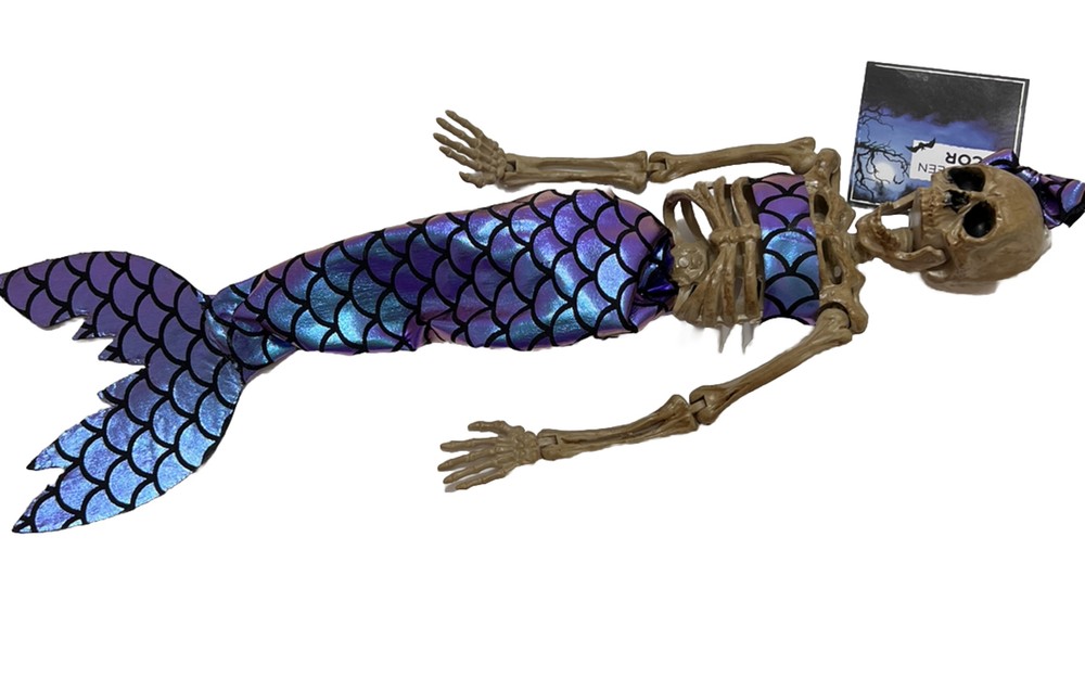 16” Mermaid Skeleton Dressed Hanging Decor Halloween Prop Flexible Articulated Joints and lower jaw can be positioned to open or closed. Hang in Any room with the hanger that is attached New with tag attached. Has not been displayed in the past. Picture with can is for size comparison only and the can is not included.
