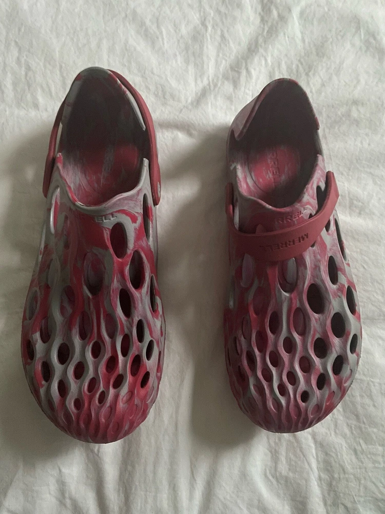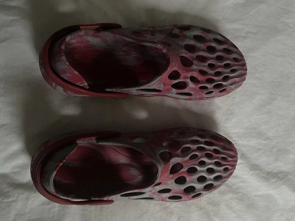 Merrell hydro pink and gray crocs. Womens size 10.5. Men’s size 9. Straps. Synthetic. Logo. Mint condition.