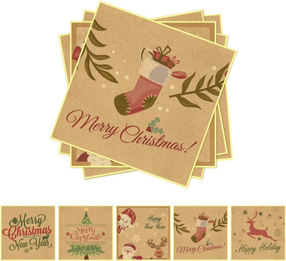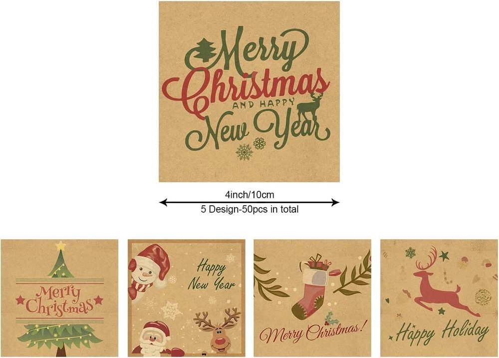 Merry Christmas Stickers Gift Tags Xmas Labels 4 x 4 Inch Natural Kraft Paper Product Details Brand: Meitaat Color: Natural Kraft Paper Material: Paper Occasion: Christmas Included Components: Sticker Theme: Christmas Cartoon Character: Christmas Number of Items: 1 Unit Count: 50.0 Count Product Dimensions: 4"L x 4"W x 4"H The size of the extra large kraft sticker is 4 x 4 inch, 5 differnt designs, 10 pieces stickers for each pattern, 50 pcs self-adhesive gift tags in total ; Easy to use and remove: Peel off the stickers and paste on flat surfaces, and removed without leaving residue; Durable to use: Made of premium vinyl, our kraft paper stickers are waterproof, scratch resistant, writable, and removable; Strong Adhesion: Our christmas stickers are great holiday decoration for christmas and new year, perfect for gift tags and present tags, they can stick firmly on all flat surfaces, such as presents, envelopes, gifts, christmas cards, jars, boxes and more; Widely Use: These christmas labels with vibrant colors are designed for business, packaging, sealing, holiday/party/christmas decorations.