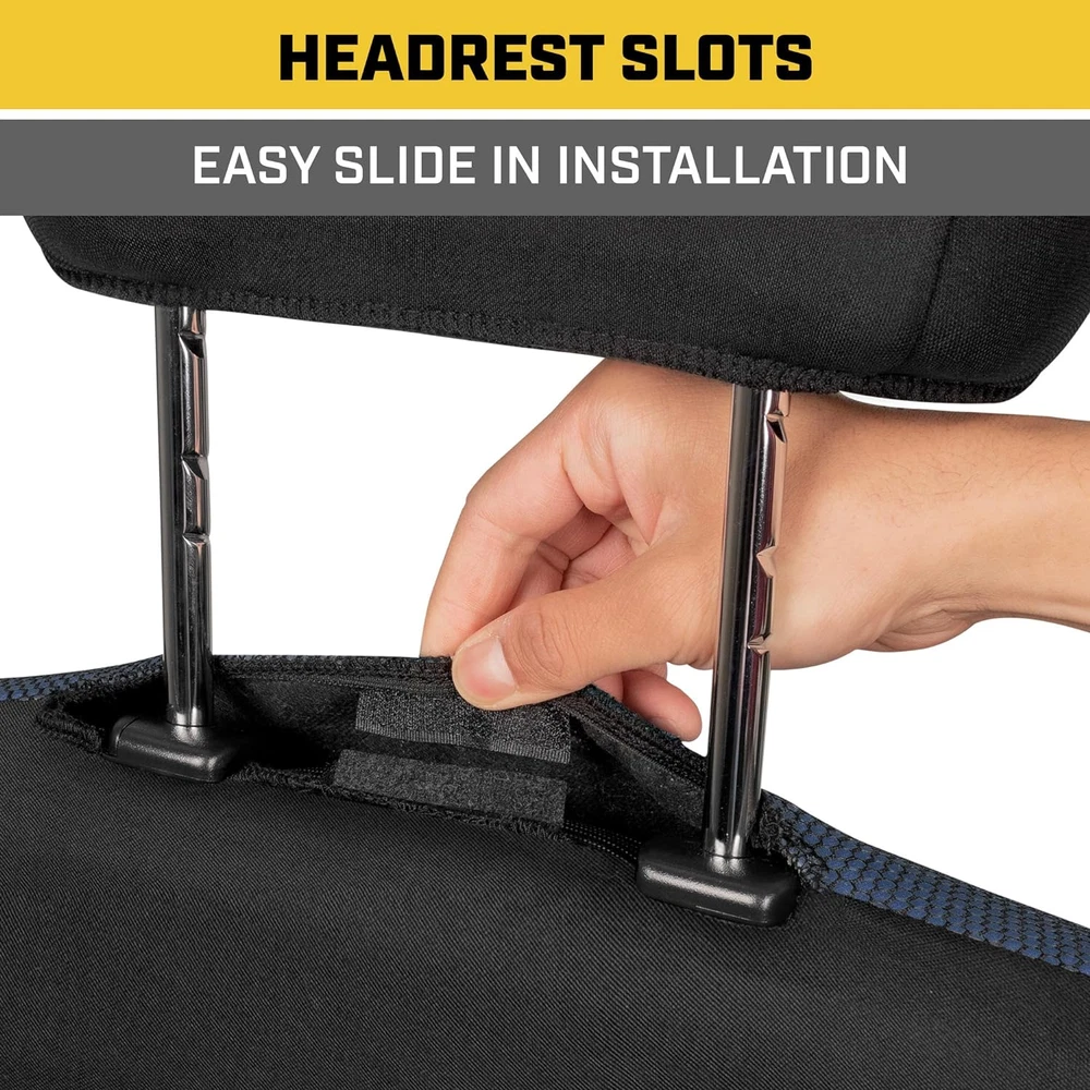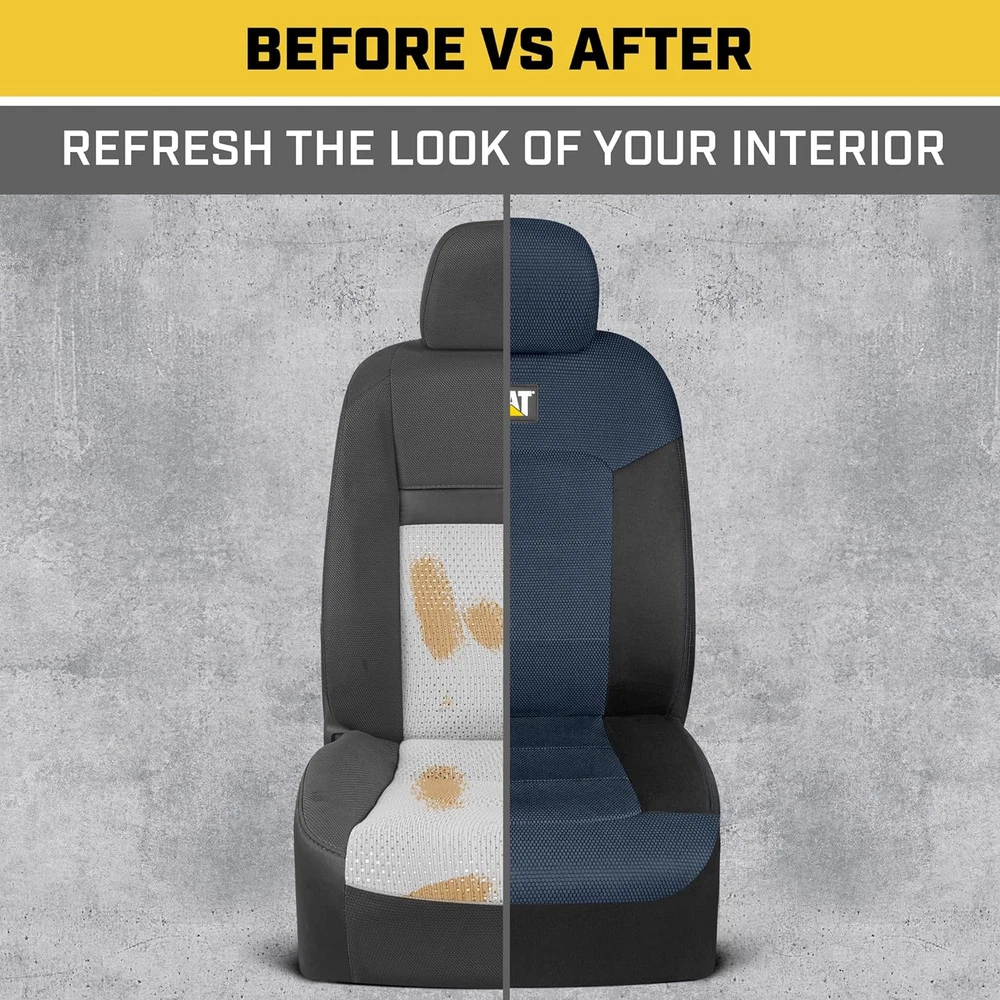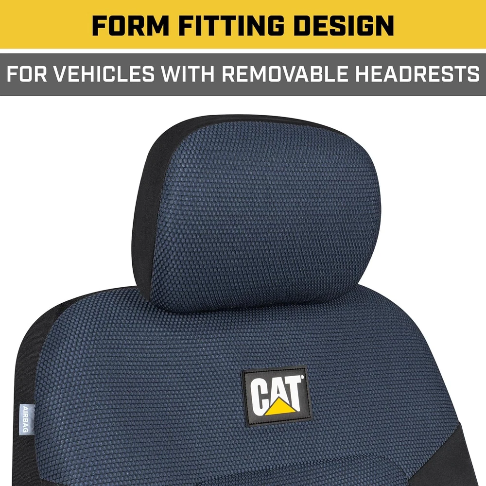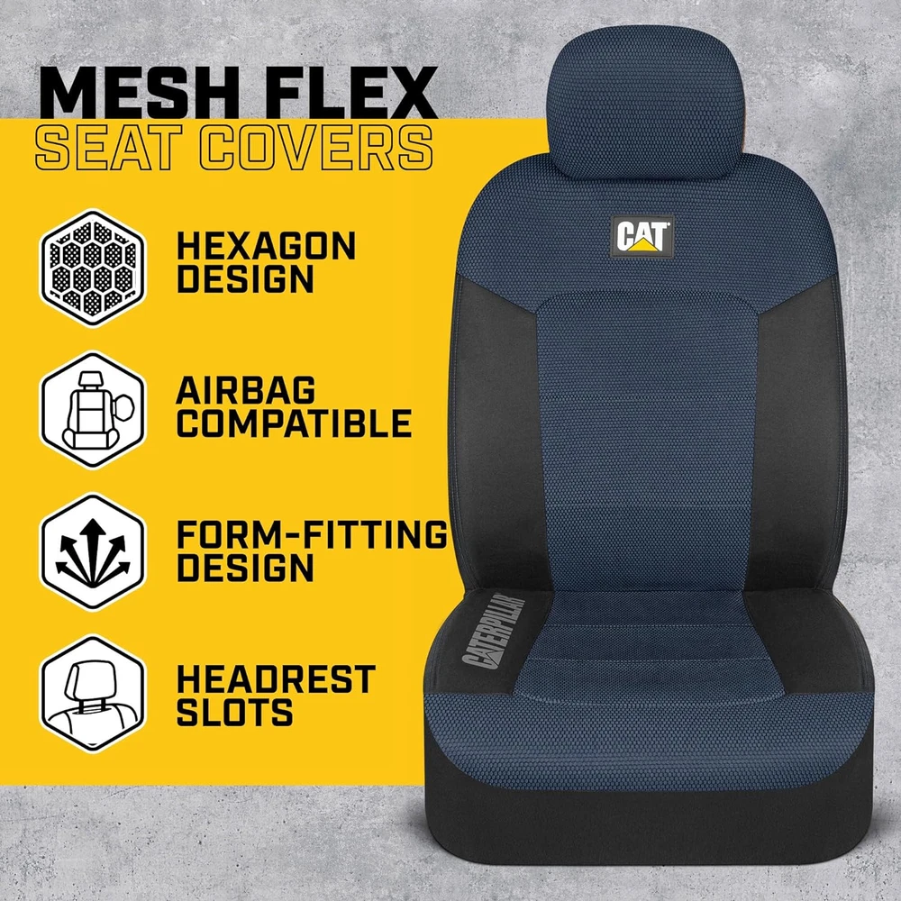 DURABLE PROTECTION – From the work site to your home base, Cat Car Seat Covers offers dependable protection against wear and tear for your automobile. The modern styling also helps to refresh the look of your interior by covering up old, worn-out seats. BREATHEABLE MESH – Specially-selected materials help to provide maximum comfort during your daily commute. The honeycomb mesh back and seat of our covers provide enhanced ventilation so that you stay cool and comfortable during your drive. FORM FITTING DESIGN – Cat Automotive Seat Covers are designed to fit most vehicles with removable headrests. Our form-fitting design conforms to the contours of your seats using anchor bars that are built into the covers themselves, providing a snug fit in nearly in vehicle. AIRBAG COMPATIBLE – We use a unique side stitching technique along the outside edge of each seat cover. This stitching is designed to release whenever the side airbag deploys to allow for interference-free operation of built-in safety features. EASY TO INSTALL – With a universal fit design and easy-to-follow installation image, our Cat Front Seat Covers can be setup in your vehicle within minutes. Please see our product images for fitment examples. Some additional work may be required to create a ‘perfect’ fit. Cat® MeshFlex Automotive Seat Covers for Cars Trucks and SUVs (Set of 2) – Black and Blue Car Seat Covers for Front Seats, Truck Seat Protectors with Comfortable Mesh Back, Auto Interior Covers