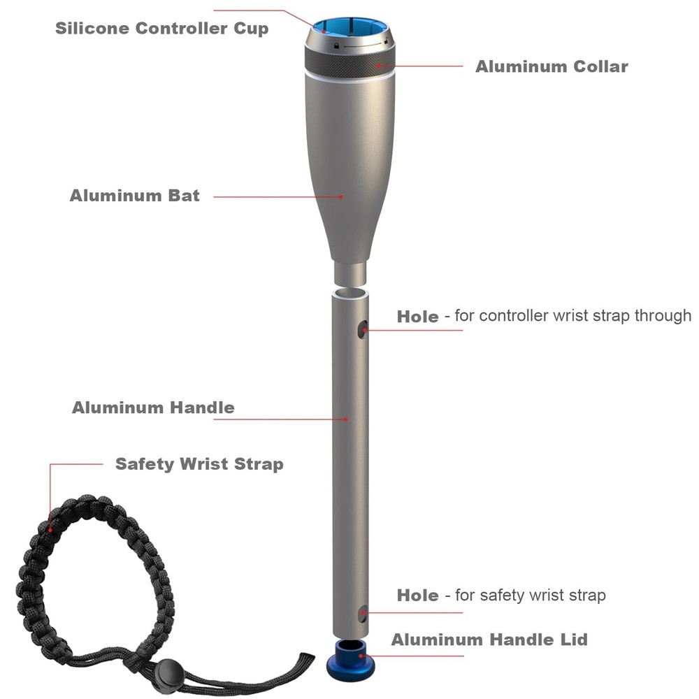 VR Baseball Bat Attachment for Meta Quest 3/ Quest 3S - Aluminum Short Baseball Bat Handle Accessory Compatible with Quest 3/3S/Pro for WIN Reality and Totally Baseball, iB Cricke IMMERSIVE: The YEZRO VR Baseball bat attachment is a baseball accessory that you can insert your Quest controller into to simulate a real Baseball bat. A SHORTENED BAT: Allows you to swing indoors more safely. The length of connect the controller is 16.7” length (Quest Controller is not included) Made of high quality aluminum for superior strength and perfect weight distribution. Built to be tough. Give you a balance feel with swing. VERSATILE: Combining this VR baseball bat attachment with baseball simulations like WIN Reality, Totally Baseball, iB Cricket will allow you to hit realistic pitches and train your plate discipline and timing at home! Compatible with Oculus (Meta) quest 3/2 & Pro. (Right or left controller) EASY TO INSTALL: Lock the controller by tighten the collar clockwise. Unlock the controller by whirl the collar counterclockwise. By default, WIN Reality places the virtual bat in your left Oculus controller, regardless of what side of the plate you hit. Because the virtual bat defaults to your left Oculus controller, you’ll want to strap your left Oculus controller to your bat.(NOTE: Before you begin to take swings inside VR, make sure you have a safe space to swing in.) SAFE: Locking mechanism holds the controller securely. Tie the controller lanyard to the handle for for double protection. The safety wrist strap prevents the bat from accidentally flying off your hands. Both these together safeguard the quest controllers from accidental damage and give you the freedom to play all your favorite shots with confidence.