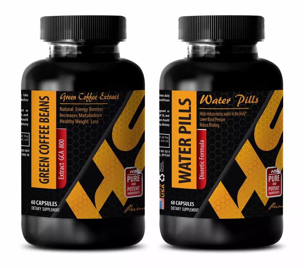GREEN COFFEE EXTRACT & WATER AWAY COMBO Endurance enhancer Normal blood pressure Improves the heart health Lose weight Stimulating muscle strength Providing the metabolic Energy Huge source of antioxidants Improving digestion Boosting Metabolism Helping you to burn fat Made In USA COMBO GREEN COFFEE EXTRACT – WATER AWAY COMBO While traditional black coffee is made from roasted coffee beans, green coffee beverages are made using the unroasted, or “green,” coffee beans. Extracts from green coffee beans have demonstrated many health benefits. The main components of green coffee responsible for these benefits appear to be caffeine and chlorogenic acid, a type of antioxidant. Our natural water away supplement is referred to as diuretics, help your body get rid of excess water and sodium. Water pills make your kidneys deposit more sodium into your urine. This herbal supplementation may increase the flow of your blood and relieves pressure in your arteries. Enhances exercise performance This herbal green coffee extract is also one of the supplements that may promote intensive workout. On the contrary, coffee and it’s battalion of goodness assists in dealing with physical fatigue thus allowing you a higher endurance margin. Caffeine is a performance as well as endurance enhancer. Not only does it help cope with fatigue but also strengthens contraction of striation muscles. It can increase fatty acid levels in the blood. Stabilizes blood pressure Potassium is helpful in reversing the role of sodium in unbalancing normal blood pressure. Thus, it acts as a component that maintains the normality of blood pressure in the human body. This further improves the heart health and regulate blood pressure levels. Regulation of blood pressure is one of the most important functions of this powerful mineral. As mentioned earlier, potassium has properties that work to relieve the tension of blood vessels, this putting the high blood pressure under control. Weight Loss Green coffee contains caffeine and other stimulating compounds, so it speeds up your Metabolism and can help you to lose weight. Regular consumption of this herbal supplement may be beneficial for suppressing appetite. This natural extract may maintain a healthy weight. Green coffee beans and their extract are useful as weight loss helps. Green coffee extracts can be helpful adjuncts to a well-balanced diet and exercise program for weight loss. Strengthens muscles One of the most useful benefits of potassium is its role in ensuring the proper growth of muscle tissues and the utilization of Energy released during Metabolism, which adds significantly to muscular strength. The muscles, including those all-important cardiac muscles. Stimulating muscle strength and providing the metabolic Energy to do so is an important function of potassium, and muscular health would be compromised without it. Also, without the contractions and relaxations that potassium allows muscles to perform, exercise and additional muscle training would be impossible. Sources of Antioxidants Believe it or not, green coffee extract has a lot of nutritional value. It contains a number of essential nutrients, including riboflavin, pantothenic acid, manganese, potassium, magnesium and niacin. It’s also a huge source of antioxidants, and one of the top sources of antioxidants in the diet. Antioxidants are substances that prevent or delay aging, and they can control how fast you age. Our natural green coffee extract is a herbal source of antioxidants and nutrients. Boosts Metabolism Potassium assists in the metabolic processing of various nutrients like fats and carbohydrates. Thus, potassium is of a great value in extracting the Energy from nutrients that are consumed. Water away supplements is also integral in the function of proteins, which have an impact on tissue regeneration, and an overall balanced Metabolism. Together with green coffee extract this supplement may be beneficial for boosting Metabolism, improving digestion as well as helping you to burn fat. Improve heart health If you take the green coffee on regular basis your blood pressure will likely rise temporarily. This green coffee may actually lower blood pressure when consumed on a regular basis. Drinking our herbal supplement with green coffee regulate cholesterol levels. Green coffee might be beneficial for the health of your blood vessels and heart. Coffee also promotes cardiovascular function and entire body health. Supplement Facts Serving Size: 1 Veggie Capsule Servings Per Container: 60 Proprietary GCBE-800™ Extract 800 mg Green Coffee Bean Extract, GCA® (less than 5% caffeine) (50% chlorogenic acids) Other Ingredients: Vegetable Cellulose (Veggie Cap) GCA® is a registered trademark of Applied Food Sciences, LLC. SUGGESTED USE: As a dietary supplement, take one (1) veggie capsule twice daily 30 minutes before meals with an 8 oz. glass of water. CAUTION: Do not exceed recommended dose. Pregnant or nursing mothers, children under the age of 18, and individuals with a known medical condition should consult a physician before using this or any dietary supplement. Supplement Facts Serving Size: 1 Capsule Amount Per Container: 60 Vitamin B-6 (pyridoxine hydrochloride) 25mg 1250% Potassium (as potassium chloride) 25mg <1% Chloride (as potassium chloride) 23mg <1% Dandelion (4:1 concentrate) 225mg * Green Tea (50% extract) 100mg * Cranberry (30% extract / powder) 75mg * Juniper Berry (4:1 concentrate) 50mg * Bucchu Leaves (4:1 concentrate) 50mg * Apple Cider Vinegar (35% extract) 50mg * Corn Silk (herb powder) 25mg * Paprika (herb powder) 25mg * Watermelon (herb powder) 25mg * OTHER INGREDIENTS: Gelatin (bovine), silicon dioxide and vegetable magnesium stearate. Helps reduce excess water in the body* SUGGESTED USE: 1 capsule taken 1to 2 times daily preferably with meals or as directed by a healthcare professional. KEEP OUT OF THE REACH OF CHILDREN. DO NOT USE IF SAFETY SEAL IS DAMAGED OR MISSING. STORE IN