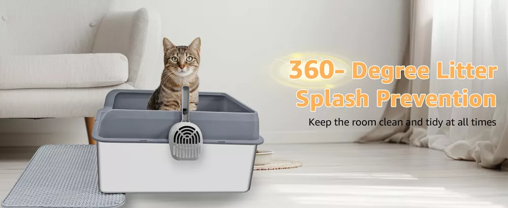 Metal Cat Litter Box Stainless Steel High Sided Open Top with Scoop, XL, Grey
