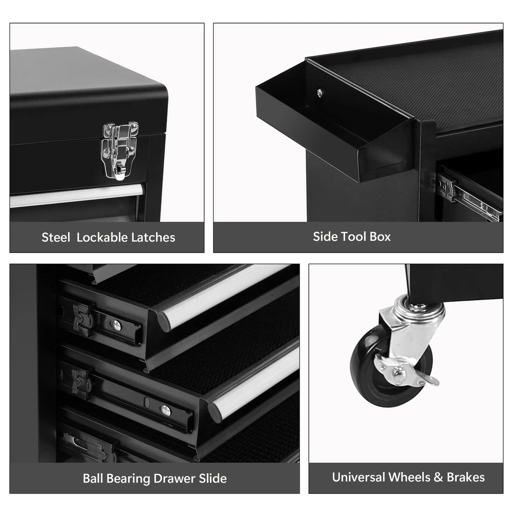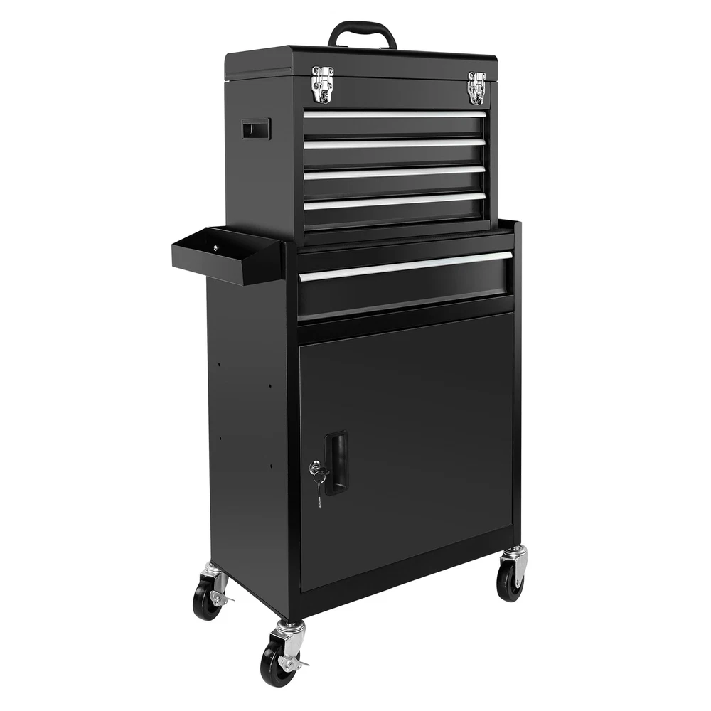 Specification Product Information Item Code:W1239P176618 Product Type:General Item Product Name:Rolling Garage Workshop Organizer Detachable 5 Drawer Tool Chest with Large Storage Cabinet, Detachable Tool Box Organizer Black Main Color:Black Main Material:Steel Product Dimensions Assembled Length (in.):20.70 Assembled Width (in.):11.00 Assembled Height (in.):41.10 Weight (lbs.):38.10 Package Size Length (in.):23.80 Width (in.):13.60 Height (in.):31.90 Weight (lbs.):47.20 Product Features LARGE CAPACITY FOR TOOL STORAGE. The top tray, 5 drawers, large bottom cabinet, side tool box provide ample storage space for various tools such as screwdrivers, spanners, boxes, etc. The inner side of the bottom cabinet's door is designed with grid and it comes with easy to 4 removable hang hooks to help you find tools quickly. 2-IN-1 DESIGN WITH DETACHABLE TOOL BOX. The tool cabinet can be separated into a 4-drawer tool box and a rolling tool cabinet, which can be used separately or together according to your needs. Besides, the top tool box can also be stored inside the bottom cabinet to save space. We also provide you with 7 storage boxes. SECURE LOCKING SYSTEM & PROTECTIVE LINER. Two locking bars help to lock all drawers, tool tray and the bottom cabinet, and the locking buckle adds extra security. Meanwhile the top tool tray and 5 drawers have protective liners to prevent scratches and damage to tools. UNIVERSAL & LOCKABLE WHEELS. 4 universal wheels make it easy to move the rolling tool chest around. What's more, 2 of the wheels are lockable to ensure that the tool box stays in place. STURDY CONSTRUCTION. Constructed of heavy-duty steel material, the sliding tool organizer has strong load-bearing capacity and excellent durability for long lasting use. In addition, the protective liner protects tools from scratches. Description