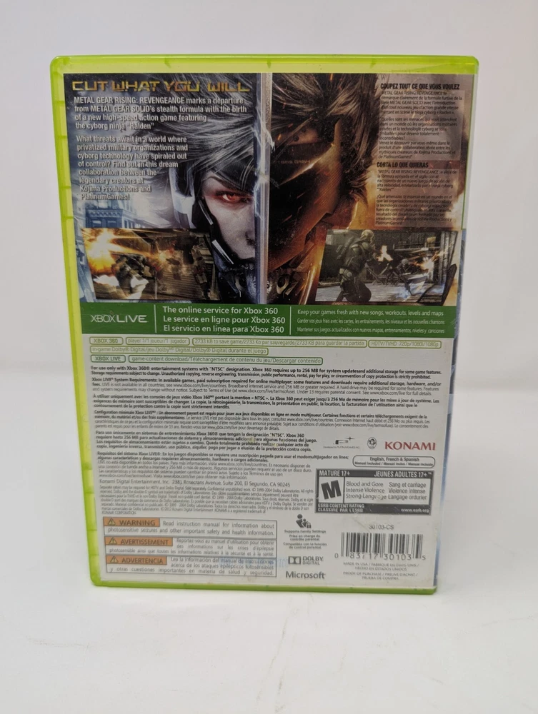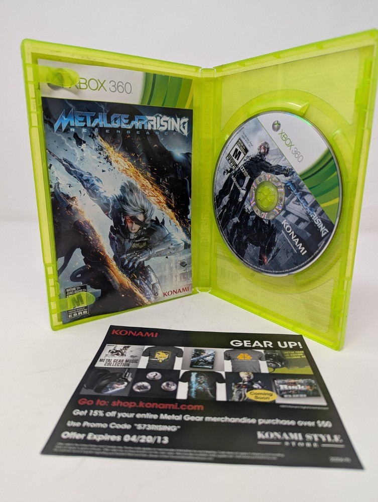Moderate scratching on disc. Sticker residue on case. Some brown grime on top of case. The product is "Metal Gear Rising: Revengeance" for the Microsoft Xbox 360, released in 2013. This action and adventure game is part of the Metal Gear Series published by Konami. It is rated M for Mature audiences. The game features a manual and offers players an immersive gaming experience within the Metal Gear universe.