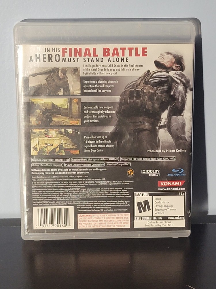 Publisher:KonamiGame Name:Metal Gear Solid 4: Guns of the PatriotsPlatform:Sony PlayStation 3Release Year:2008UPC:0083717201601Rating:M - MatureVideo Game Series:Metal Gear Seriesgtin13:0083717201601Genre:Action & AdventureFeatures:Travel to the Middle East, South America, and other international locales while tracking the evil Liquid Ocelot Use new gadgets like the "Solid Eye" and "OctoCamo" suit to avoid detection from armed guards Features online suppMPN:6RU5HLPNRQCK