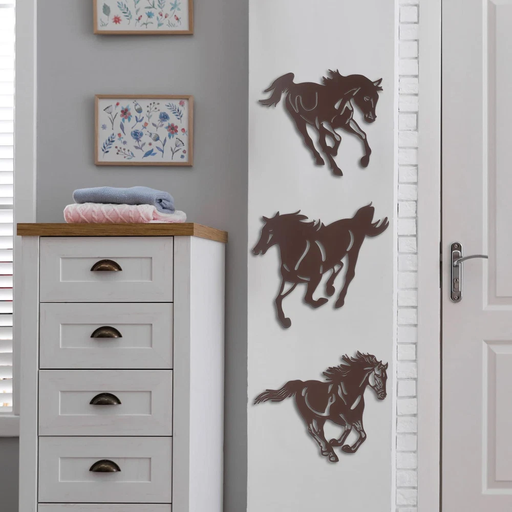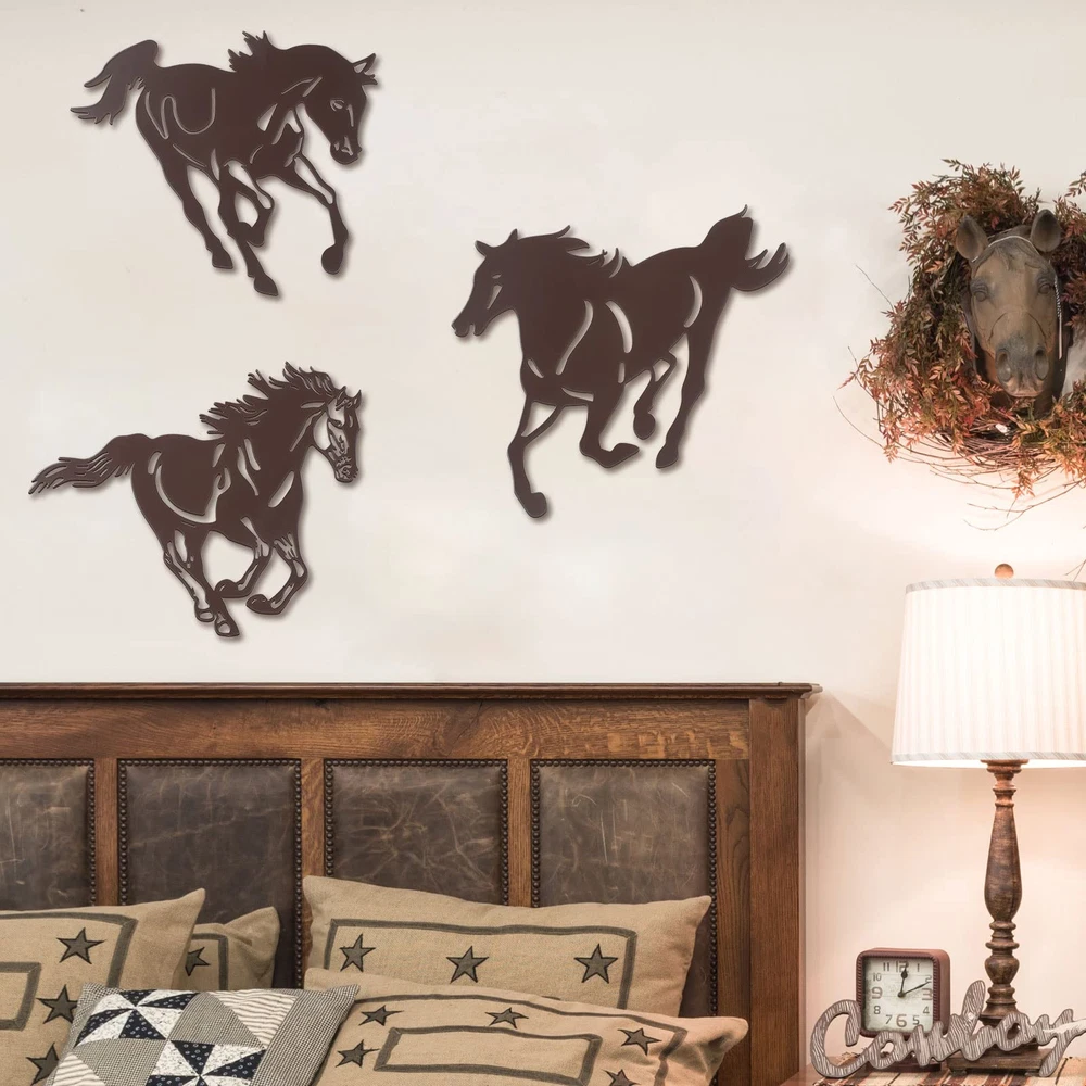 Features: Easy to hang and match: These metal horse decorations for wall have hooks on the back, which can be easily hung on the wall and can be matched well with your home style, whether your home is retro or modern style. Sweet gift: You can give these western horse wall decors as nice housewarming, birthday or festival gifts to your family, friends, or other people who love horse, readily enhancing relationship. Specifications: Material: metal Color: dark brown Size: approx. 9.2 x 8.5 inches Package includes: 3 x Metal horse rustic wall decors Notes: Manual measurement, please allow slight errors on size. The color may exist a slight difference due to different screen displays. Classic design: with flying whips and strong limbs, these 3 different horses on the metal western wall decor come running towards you, with rustic style and fine workmanship, classic and vivid, improving your overall decoration of your house Quality metal: each metal horse wall sculpture is made of metal material, strong and sturdy, reliable and reusable, not easy to deform and rust, with exquisite laser cutting technology to make them look lifelike, giving you a pleasant use experience Appropriate Size: these 3 metal galloping horses wall arts are with a similar size, about 9.2 x 8.5 inches, conspicuous enough for you to decorate your wall and get attention, giving your room an elegant look 3D shadow: when these metal galloping horses wall arts are decorated on the wall, some natural shadows can be displayed on the wall, making themselves look more three dimensional, just like running in the wind Wide Occasion: the horses western metal silhouette is suitable for various occasions, such as such as cabin, bedroom, living room, office, porch, garage, kitchen, garden, yard and more, a nice ornament to show your taste and brighten up your world