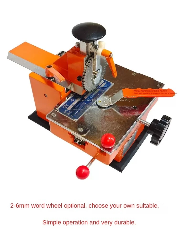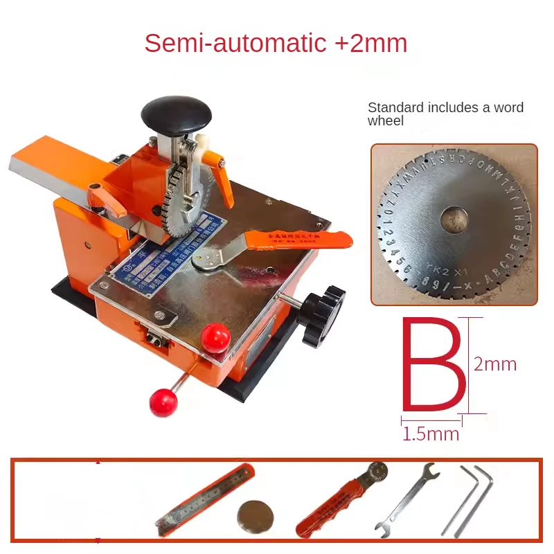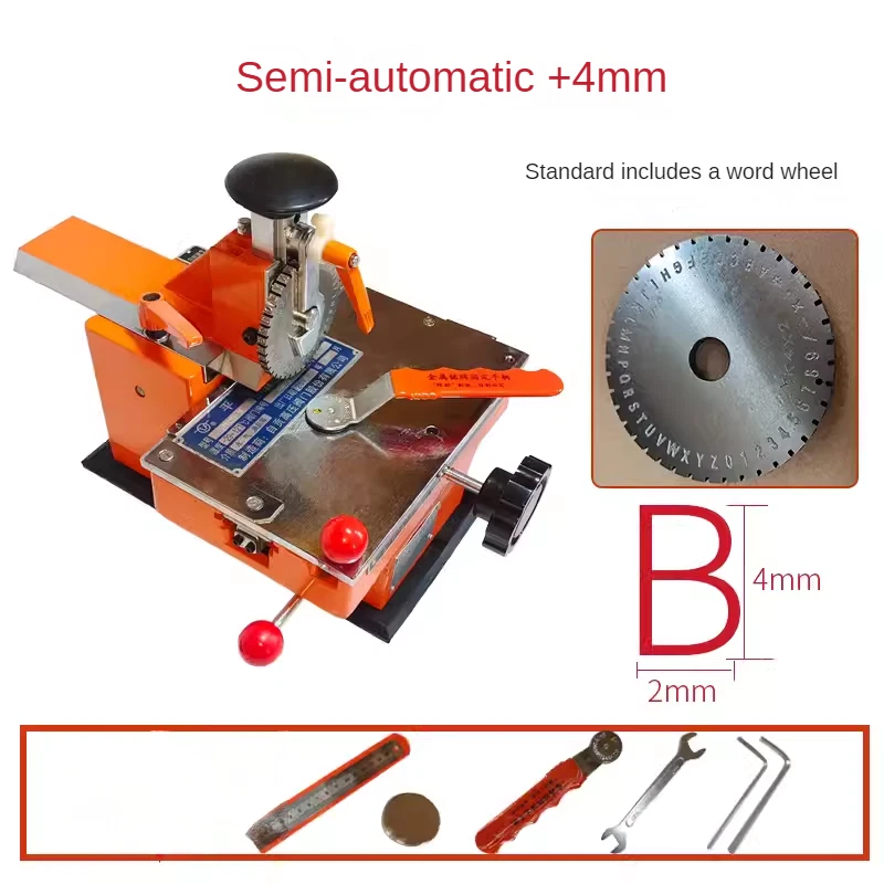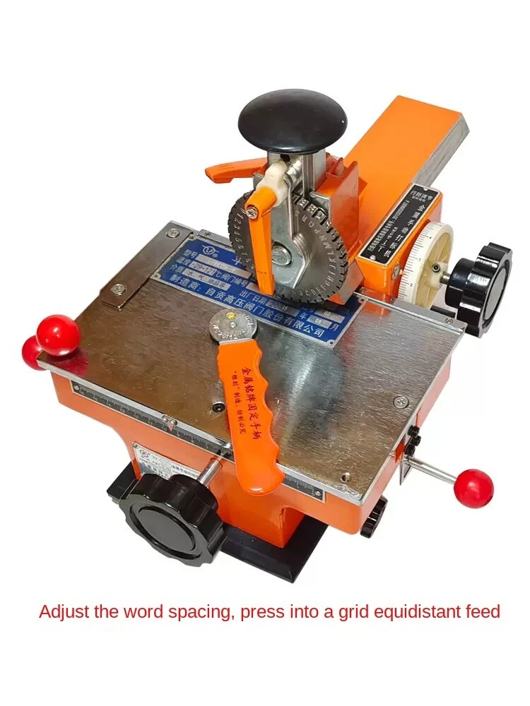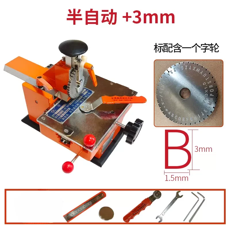 Product parameters 3D dimension: 320mm*285mm*270mm Marking area: 180mm*135mm Marking depth: 0.1-0.3mm Print content: numbers, letters, simple symbols Word height selection: 2, 2.5, 3, 4, 5, 6mm Power supply: No Kerning: Supported (equidistant adjustment) Material of wheel: high-quality mold steel (12CrMO #) Marking speed: 2-4 words/10 seconds Scope of application: Marking of metal nameplates such as aluminum and copper alloy plates