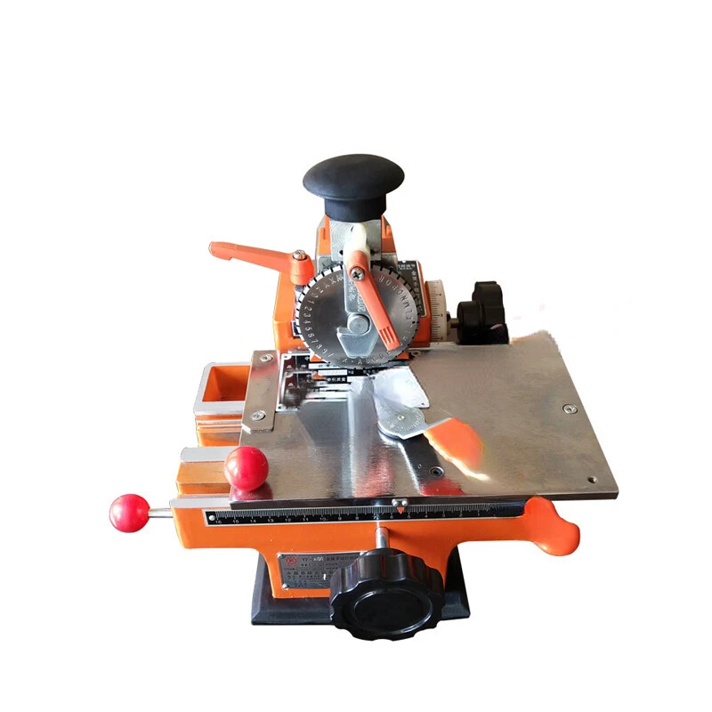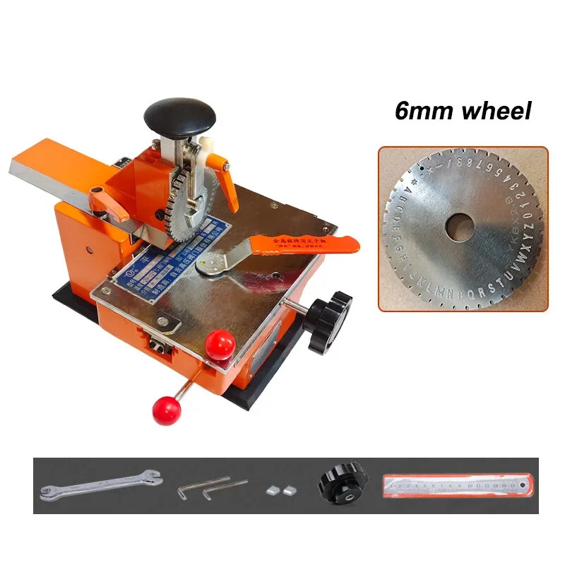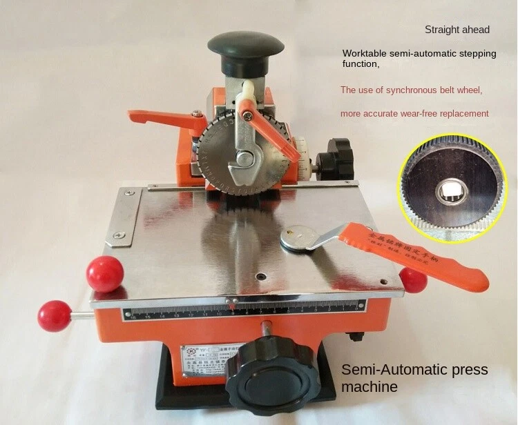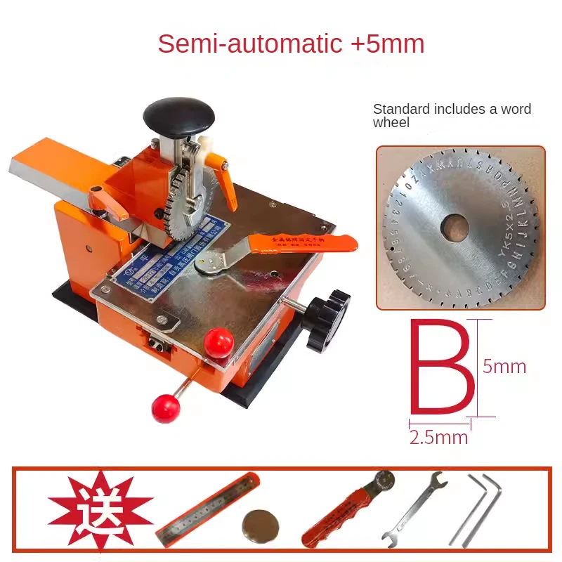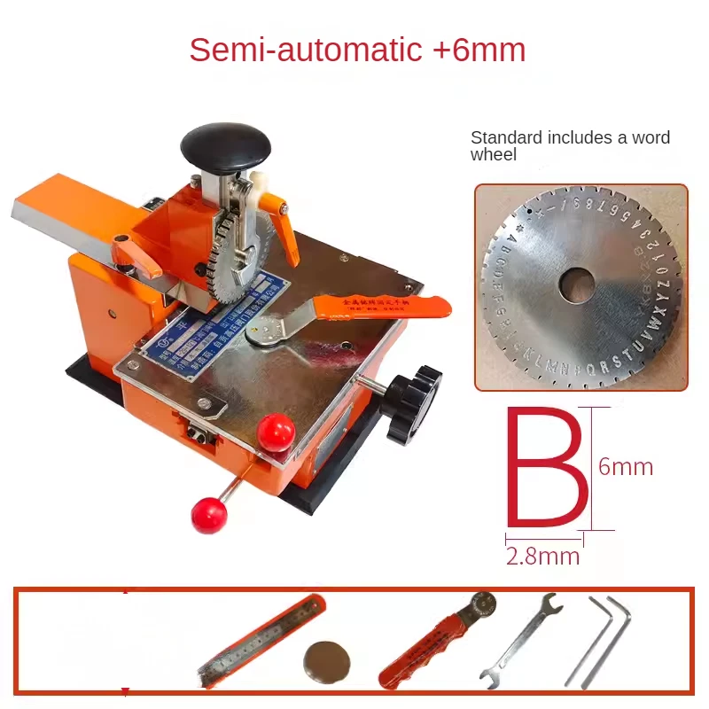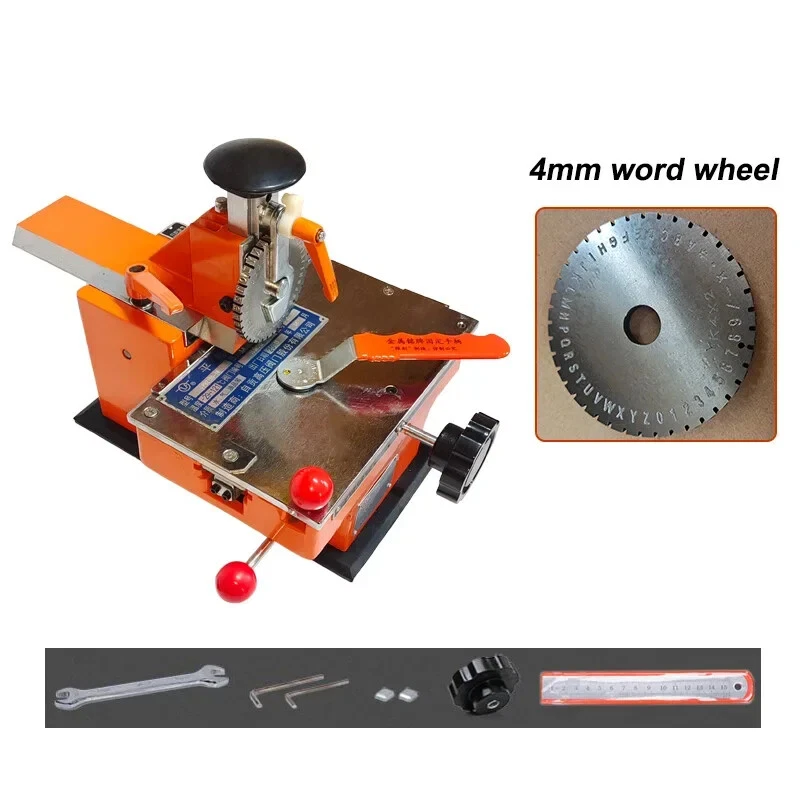 Product parameters 3D dimension: 320mm*285mm*270mm Marking area: 180mm*135mm Marking depth: 0.1-0.3mm Print content: numbers, letters, simple symbols Word height selection: 2, 2.5, 3, 4, 5, 6mm Power supply: No Kerning: Supported (equidistant adjustment) Material of wheel: high-quality mold steel (12CrMO #) Marking speed: 2-4 words/10 seconds Scope of application: Marking of metal nameplates such as aluminum and copper alloy plates