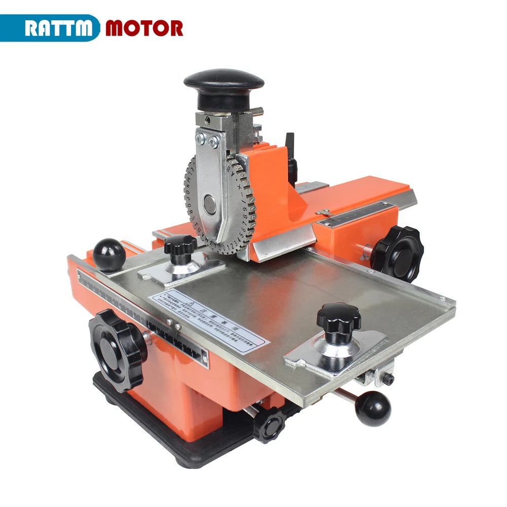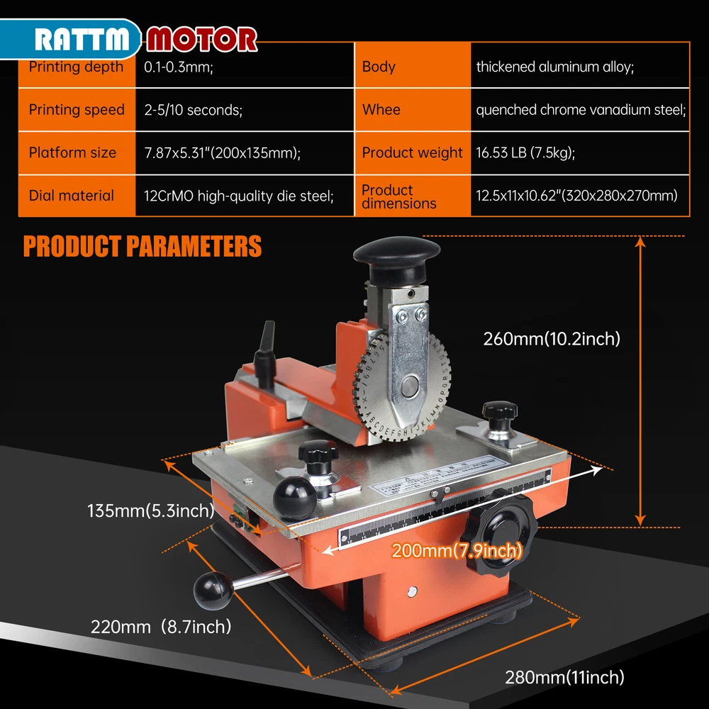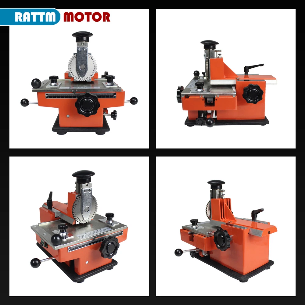 Metal Nameplate Marking Machine Semi-Automatic Stamping Metal Steel Tag Embosser Good News We have USA Warehouse in United States,so we will ship this product from USA Warehouse to you. Package Included: 1 x Semi-automatic Metal Embossing Machine (with No.3 or No.4 Codeword Plate) 3mm: ♞【Parameters】Printing depth: 0.1-0.3mm;Printing speed: 2-5/10 seconds; Platform size: 7.87x5.31"(200x135mm); Dial material: 12CrMO high-quality die steel; Body:thickened aluminum alloy; Wheel: quenched chrome vanadium steel; Product weight: 16.53 LB (7.5kg); Product dimensions: 12.5x11x10.62"(320x280x270mm) ♞【Suitable materials】Copper, aluminum, stainless steel signs,PVC cards etc; Plate thickness: 0-7mm; Supported content: uppercase letters,numbers,simple symbols; Font height: 3mm; Label thickness: 0-0.27 "(0-7mm);Font type: Line type ♞【Character wheel】This nameplate stamping machine comes with one character wheel. Each wheel consists of 40 characters: 26 uppercase letters on wheel: ABCDEFGHIJKLMNOPQRSTUVWXYZ; 10 numbers on wheel: 1234567890; 4 common symbols: · × / - ♞【How to choose the character wheel】The size of the wheel means the height of the printed character, such as the character height printed by No.3 character wheel is 0.12"(3mm),No.4 character wheel is 0.16"(4mm).The principle is to use alloy steel lettering wheels that have undergone high-frequency quenching and heat treatment. Under the action of external force (hand pressure or rubber hammer), letters or numerical symbols of a certain depth (0.1-0.3mm deep) will be carved on the metal plate. ♞【Usage】Metal signs engraved on the changed parameters: such as specific model, date, batch number, serial number, serial number etc.Typical application:All kinds of aluminum, copper, stainless steel, plastic nameplates on machinery,electromechanics, water pumps, valves, automobiles and motorcycles, and electrical appliances. 4mm: ♞【Parameters】Printing depth: 0.1-0.3mm;Printing speed: 2-5/10 seconds; Platform size: 7.87x5.31"(200x135mm); Dial material: 12CrMO high-quality die steel; Body:thickened aluminum alloy; Wheel: quenched chrome vanadium steel; Product weight: 16.53 LB (7.5kg); Product dimensions: 12.5x11x10.62"(320x280x270mm) ♞【Suitable materials】Copper, aluminum, stainless steel signs,PVC cards etc; Plate thickness: 0-7mm; Supported content: uppercase letters,numbers,simple symbols; Font height: 3mm; Label thickness: 0-0.27 "(0-7mm);Font type: Line type ♞【Character wheel】This nameplate stamping machine comes with one character wheel. Each wheel consists of 40 characters: 26 uppercase letters on wheel: ABCDEFGHIJKLMNOPQRSTUVWXYZ; 10 numbers on wheel: 1234567890; 4 common symbols: · × / - ♞【How to choose the character wheel】The size of the wheel means the height of the printed character, such as the character height printed by No.3 character wheel is 0.12"(3mm),No.4 character wheel is 0.16"(4mm).The principle is to use alloy steel lettering wheels that have undergone high-frequency quenching and heat treatment. Under the action of external force (hand pressure or rubber hammer), letters or numerical symbols of a certain depth (0.1-0.3mm deep) will be carved on the metal plate. ♞【Usage】Metal signs engraved on the changed parameters: such as specific model, date, batch number, serial number, serial number etc.Typical application:All kinds of aluminum, copper, stainless steel, plastic nameplates on machinery,electromechanics, water pumps, valves, automobiles and motorcycles, and electrical appliances. Product Description Technical Specifications: Tag Material: Copper,aluminum, stainless steel signs,PVC cards etc Plate thickness: 0-7mm (0-0.275 inch) Maximum Label Size: 180x135mm (7.08x5.31 inch) Printing depth: 0.1-0.3mm (0.004-0.012 inch) Printing speed: 2-5/10 seconds Platform size: 200x135mm (7.87x5.31 inch) Dial material: 12CrMO high-quality die steel Body:thickened aluminum alloy Wheel: quenched chrome vanadium steel Product weight: 16.53 LB (7.5kg) Product dimensions: 12.5x11x10.62 inch (320x280x270mm) No.3 Codeword Plate Character Height and Width: 3.0mm (0.118 inch)--3mmx1.6mm (0.12x0.06 inch) (Suitable for a square within 5-6 mm height) Letters Contained: A to Z Numbers 0 to 9 Characters: . X / - No.4 Codeword Plate Character Height and Width: 4.0mm (0.157 inch)--4mm x 2.1mm (0.157x0.082 inch) Suitable for a square within 6-7mm(0.23-0.27inch) height) Letters Contained: A to Z Numbers 0 to 9 Characters: . X / - Instructions for use: 1.The placing of signs methods, Signs placed in the work surface as shown upper left corner, with the signs and magnet clip without compression plate loosening. 2.Wheel loading and unloading, first used the word wheel wrench to remove the wheel nuts, and selected the right wheel, wheel lock fitted to the nut, aligned pointer. 3.Print, and start position adjustment, good signs placed to separate the clutch, turn the hand wheel spacing and kerning hand wheel so that wheel aligned characters printed on the box location just above the lock extension units, release the clutch lever, under pressure for a few kerning feed handles can be seen feeding on the caliper spacing density (hand wheel with a good tune kerning) depress the clutch, turn the hand wheel, release the clutch lever back in situ, with the palm of your hand slap of rubber parts, spacing after the feed handle pressure, to achieve printing. Widely application: Metal signs engraved on the changed parameters: such as specific model, date, batch number, serial number, serial number etc. Typical application:All kinds of aluminum, copper, stainless steel, plastic nameplates on machinery,electromechanics, water pumps, valves, automobiles and motorcycles, and electrical appliances. Feedback: We maintain hightest buyer ratings > Positive Feedback will be much appreciated from you. > Any dissatisfaction,please contact us immediately! > Please do not leave neutral or negative feedback before we help you 
