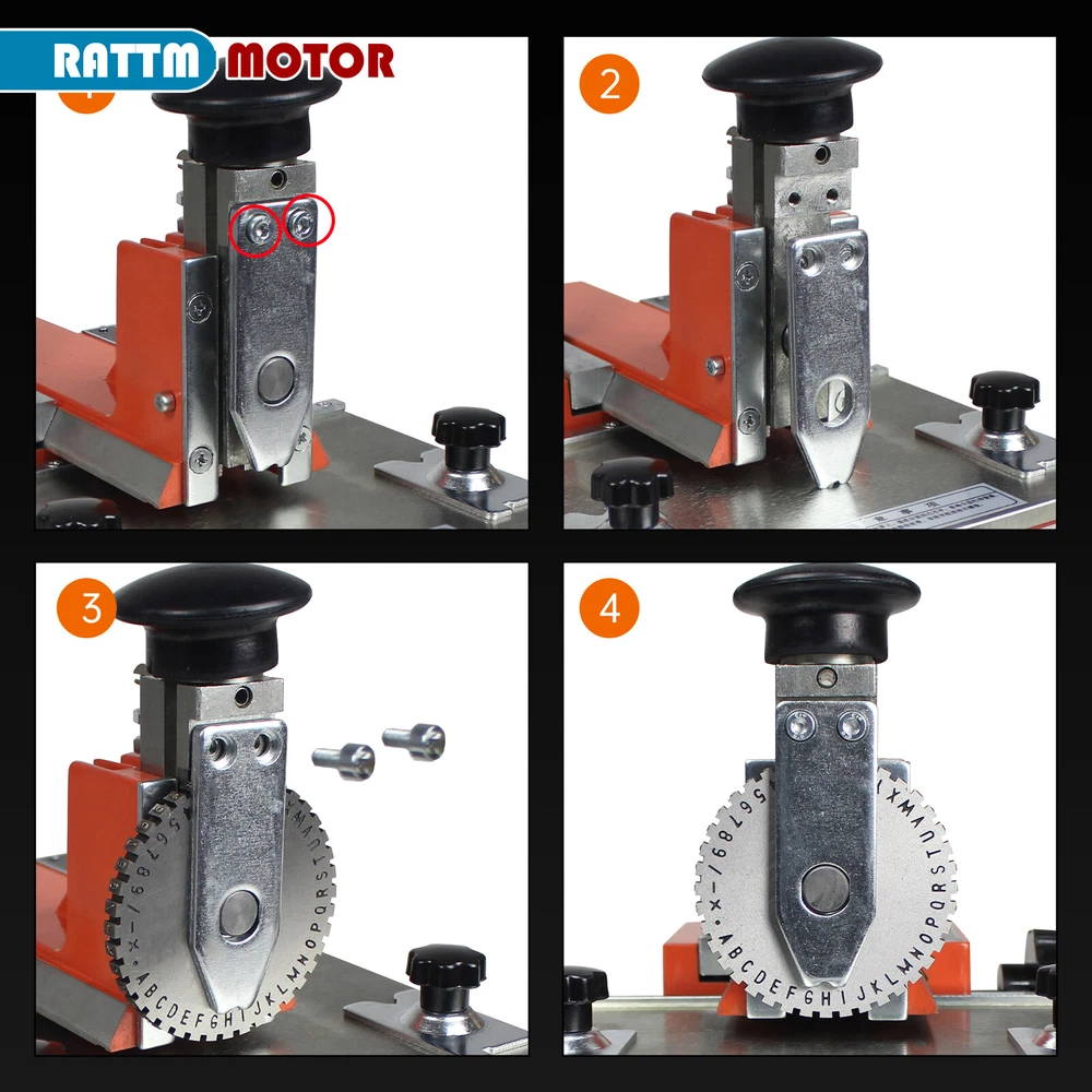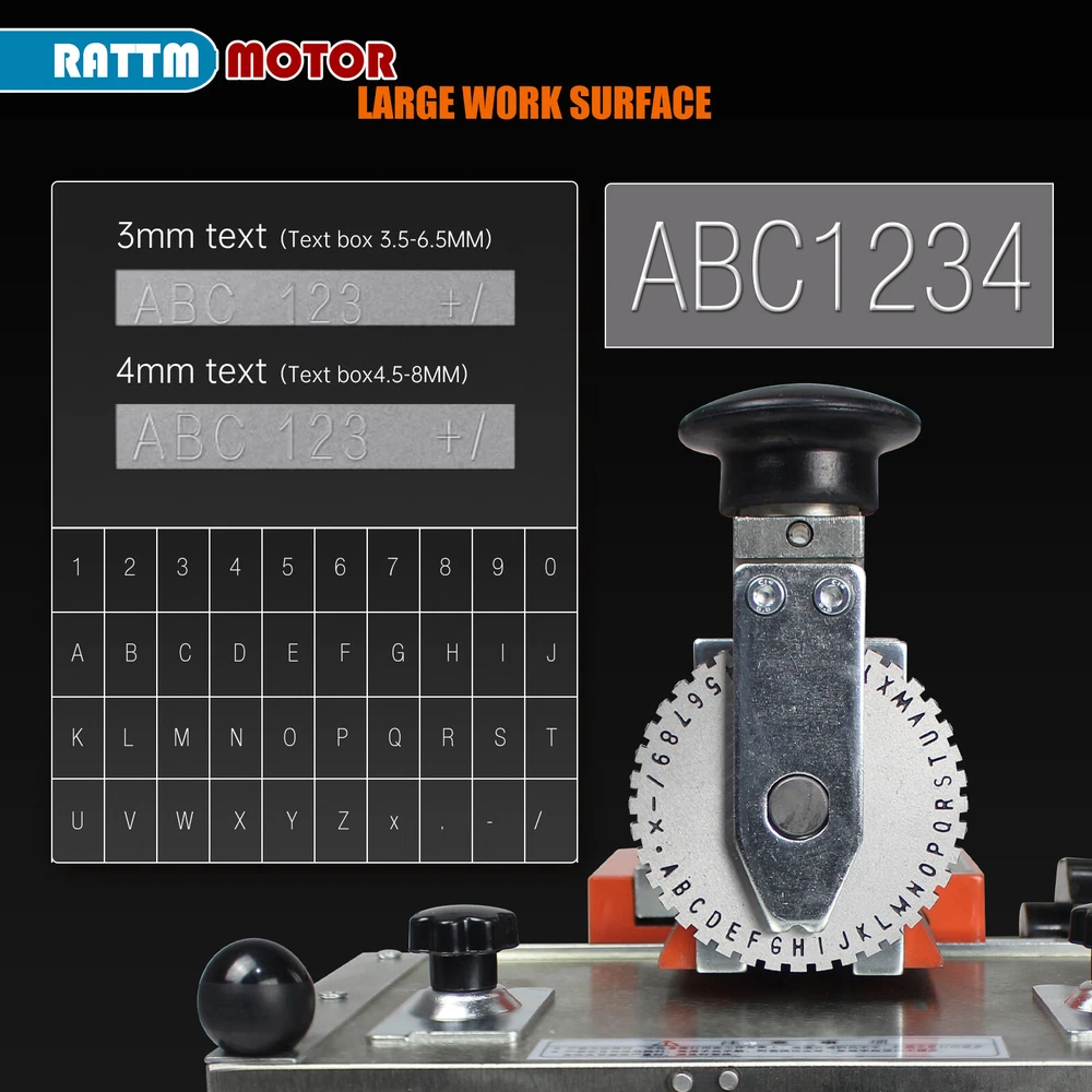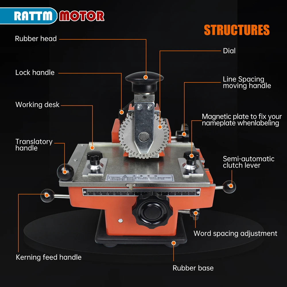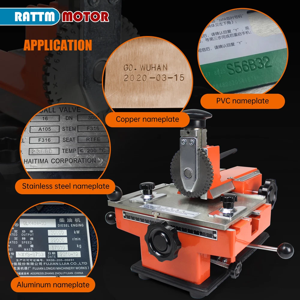 Metal Nameplate Marking Machine Semi-Automatic Stamping Metal Steel Tag Embosser Good News We have USA Warehouse in United States,so we will ship this product from USA Warehouse to you. Package Included: 1 x Semi-automatic Metal Embossing Machine (with No.3 or No.4 Codeword Plate) 3mm: ♞【Parameters】Printing depth: 0.1-0.3mm;Printing speed: 2-5/10 seconds; Platform size: 7.87x5.31"(200x135mm); Dial material: 12CrMO high-quality die steel; Body:thickened aluminum alloy; Wheel: quenched chrome vanadium steel; Product weight: 16.53 LB (7.5kg); Product dimensions: 12.5x11x10.62"(320x280x270mm) ♞【Suitable materials】Copper, aluminum, stainless steel signs,PVC cards etc; Plate thickness: 0-7mm; Supported content: uppercase letters,numbers,simple symbols; Font height: 3mm; Label thickness: 0-0.27 "(0-7mm);Font type: Line type ♞【Character wheel】This nameplate stamping machine comes with one character wheel. Each wheel consists of 40 characters: 26 uppercase letters on wheel: ABCDEFGHIJKLMNOPQRSTUVWXYZ; 10 numbers on wheel: 1234567890; 4 common symbols: · × / - ♞【How to choose the character wheel】The size of the wheel means the height of the printed character, such as the character height printed by No.3 character wheel is 0.12"(3mm),No.4 character wheel is 0.16"(4mm).The principle is to use alloy steel lettering wheels that have undergone high-frequency quenching and heat treatment. Under the action of external force (hand pressure or rubber hammer), letters or numerical symbols of a certain depth (0.1-0.3mm deep) will be carved on the metal plate. ♞【Usage】Metal signs engraved on the changed parameters: such as specific model, date, batch number, serial number, serial number etc.Typical application:All kinds of aluminum, copper, stainless steel, plastic nameplates on machinery,electromechanics, water pumps, valves, automobiles and motorcycles, and electrical appliances. 4mm: ♞【Parameters】Printing depth: 0.1-0.3mm;Printing speed: 2-5/10 seconds; Platform size: 7.87x5.31"(200x135mm); Dial material: 12CrMO high-quality die steel; Body:thickened aluminum alloy; Wheel: quenched chrome vanadium steel; Product weight: 16.53 LB (7.5kg); Product dimensions: 12.5x11x10.62"(320x280x270mm) ♞【Suitable materials】Copper, aluminum, stainless steel signs,PVC cards etc; Plate thickness: 0-7mm; Supported content: uppercase letters,numbers,simple symbols; Font height: 3mm; Label thickness: 0-0.27 "(0-7mm);Font type: Line type ♞【Character wheel】This nameplate stamping machine comes with one character wheel. Each wheel consists of 40 characters: 26 uppercase letters on wheel: ABCDEFGHIJKLMNOPQRSTUVWXYZ; 10 numbers on wheel: 1234567890; 4 common symbols: · × / - ♞【How to choose the character wheel】The size of the wheel means the height of the printed character, such as the character height printed by No.3 character wheel is 0.12"(3mm),No.4 character wheel is 0.16"(4mm).The principle is to use alloy steel lettering wheels that have undergone high-frequency quenching and heat treatment. Under the action of external force (hand pressure or rubber hammer), letters or numerical symbols of a certain depth (0.1-0.3mm deep) will be carved on the metal plate. ♞【Usage】Metal signs engraved on the changed parameters: such as specific model, date, batch number, serial number, serial number etc.Typical application:All kinds of aluminum, copper, stainless steel, plastic nameplates on machinery,electromechanics, water pumps, valves, automobiles and motorcycles, and electrical appliances. Product Description Technical Specifications: Tag Material: Copper,aluminum, stainless steel signs,PVC cards etc Plate thickness: 0-7mm (0-0.275 inch) Maximum Label Size: 180x135mm (7.08x5.31 inch) Printing depth: 0.1-0.3mm (0.004-0.012 inch) Printing speed: 2-5/10 seconds Platform size: 200x135mm (7.87x5.31 inch) Dial material: 12CrMO high-quality die steel Body:thickened aluminum alloy Wheel: quenched chrome vanadium steel Product weight: 16.53 LB (7.5kg) Product dimensions: 12.5x11x10.62 inch (320x280x270mm) No.3 Codeword Plate Character Height and Width: 3.0mm (0.118 inch)--3mmx1.6mm (0.12x0.06 inch) (Suitable for a square within 5-6 mm height) Letters Contained: A to Z Numbers 0 to 9 Characters: . X / - No.4 Codeword Plate Character Height and Width: 4.0mm (0.157 inch)--4mm x 2.1mm (0.157x0.082 inch) Suitable for a square within 6-7mm(0.23-0.27inch) height) Letters Contained: A to Z Numbers 0 to 9 Characters: . X / - Instructions for use: 1.The placing of signs methods, Signs placed in the work surface as shown upper left corner, with the signs and magnet clip without compression plate loosening. 2.Wheel loading and unloading, first used the word wheel wrench to remove the wheel nuts, and selected the right wheel, wheel lock fitted to the nut, aligned pointer. 3.Print, and start position adjustment, good signs placed to separate the clutch, turn the hand wheel spacing and kerning hand wheel so that wheel aligned characters printed on the box location just above the lock extension units, release the clutch lever, under pressure for a few kerning feed handles can be seen feeding on the caliper spacing density (hand wheel with a good tune kerning) depress the clutch, turn the hand wheel, release the clutch lever back in situ, with the palm of your hand slap of rubber parts, spacing after the feed handle pressure, to achieve printing. Widely application: Metal signs engraved on the changed parameters: such as specific model, date, batch number, serial number, serial number etc. Typical application:All kinds of aluminum, copper, stainless steel, plastic nameplates on machinery,electromechanics, water pumps, valves, automobiles and motorcycles, and electrical appliances. Feedback: We maintain hightest buyer ratings > Positive Feedback will be much appreciated from you. > Any dissatisfaction,please contact us immediately! > Please do not leave neutral or negative feedback before we help you 