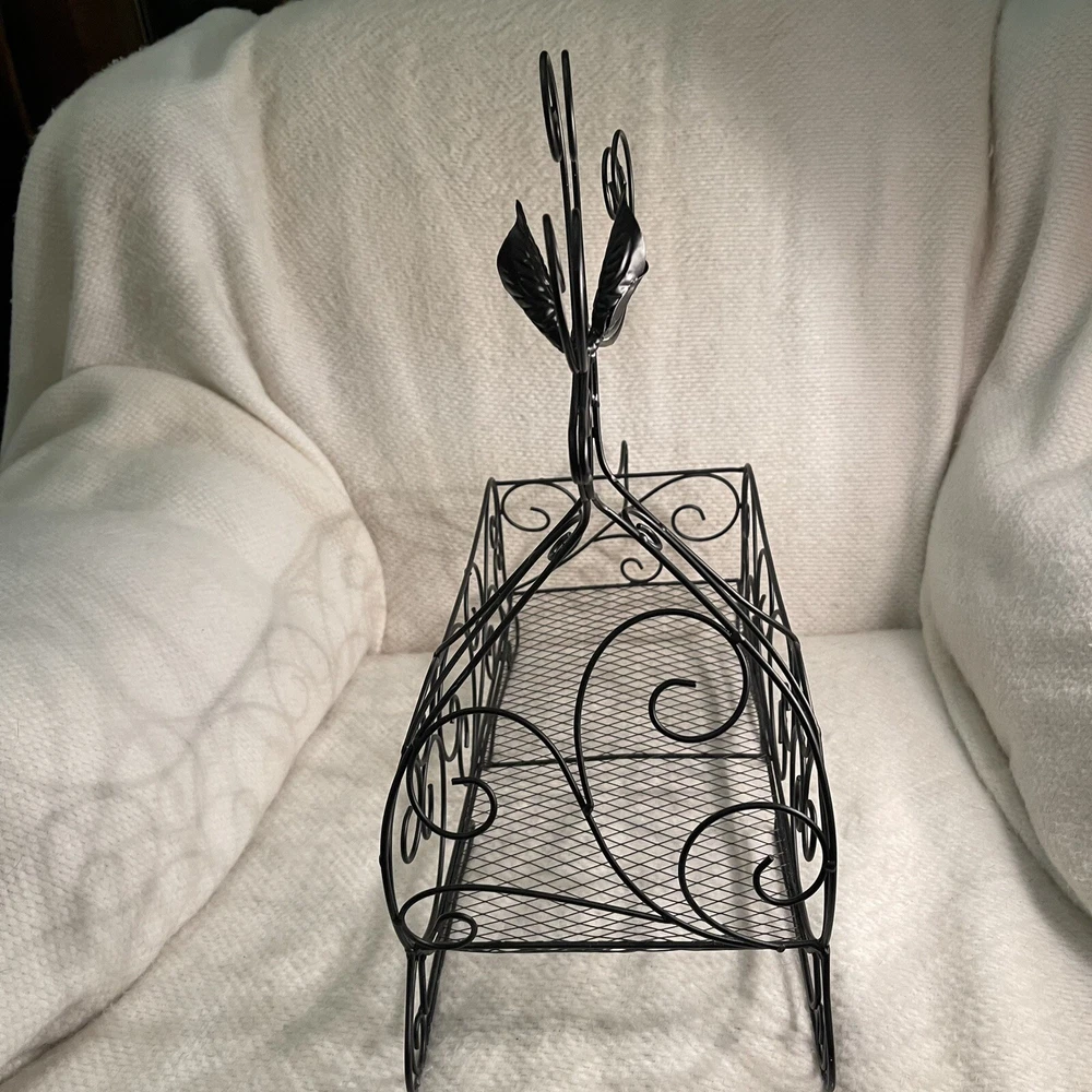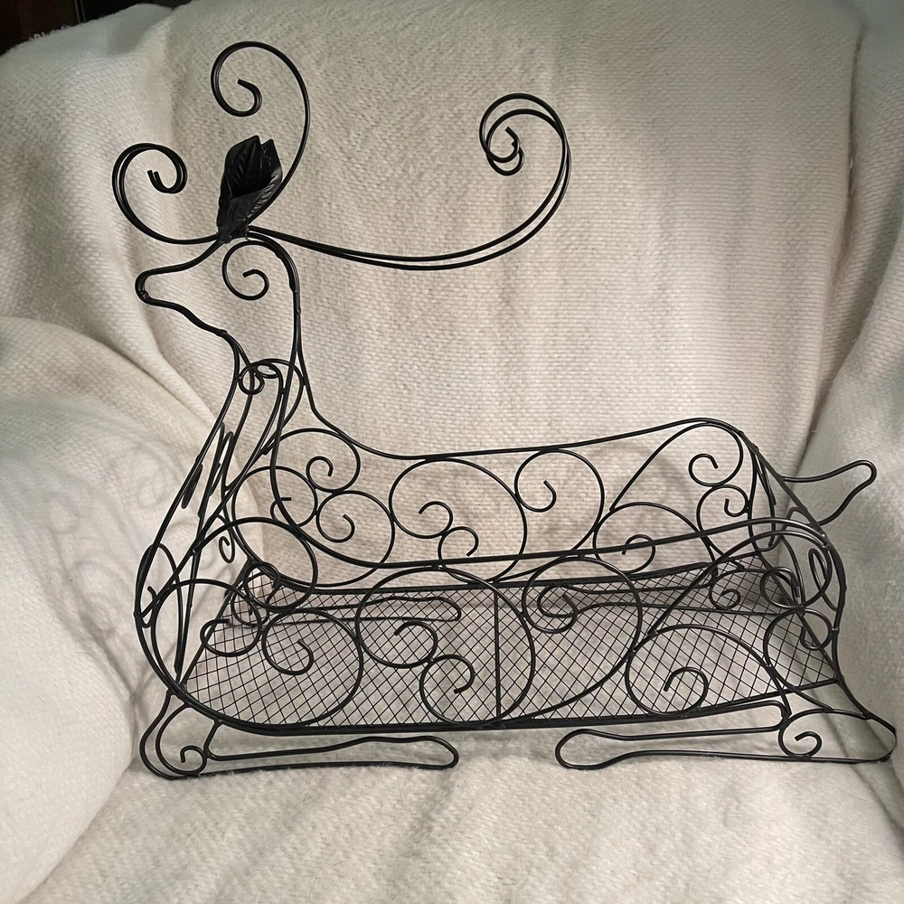 Add some festive charm to your Christmas decor with this metal reindeer sleigh. The sleigh features a unique scroll design and a wired base that adds an artistic touch to your holiday display. The reindeer is crafted from high-quality metal and painted black, making it a durable and long-lasting addition to your collection. Measuring 28.5 inches in length, 17.5 inches in height, and 7.5 inches in width, this reindeer sleigh is the perfect size for indoor or outdoor use. The sleigh is designed with an art deco style and features intricate details that make it stand out. Whether you're looking for a collectible or a holiday decoration, this metal reindeer sleigh is sure to impress. Excellent condition. New without tags.
