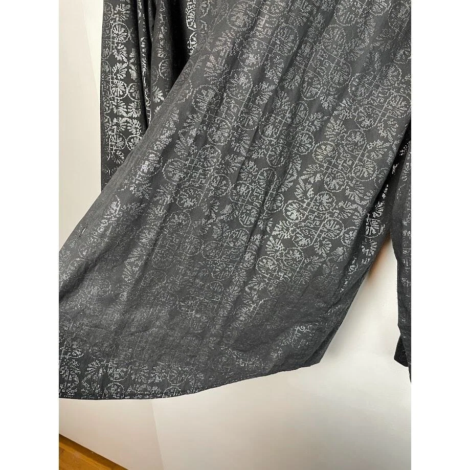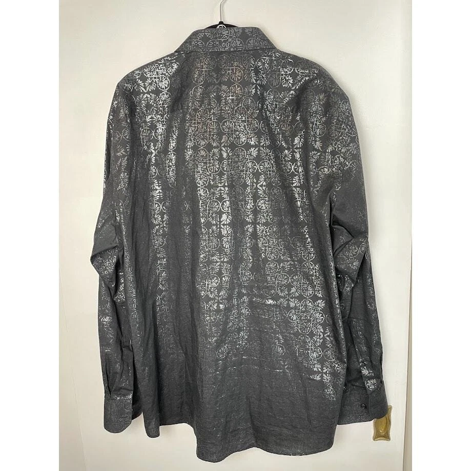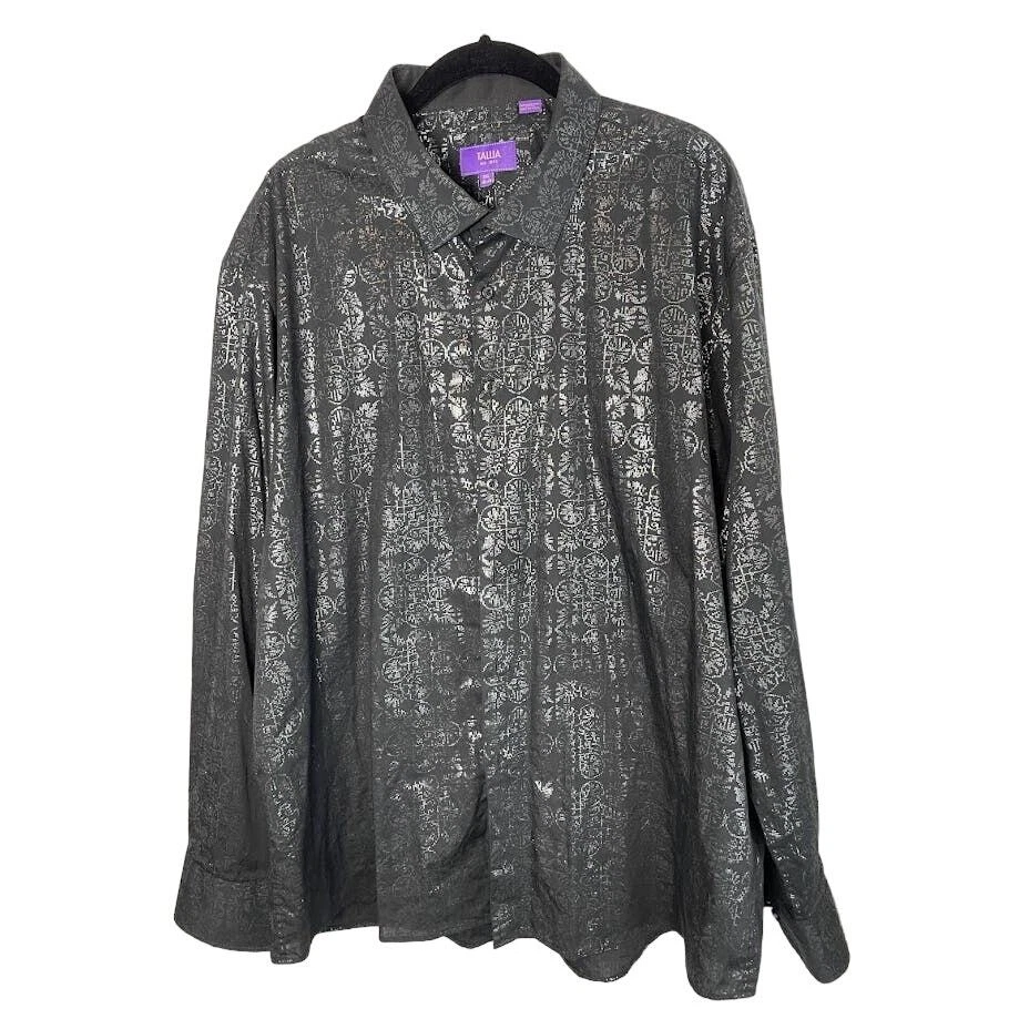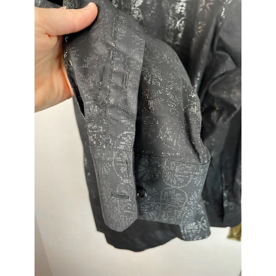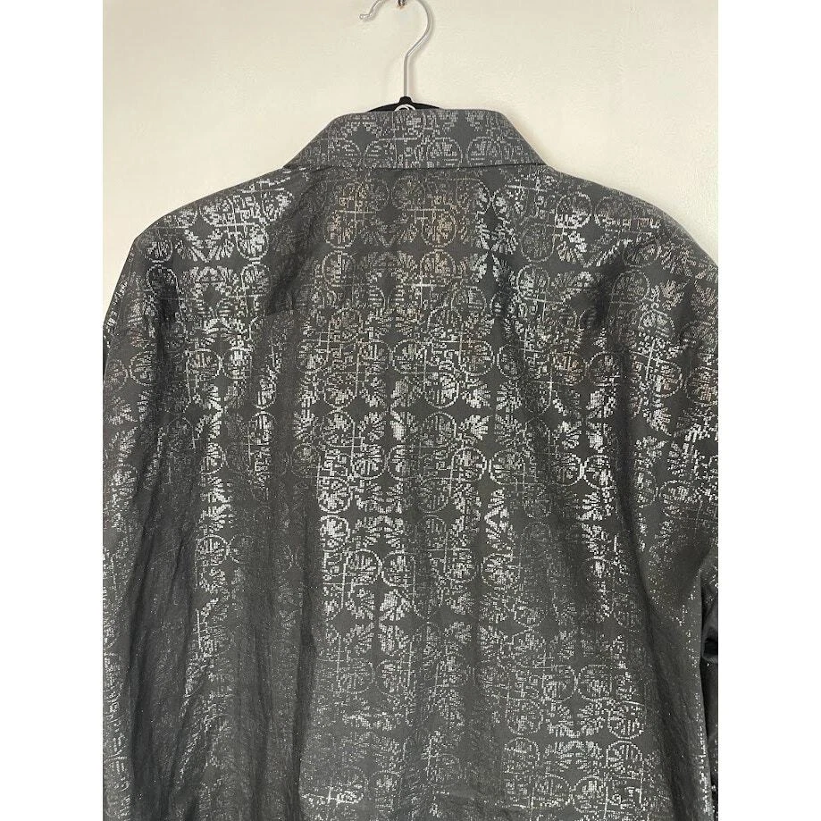Metallic Dress Shirt Mens Black Evening Button Up Long Sleeve Night Out Size 2XL 18 1/2 Pit to Pit 26.5" Length 30" 100% Cotton Black with silver print Very Good Condition no known Flaws Retro, party shirt, regencycore, club night,