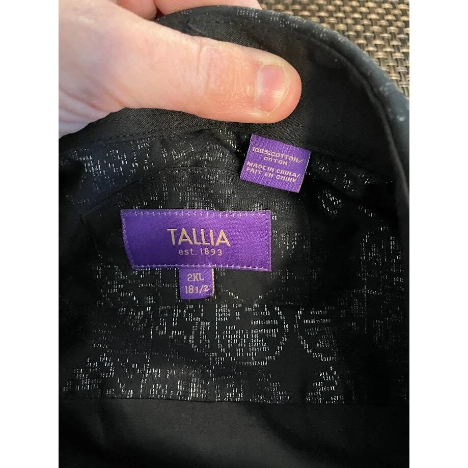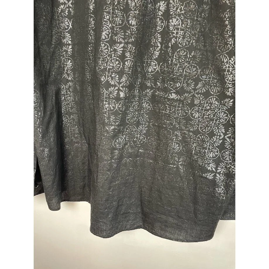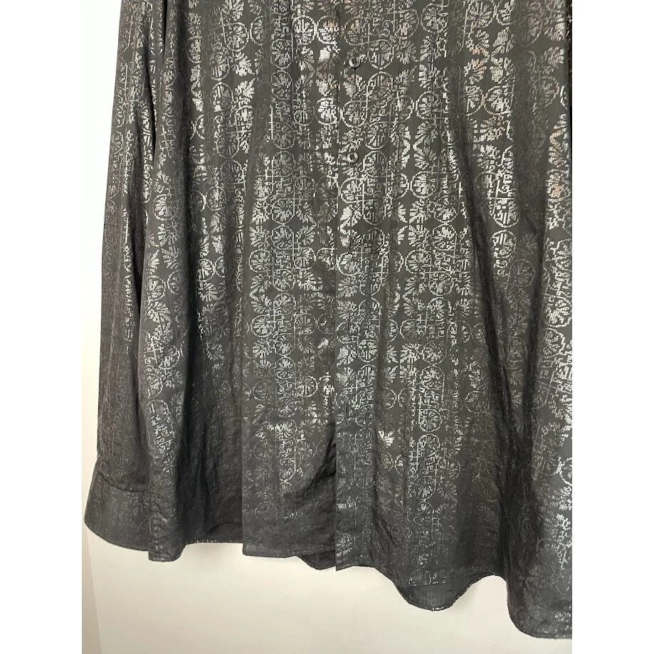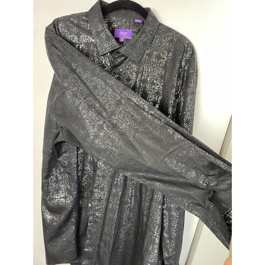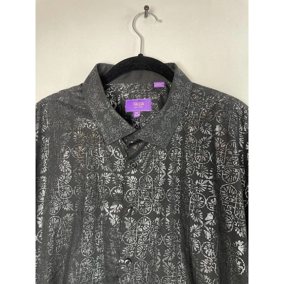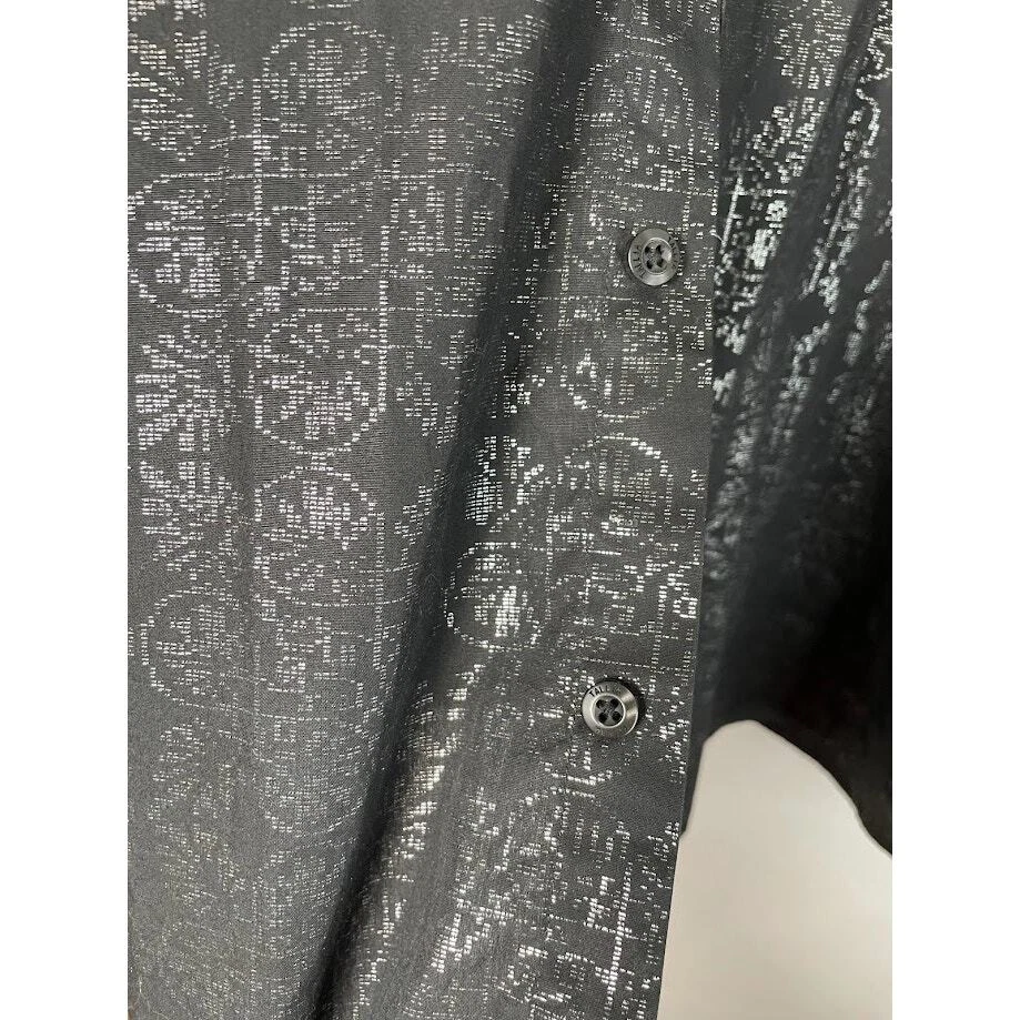Metallic Dress Shirt Mens Black Evening Button Up Long Sleeve Night Out Size 2XL 18 1/2 Pit to Pit 26.5" Length 30" 100% Cotton Black with silver print Very Good Condition no known Flaws Retro, party shirt, regencycore, club night,