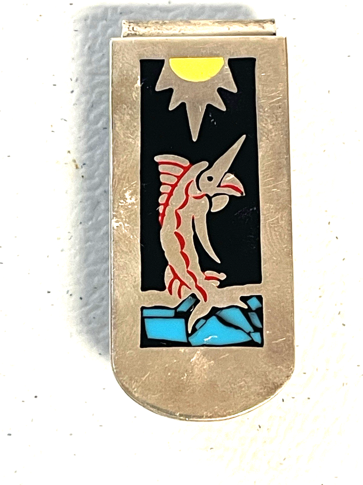 This Mexican Tooled Sterling Silver Gemstone Turquoise Money Clip features a unique fish design, incorporating elements of the sun and water. Made from sterling silver, this vintage accessory is perfect for unisex use and adds a touch of metal style to any outfit. The detailed craftsmanship and use of gemstones make this money clip a standout piece. T hank you for looking. This item is from a smoke free home. Please view all the photos. Check out all my other items.