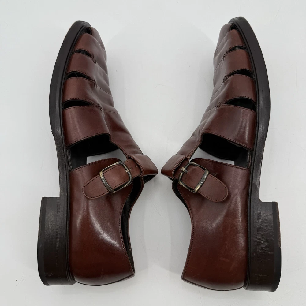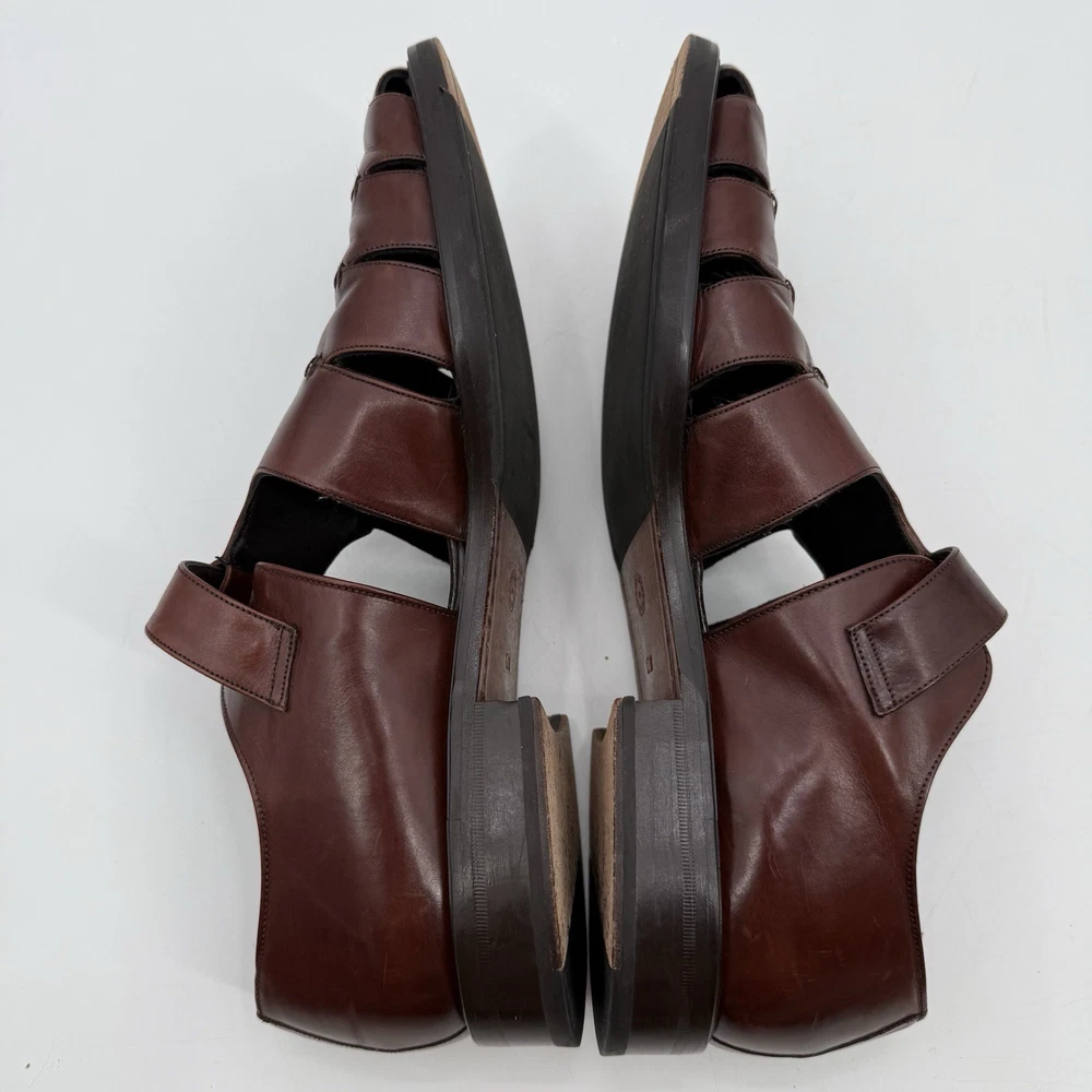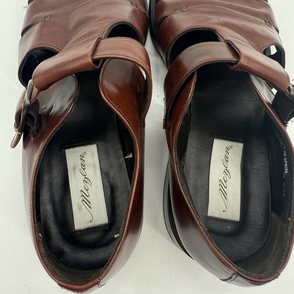 One of the elastic strips on strap has a couple missing threads as pictures. The Mezlan Diablo Mens Brown Leather Fisherman Sandals are a stylish and casual shoe option for men. Made in Spain, these sandals feature a solid brown color with a strap accent. The leather material and comfortable medium width make them perfect for a casual occasion. The dress sandals style adds a touch of sophistication to any outfit, while the fisherman character embodies a rugged and adventurous spirit. Perfect for a man who values both style and comfort in his footwear choice.