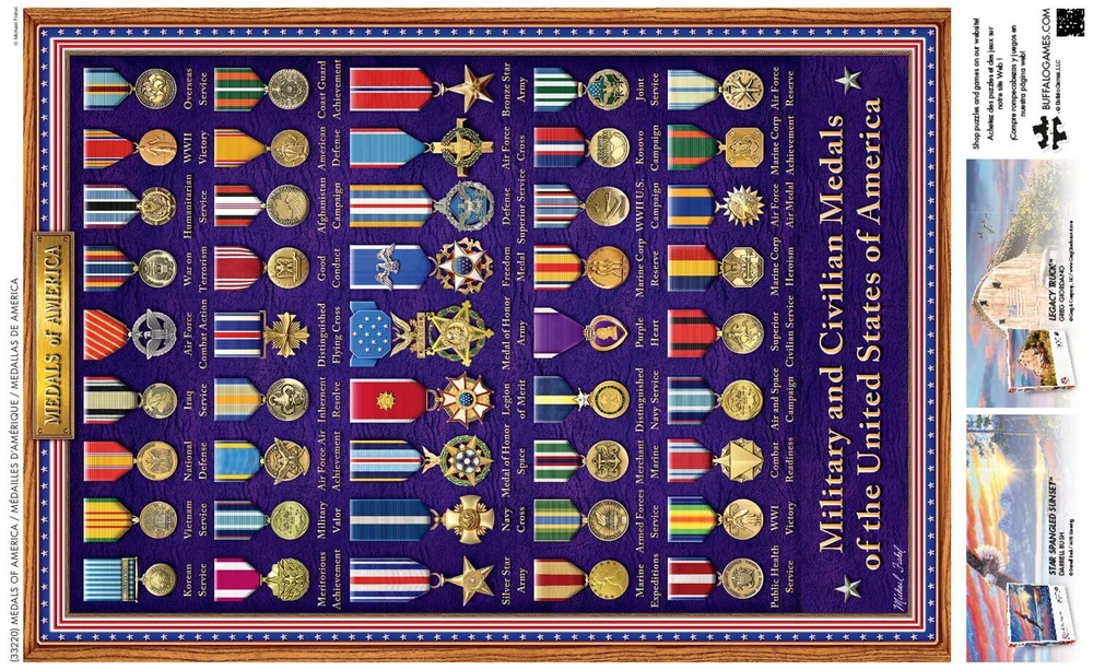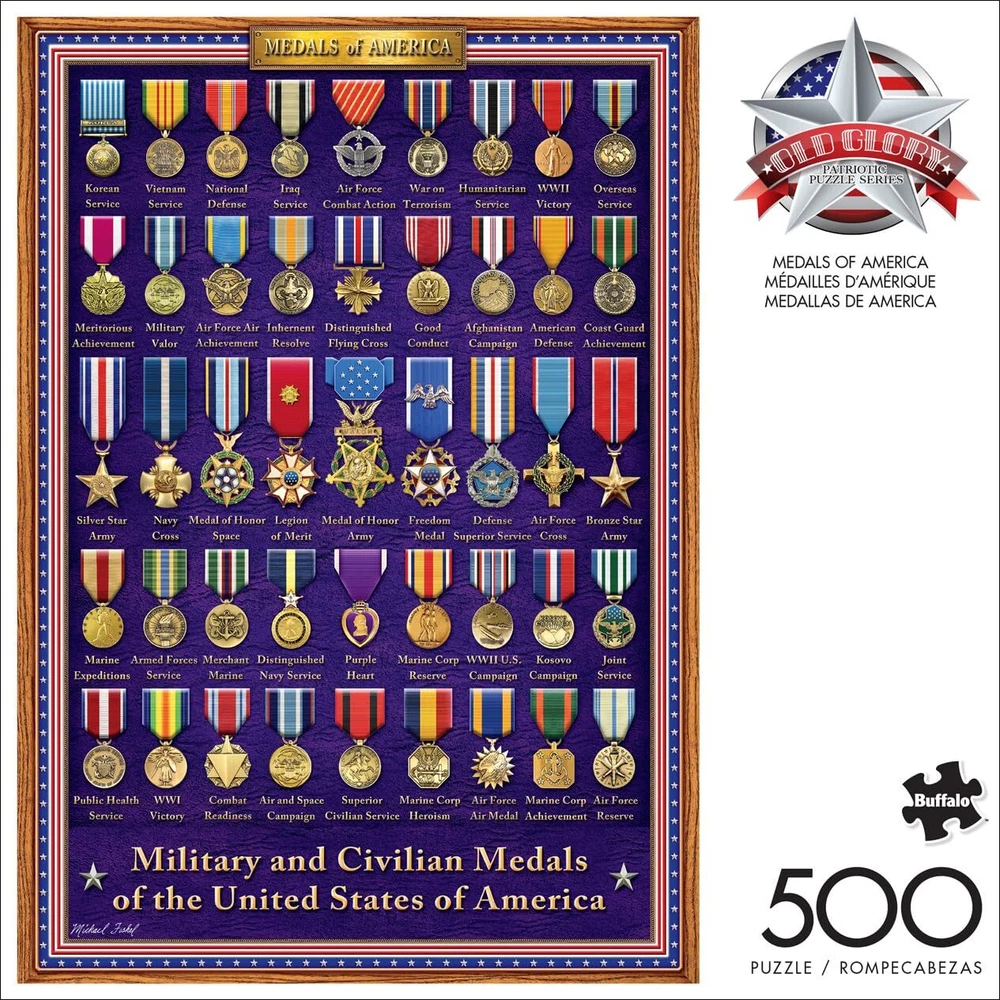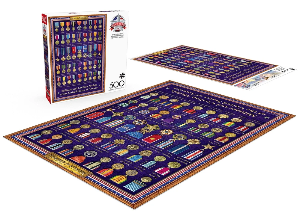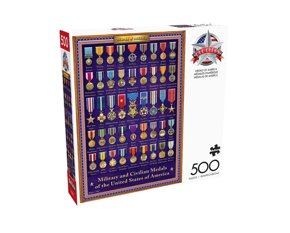 Medals of America is a 500-piece jigsaw puzzle from the Old Glory series by . The image features a case showcasing the Military and Civilian Medals of the United States of America. All of our armed forces are celebrated in this patriotic puzzle. Every jigsaw puzzle is manufactured from recycled puzzle board. A precision cutting technique guarantees that every piece will fit soundly with the company's signature Perfect Snap™. A bonus puzzle poster is also included so that you have a handy reference of what the completed puzzle should look like while you put yours together. 500 PIECE JIGSAW PUZZLE – This 500-piece jigsaw puzzle is the perfect level of challenge. Measuring 7.94in. x 7.94in., this puzzle is a great single evening activity for the entire family, friend group or yourself. For adults ages 14 and up. HIGHEST QUALITY MATERIALS – The puzzle pieces are thick and sturdy. Our high-quality dies ensure laser cut precision every time. APEX PUZZLE IMAGERY - Relax and enjoy the puzzling process while “traveling” to some of the most beautiful, bucket-list places, Or join in the fun with our portfolio of licensees, or finish in style with world renown artists. FULL COLOR BONUS POSTER - Every puzzle includes a full color poster to reference while assembling your puzzle. Or, for a real challenge, try to solve without the poster in hand! PERFECT GIFT - Puzzles are not only great gifts for any and all occasions including birthdays, holidays, housewarming parties or even just a fun night in with friends.