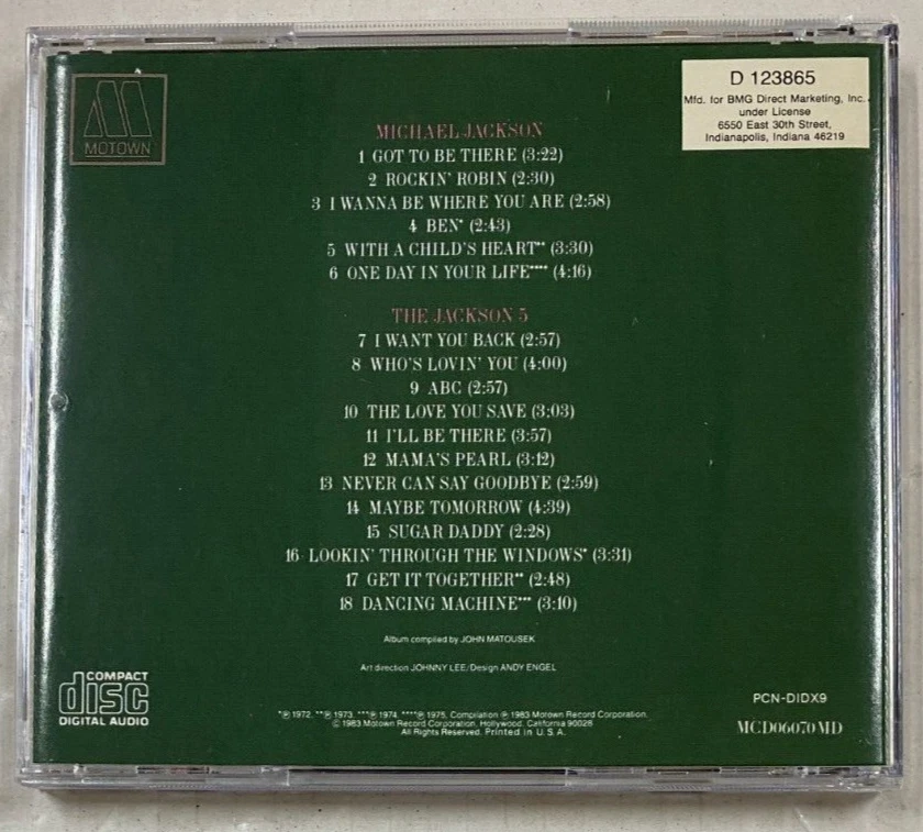 Tracklist 1 Michael Jackson Got To Be There 3:22 2 Michael Jackson Rockin' Robin 2:30 3 Michael Jackson I Wanna Be Where You Are 2:58 4 Michael Jackson Ben 2:43 5 Michael Jackson With A Child's Heart 3:30 6 Michael Jackson One Day In Your Life 4:16 7 The Jackson 5 I Want You Back 2:57 8 The Jackson 5 Who's Lovin' You 4:00 9 The Jackson 5 ABC 2:57 10 The Jackson 5 The Love You Save 3:03 11 The Jackson 5 I'll Be There 3:57 12 The Jackson 5 Mama's Pearl 3:12 13 The Jackson 5 Never Can Say Goodbye 2:59 14 The Jackson 5 Maybe Tomorrow 4:39 15 The Jackson 5 Sugar Daddy 2:28 16 The Jackson 5 Lookin' Through The Windows 3:31 17 The Jackson 5 Get It Together 2:48 18 The Jackson 5 Dancing Machine 3:17
