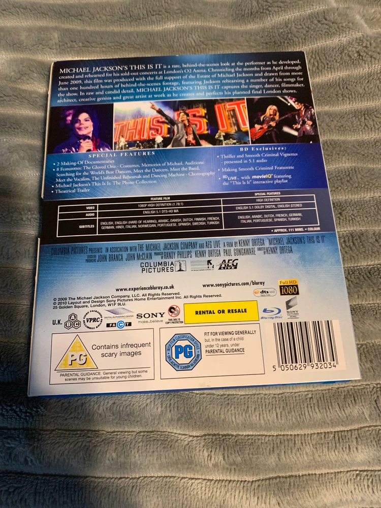 gtin13:0043396338814Producer:Kenny Ortega, Paul Gongaware, Randy PhillipsFormat:Blu-rayRelease Year:2009Rating:PGSub-Genre:Music Video (Concert/Performance)Run Time:111 min.Director:Kenny OrtegaMPN:Does not applyGenre:PopUPC:0043396338814Movie/TV Title:Michael Jackson's this Is ItSubtitle Language:English, FrenchLanguage:EnglishStudio:Sony Pictures