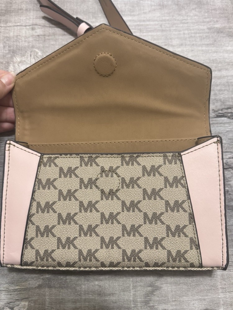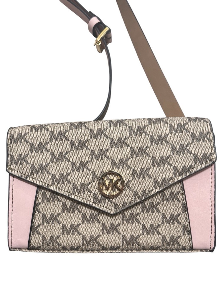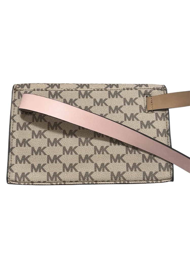 This Michael Kors Fanny Pack Belt Bag is a stylish and practical choice for women on-the-go. The bag features a magnetic closure and adjustable belt, making it easy to access and secure your items. The exterior color is a beautiful pink/tan, and the bag is made of synthetic materials. Measuring 7.5 inches in width, 5 inches in height, and 1 inch in depth, this small-sized bag is perfect for carrying your essentials. It is a belt bag and fanny pack all in one, making it a versatile addition to your wardrobe. The brand is Michael, and the bag is new without tags.