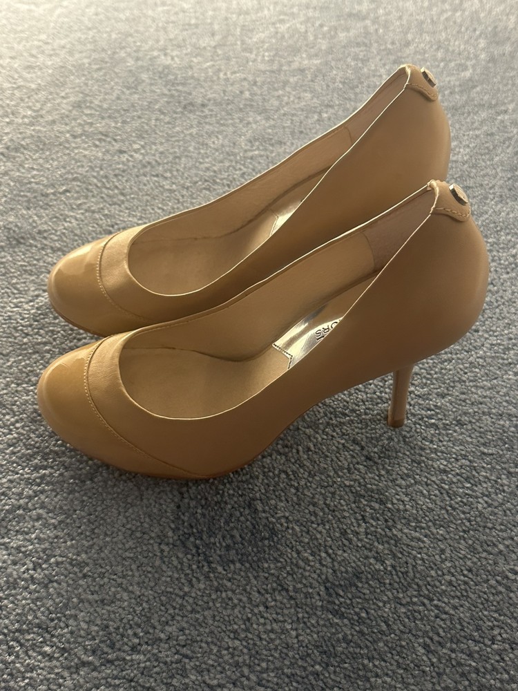 Elevate your wardrobe with these stunning Michael Kors nude beige patent leather high heels. Crafted with a glossy finish and a timeless design, these shoes exude elegance and sophistication, perfect for formal events
