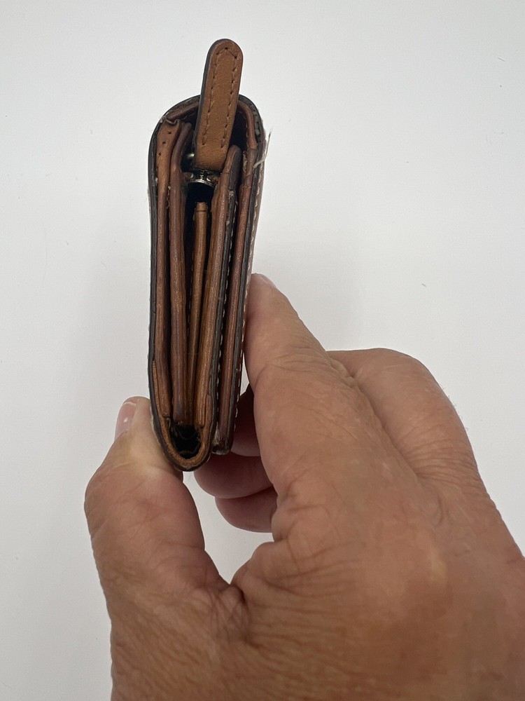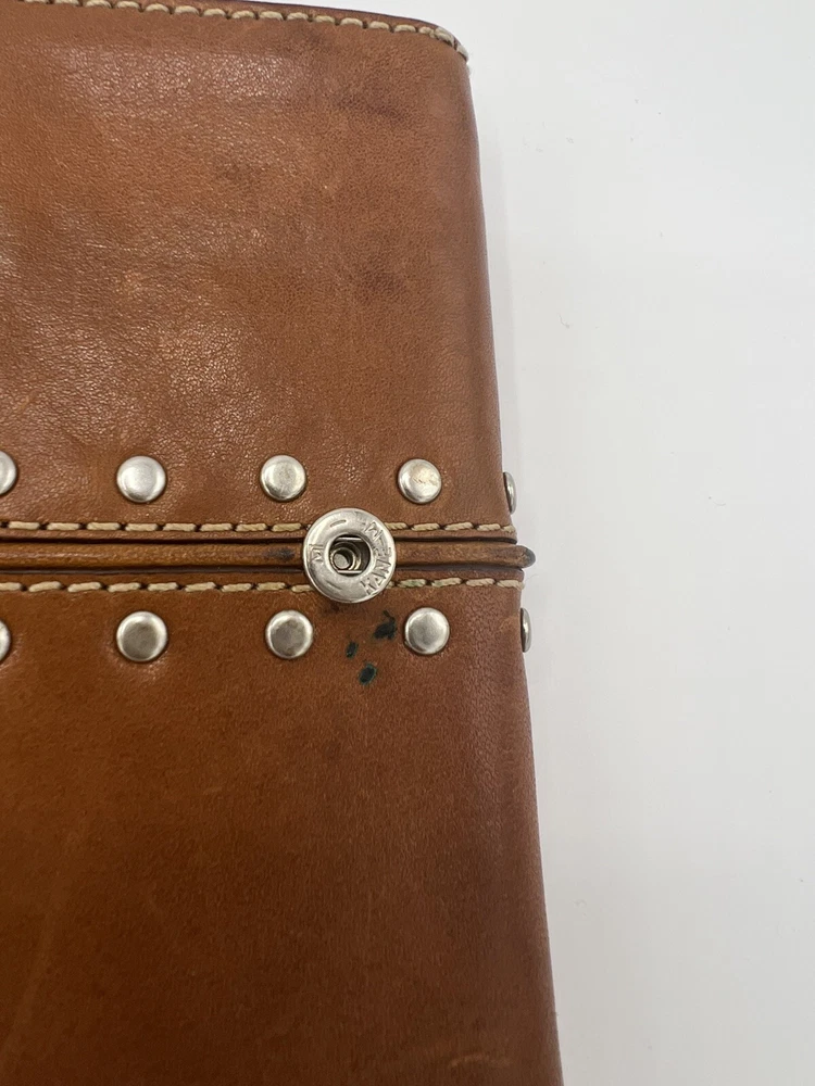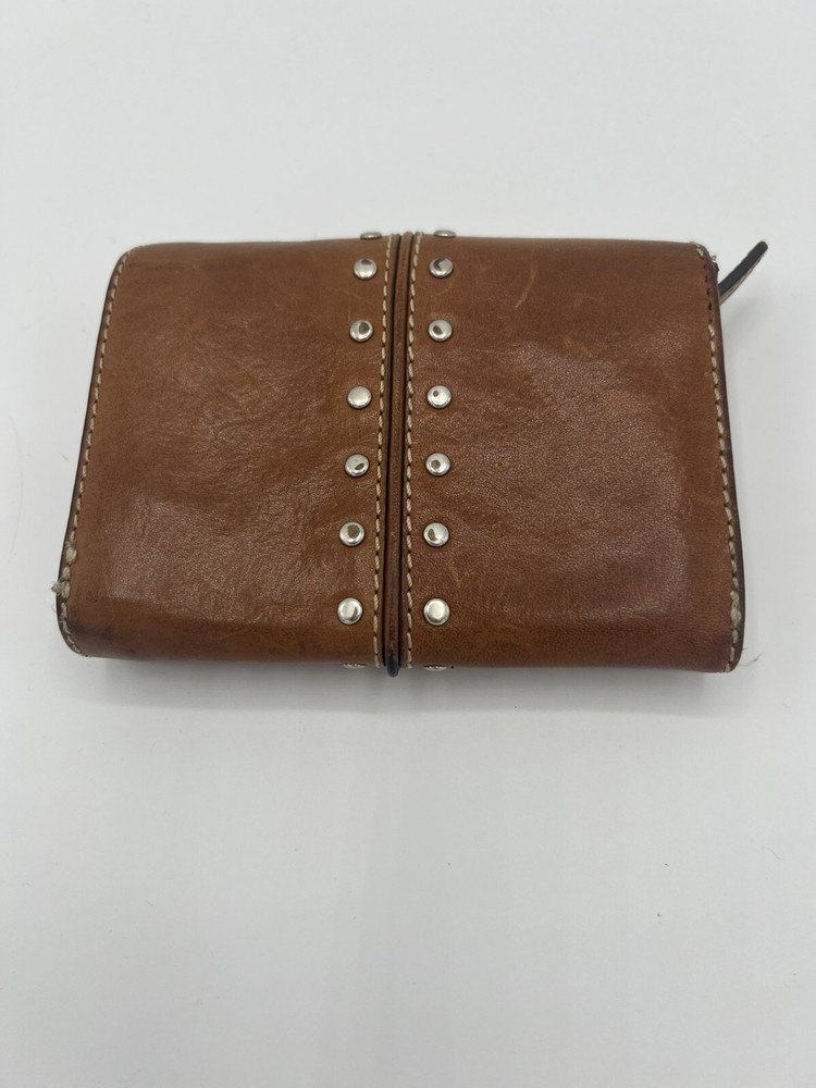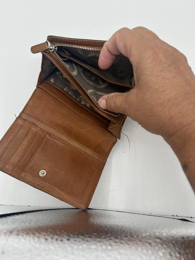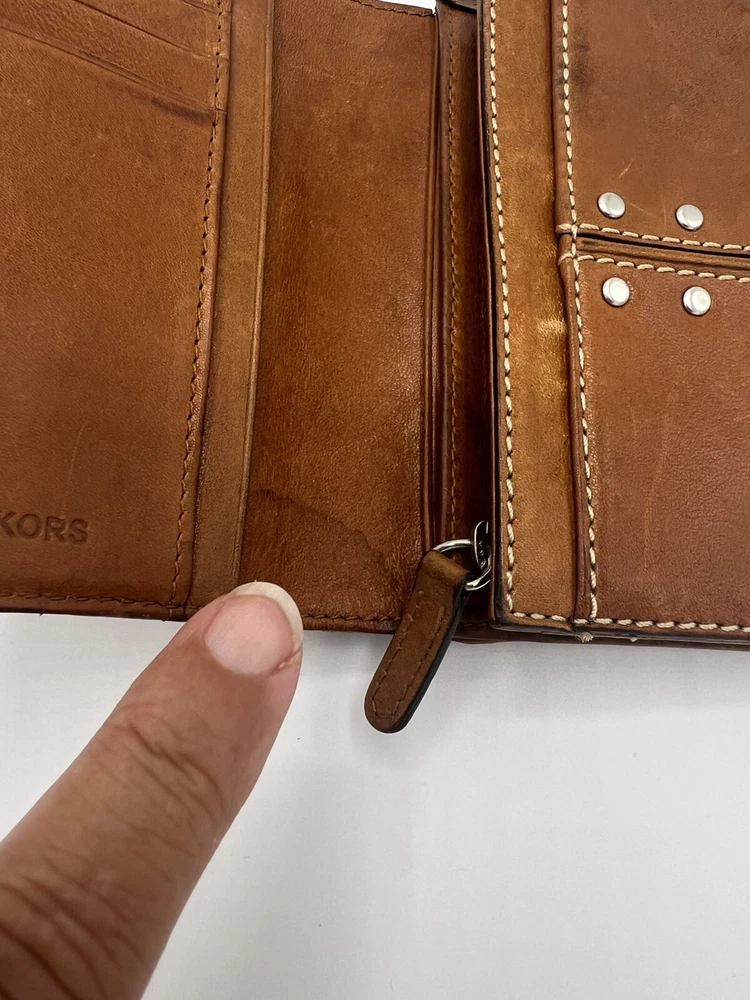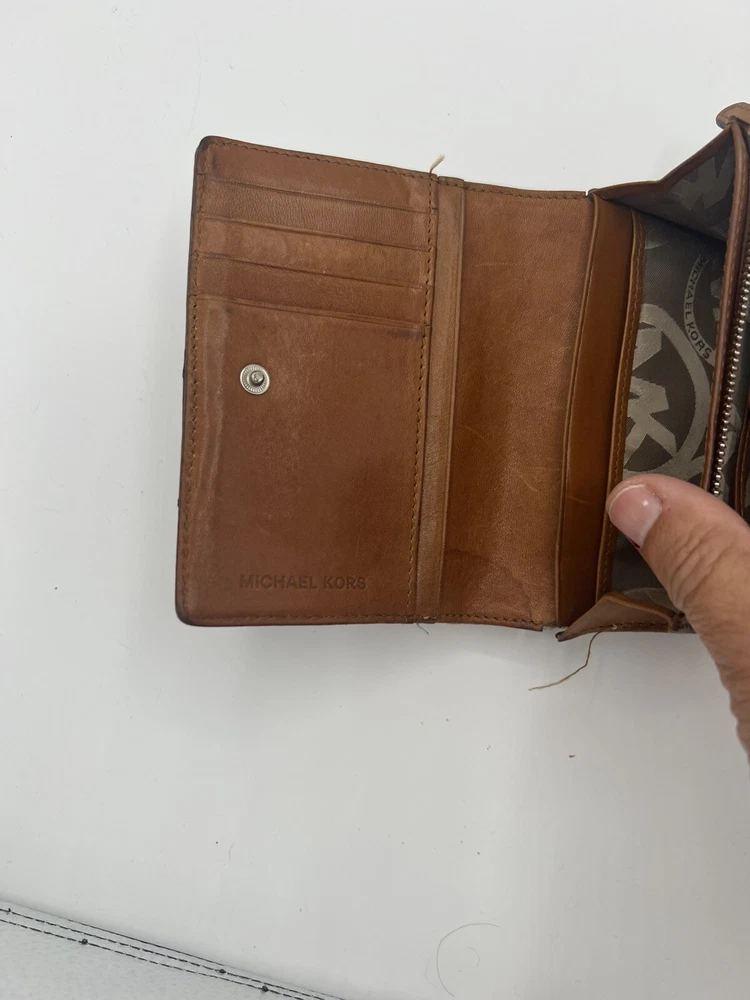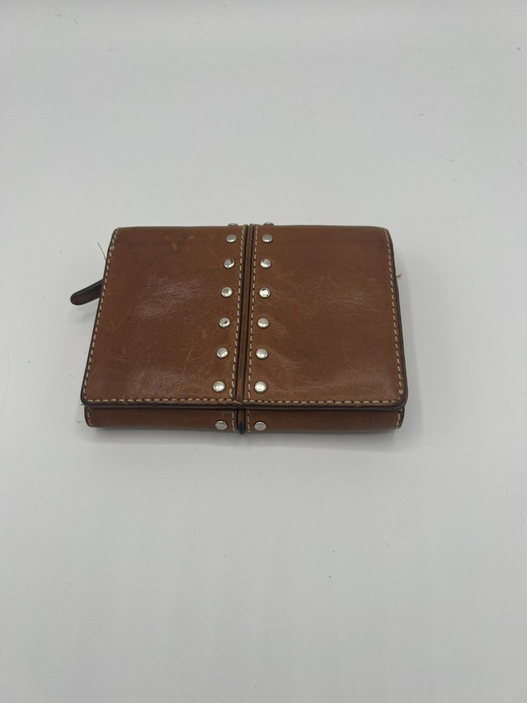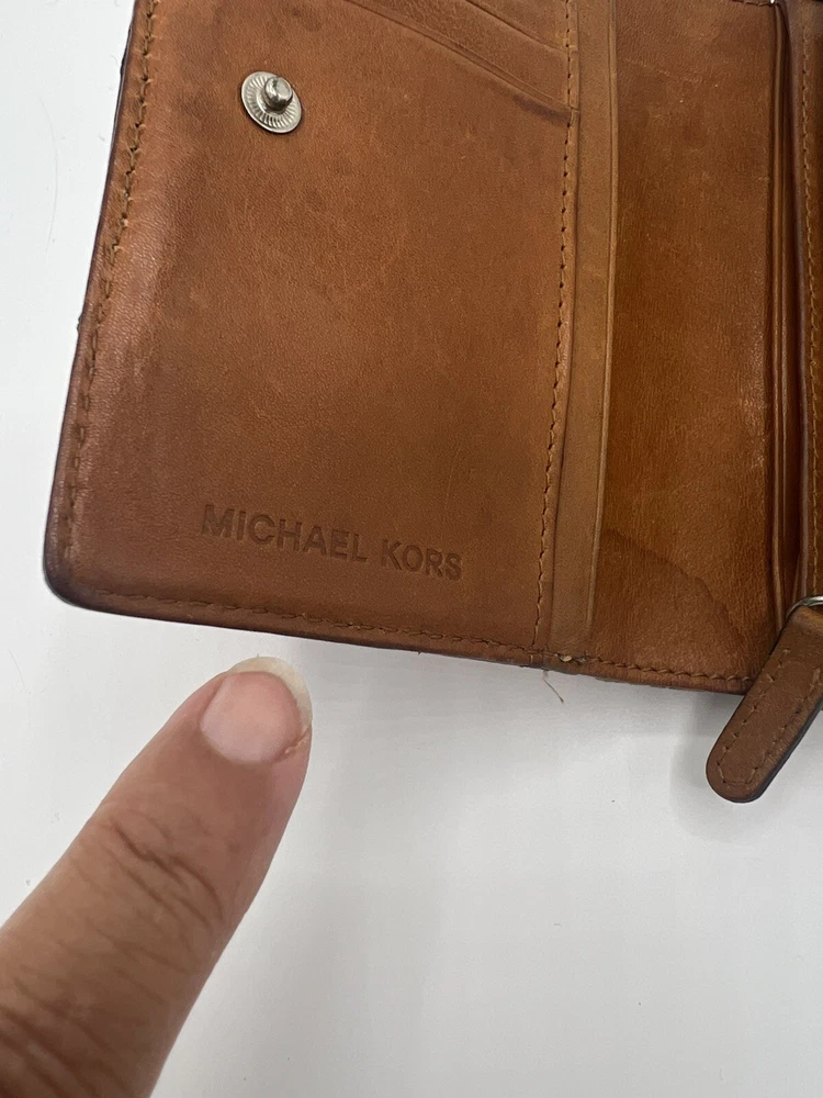This Michael Kors wallet is the perfect accessory for any fashionable woman. Crafted from high-quality leather in a beautiful tan-brown color, this wallet features studded accents that add a touch of glamour to any outfit. The wallet is designed with multiple compartments and card slots, making it easy to organize your essentials. Whether you're running errands or heading out for a night on the town, this wallet is a stylish and functional choice. It's perfect for women who want to keep their belongings organized and secure. Add this Michael Kors wallet to your collection today! This wallet is beautiful but is preloved and has wear, some tiny spots and a few loose threads, so please view all photos before bidding.