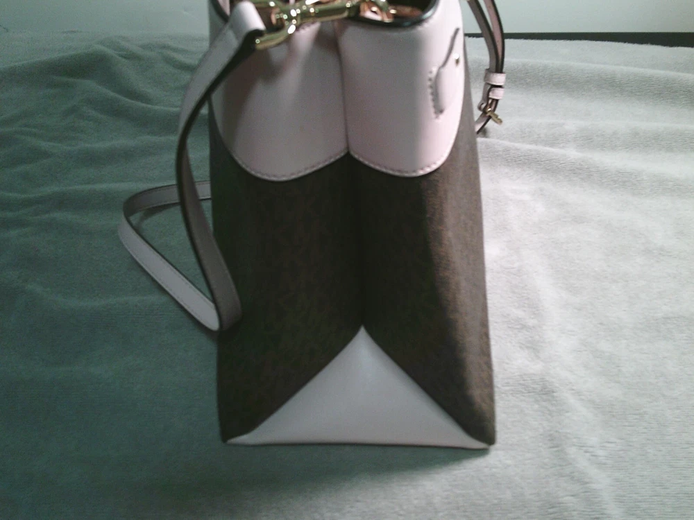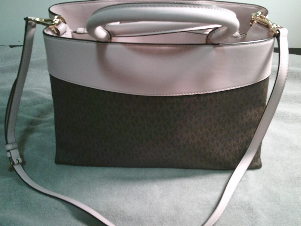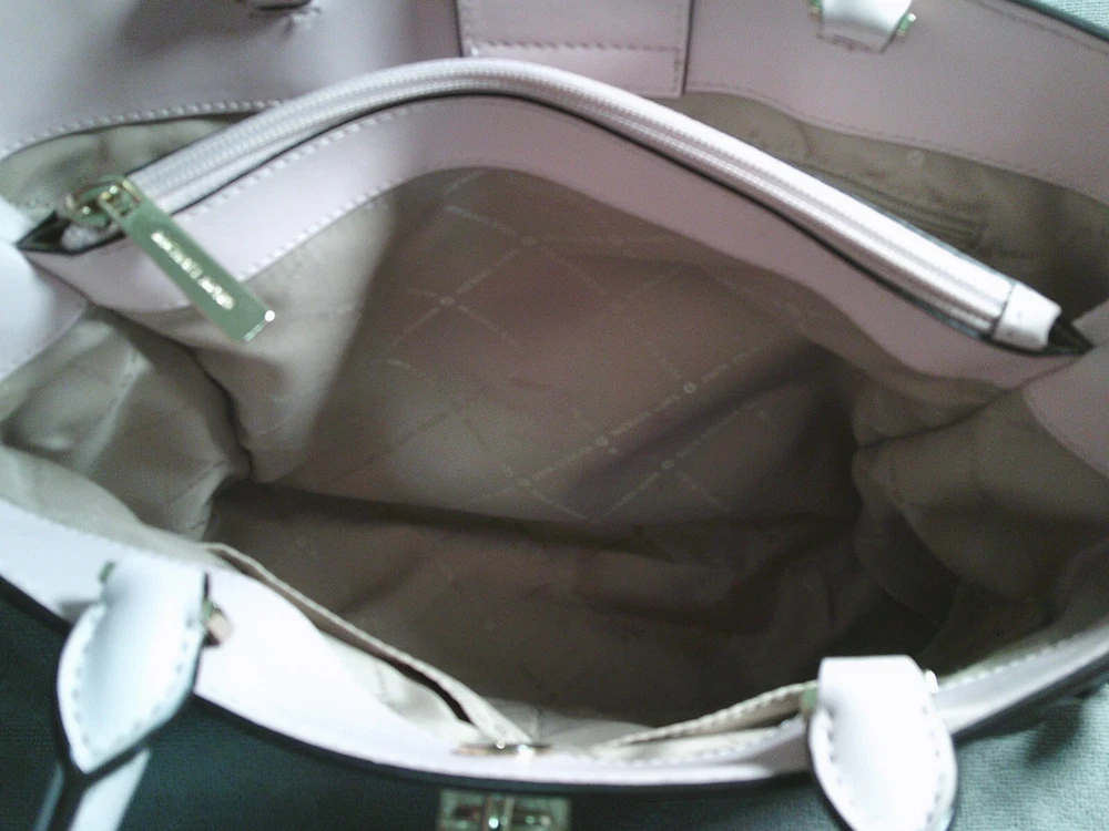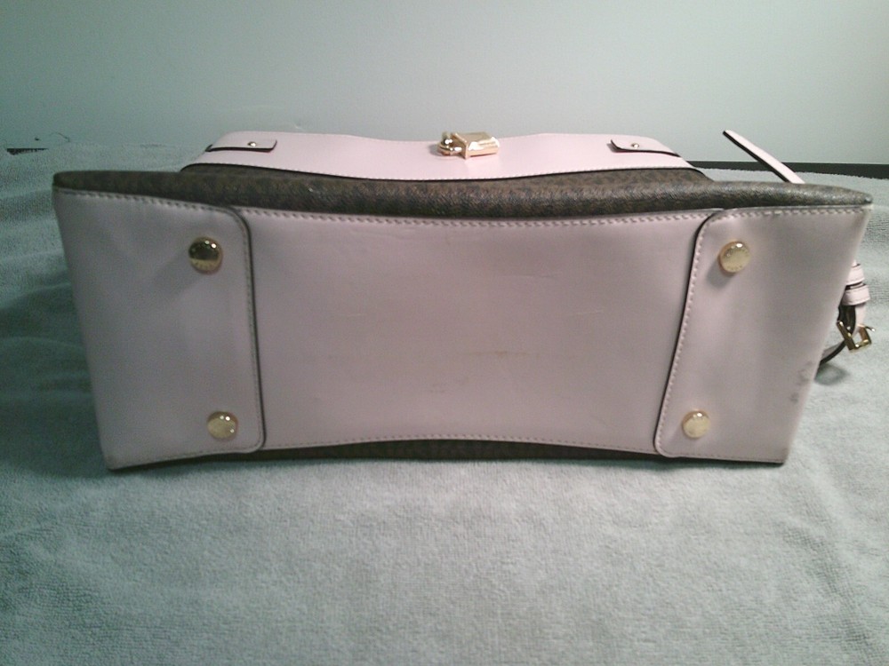 This is a large Michael Kors Gramercy satchel/top handle bag in powder blush leather, featuring a beige lining and a powder blush handle/strap. It is a women's handbag suitable for everyday use, available for purchase as a used item. Beautiful bag with small blemishes on bottom of bag.