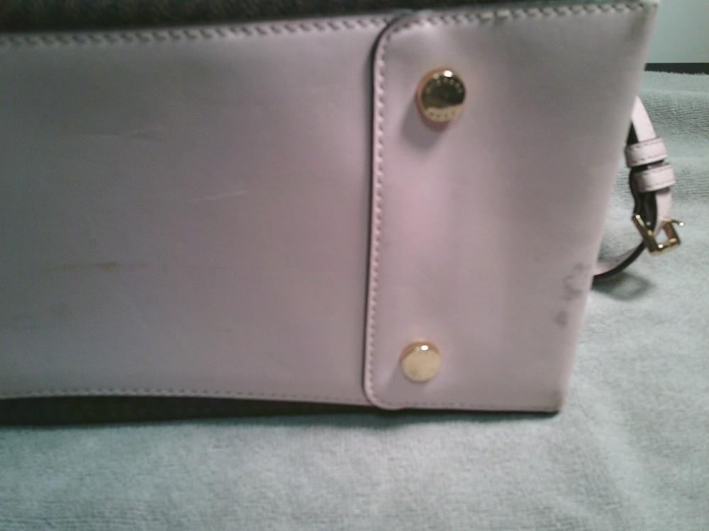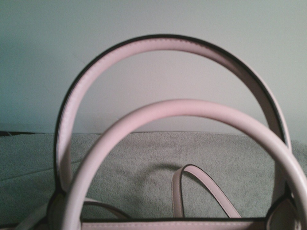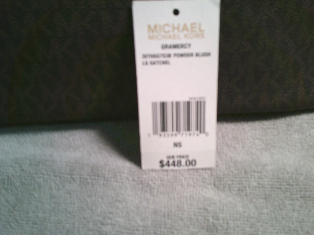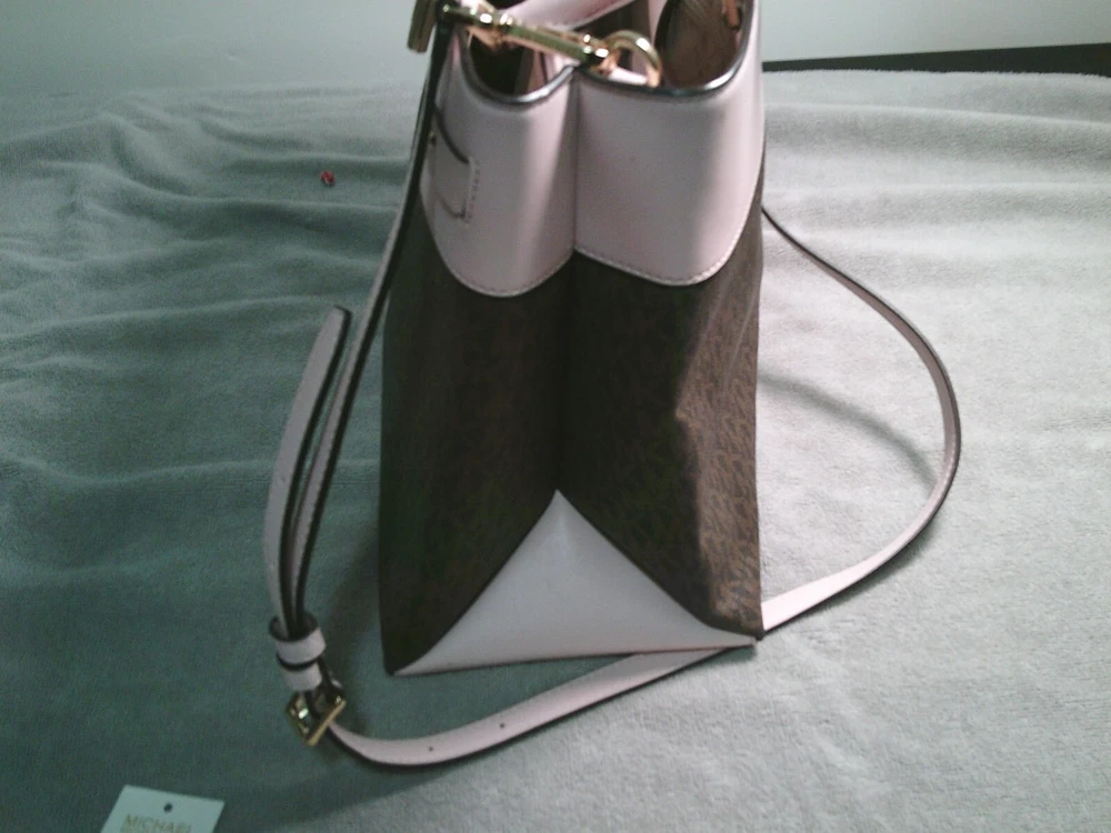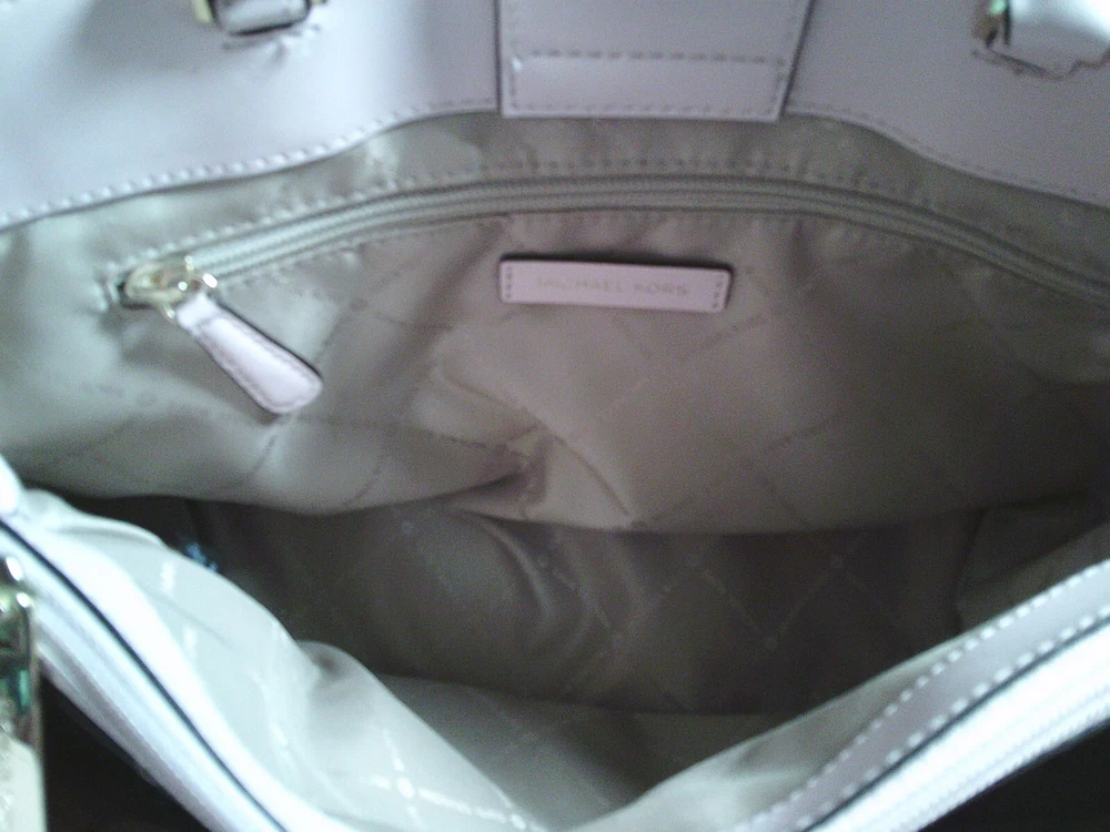 This is a large Michael Kors Gramercy satchel/top handle bag in powder blush leather, featuring a beige lining and a powder blush handle/strap. It is a women's handbag suitable for everyday use, available for purchase as a used item. Beautiful bag with small blemishes on bottom of bag.