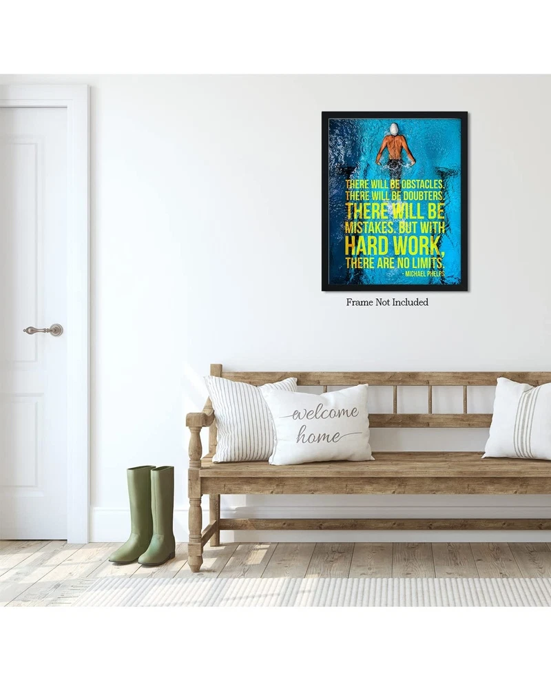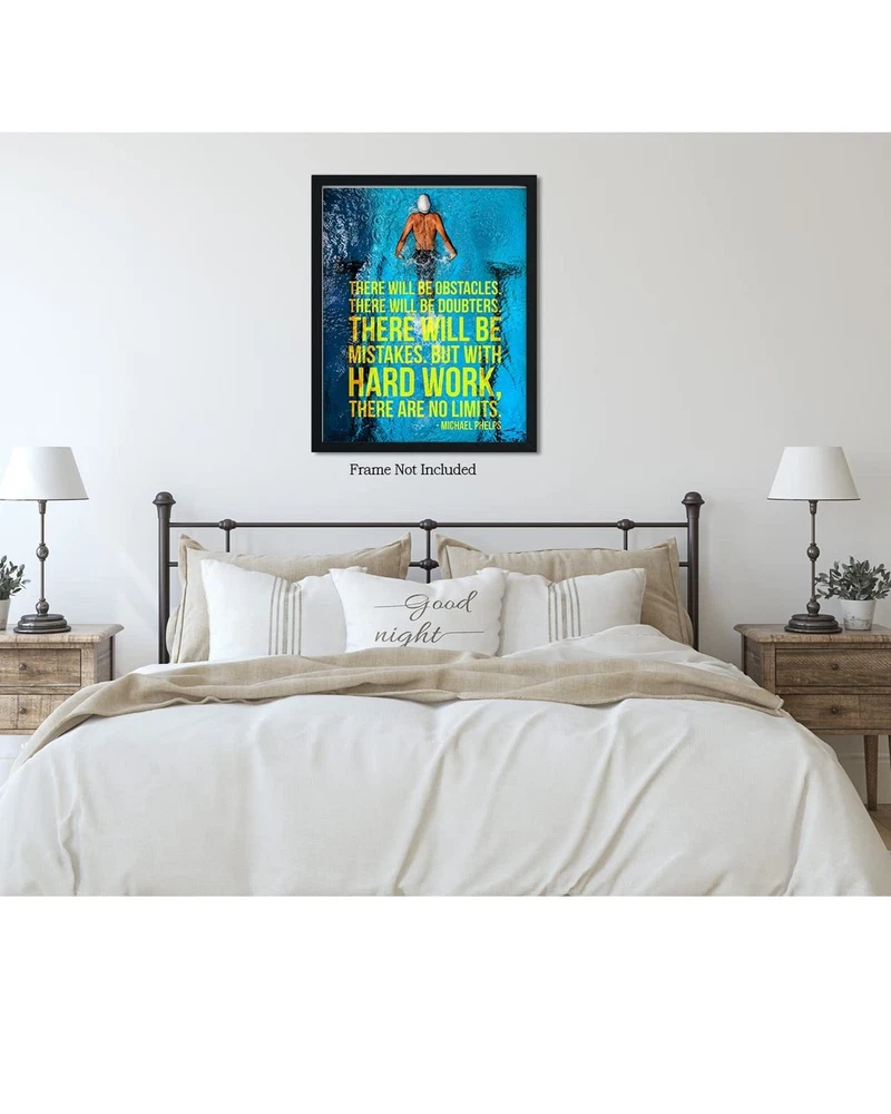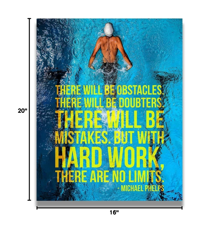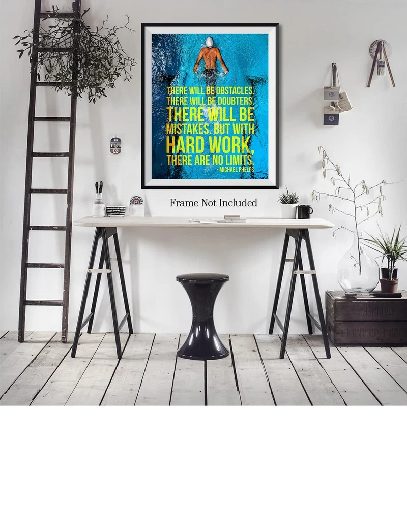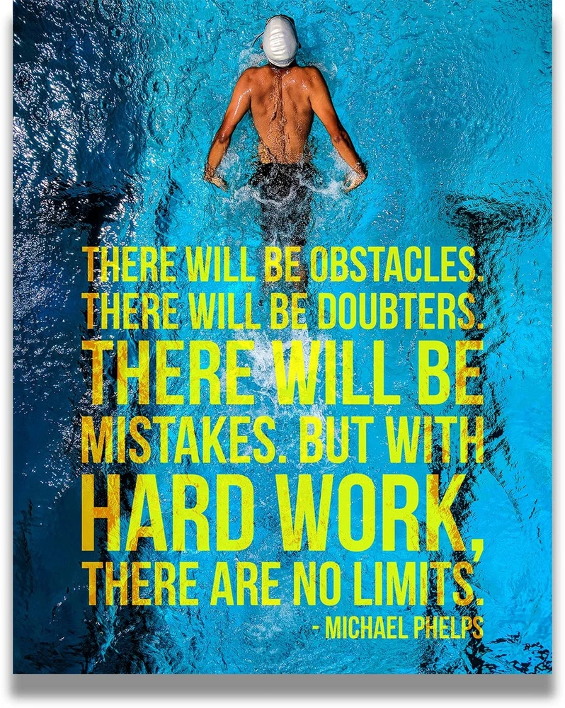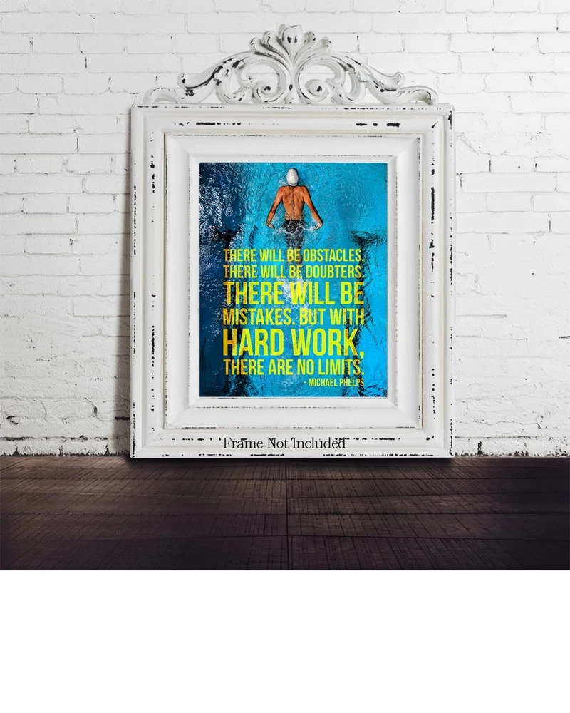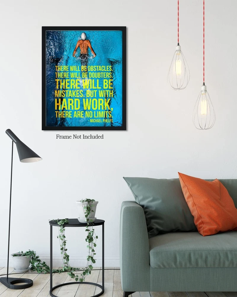 Michael Phelps inspirational wall decor - Motivational wall art for swimming enthusiasts - Positive affirmations wall decor - 16x20 unframed poster Product Details Size: 16" x 20" poster Brand: Govivo MPN: Does not apply UPC: Does not apply EAN: Does not apply Product Dimensions: 0.01 x 16 x 20 inches Item Weight: 8 ounces Date First Available: October 26, 2021 GREAT HOME DECOR IDEA for a man cave, she shed, bedroom, den, living room, office, dorm room and many more! This will also look good hanging on the walls of a sports store or pool locker room HIGH QUALITY - birthday, housewarming, appreciation or holiday gifts to give your friends and relatives who love to swim or for a coach UNIQUE & EYE-CATCHING - This swimming quotes wall art makes a powerful statement and adds character anywhere it is displayed in a house POSTERS details - The printing technology we use produces prints with sharp photo details and high color quality with a satin finish. Wall art print posters will arrive rolled, sealed in an archival plastic bag and will arrive in a tube. A frame is NOT included in your order.