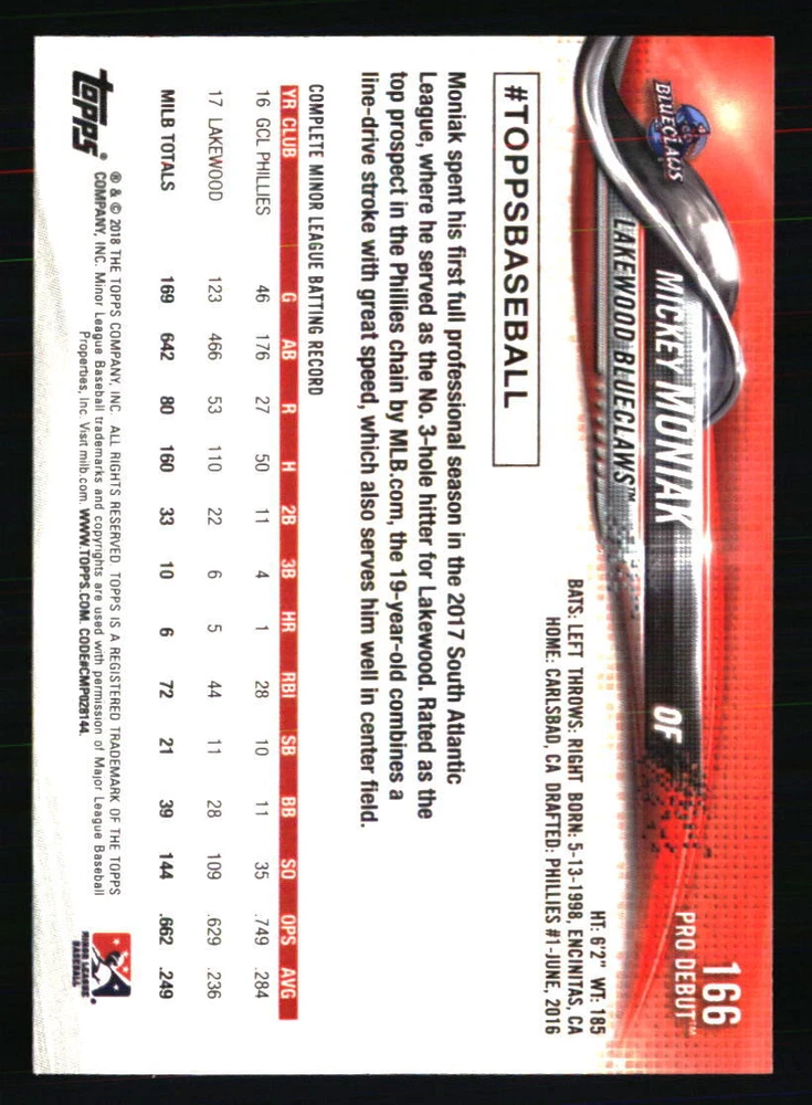 Graded: No Player|Athlete: Mickey Moniak Year Manufactured: 2018 Team: Lakewood Blueclaws League: MLB Type: Sports Trading Card Card Number: 166 Sport: BASEBALL Set: 2018 Topps Pro Debut Autographed: No Season: 2018 Manufacturer: Topps