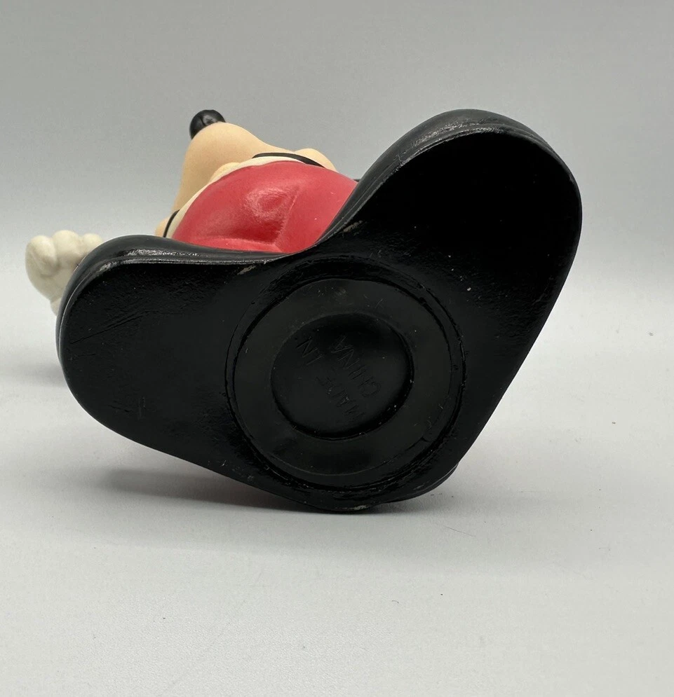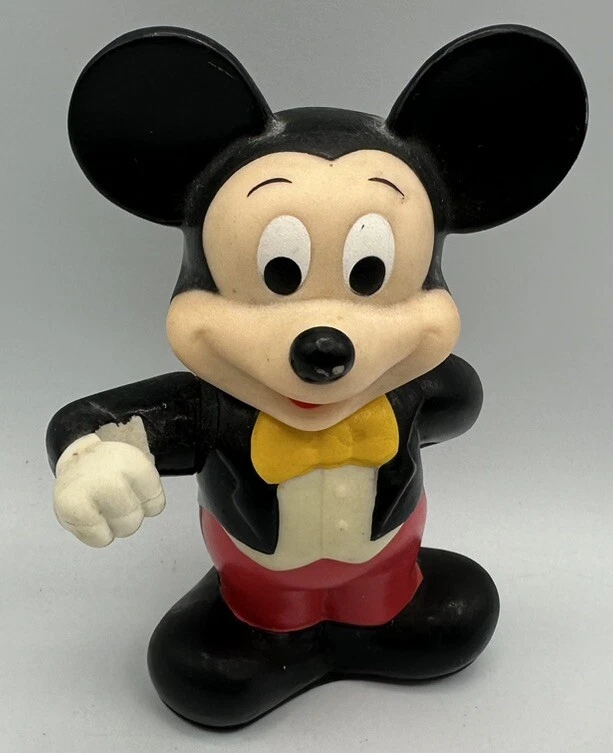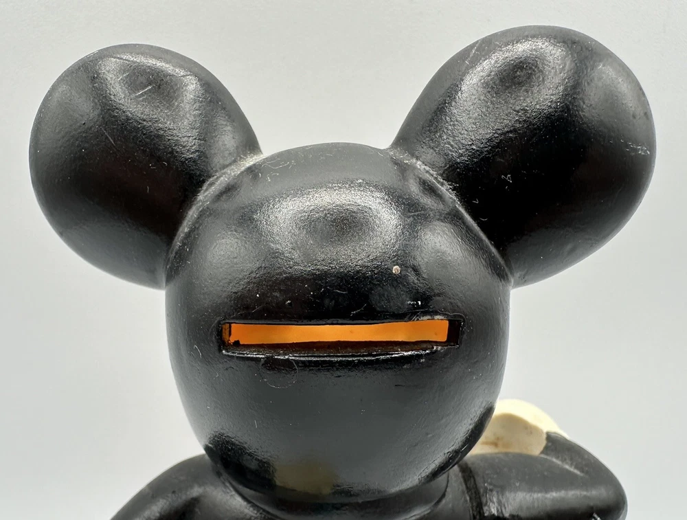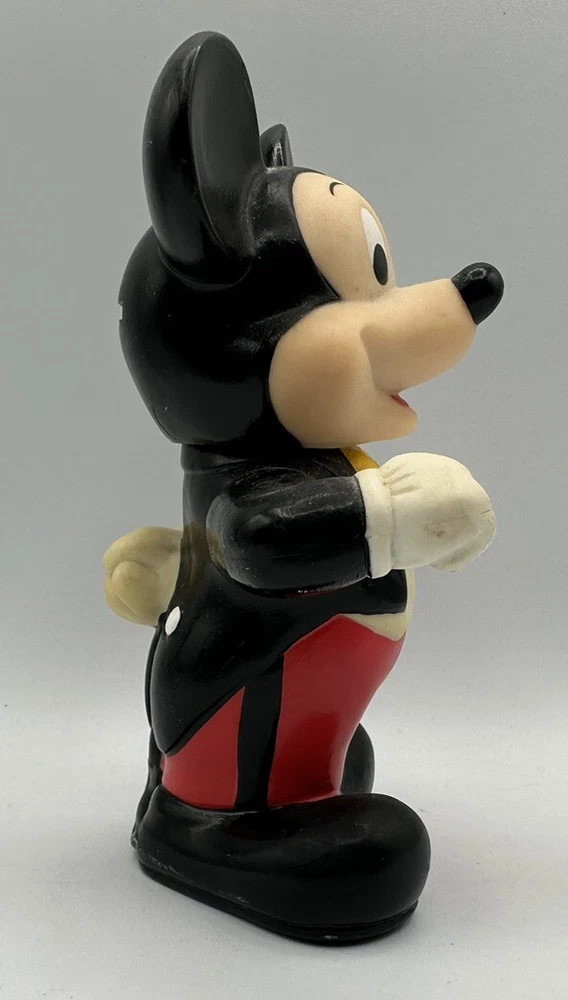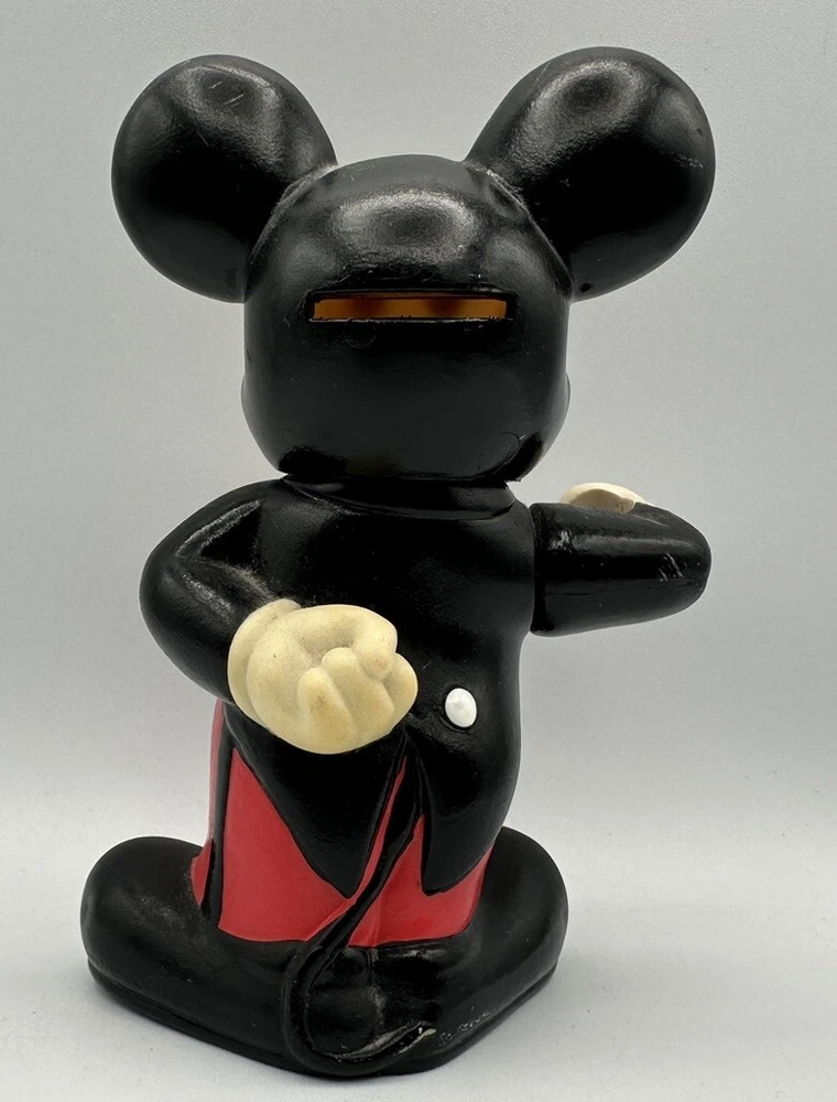 This Mickey Mouse bank is a must-have for any Disney fan! Made of vinyl or plastic, it stands at 6 inches tall and features the iconic character of Mickey Mouse. The bank is a great addition to any collection and is perfect for storing loose change or small trinkets. With its intricate details and high-quality construction, this bank is sure to impress. Whether you're a lifelong Disney fan or just looking for a fun and unique collectible, this Mickey Mouse bank is sure to delight. Don't miss your chance to add this charming piece to your collection!