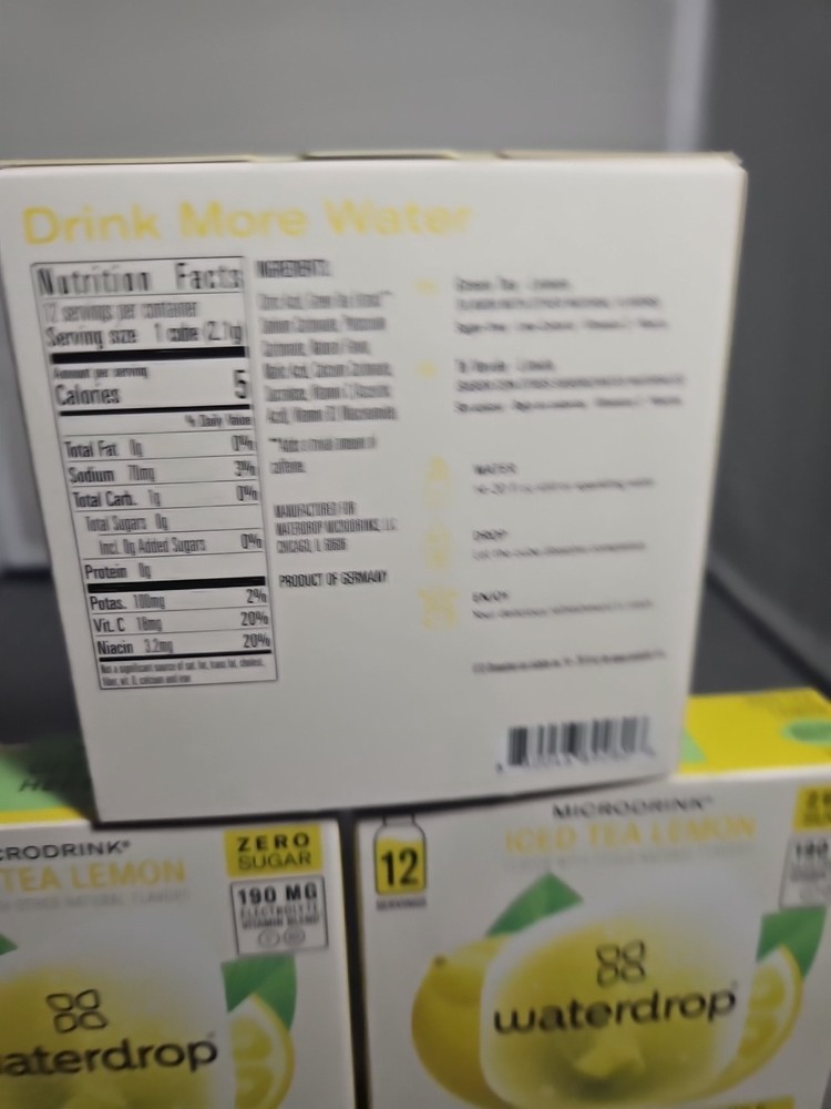 3 PACKS Microlyte Waterdrop Electrolyte Hydration Cubes FLAVOR IS " ICE TEA LEMON " 12ct EACH BOX BEST BY DATE 8/25. ANY FURTHER QUESTIONS PLEASE FEEL FREE TO ASK. SHIPPING: IF YOU ITEM IS NOT INSURED WE ARE NOT RESPONSIBLE FOR ANY DAMAGES IN TRANSIT FROM THE CARRIER. WE REGULARLY SHIP OUT SAME DAY NEXT DAY EXCEPT ON WEEKENDS IT WILL GO OUT MONDAY. WE ARE NOT RESPONSIBLE FOR THE SHIPPING CARRIER. OUR ITEMS HAVE DELIVERY CONFIRMATION NUMBERS AND WE ARE NOT RESPONSIBLE FOR ITEM ONCE IT IS SHIPPED. WE DO COMBINE SHIPPING WHERE APPLICABLE SO PLEASE CHECK OUT OUR OTHER GREAT ITEMS IN OUR STORE. SHIPPING & HANDLING ARE THE RESPONSIBILITY OF THE BUYER AND INSURANCE IS OFFERED. RETURNS: WE DO OFFER RETURNS. IF YOUR ITEM IS NOT TO YOUR SATISFACTION BECAUSE OF A MISTAKE BY US WE WILL GLADLY REFUND YOUR MONIES ONCE THE ITEM IS RETURNED. ITEM MUST BE RETURNED IN ORIGINAL PACKAGING UNOPENED FOR FULL REFUND. WE WILL NOT REFUND FOR ANY OTHER REASON. FEEDBACK: WE VALUE OUR BUSINESS WITH THE EBAY COMMUNITY. IF YOU HAVE A SITUATION THAT YOU ARE UNHAPPY WITH PLEASE CONTACT US FIRST SO WE CAN WORK WITH YOU TO FIX THE SITUATION. FEEDBACK IS AS IMPORTANT TO YOU AS IT IS TO US. UNFORTUNATELY A LOT OF PEOPLE DON'T LEAVE FEEDBACK AND GET UP SET AND LEAVE NEGATIVE FEEDBACK BEFORE TRYING TO WORK ANYTHING OUT WITH THE SELLER. WE WILL LEAVE FEEDBACK ONCE THE BUYER LEAVES FEEDBACK AND WE KNOW THAT THEY ARE HAPPY. THANKS AND HAPPY BUYING