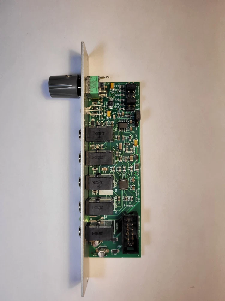The Circuit Slices Preamp+ (model number CS044) is a dual-function module for Eurorack-compatible synthesizers. In this narrow module is a microphone preamp and an envelope follower with CV and gate outputs. Use this module to process acoustic sources or to control functions in a modular synthesizer using acoustic sound. Now includes a header to select three levels of gain, to accommodate many types of microphones and pick-ups. The intended use for this module is not as a substitution for a lead vocal sound system, but rather to use acoustic sources for control and as signal sources in a modular synthesizer. With external acoustic-produced signals brought in to the analog synthesizer world, you can modify the signals or use the signals to control other functions in your synthesizer. Designed for use with electrect microphones and a wide variety of dynamic microphones. Features and Specifications for the CS044 Preamp+ All analog design using state of the art ICs and surface-mount construction Microphone amplifier has a voltage gain of over 100 (+40dB, +24dB, +50dB, jumper selectable) Designed to use Electret microphones and a wide variety of dynamic mics -- unbalanced / high impedance The Preamp output is “normal” patched to the envelope follower’s input The preamp and follower can be used separately – patching to the follower IN disconnects the preamp Gain control uses a panel-mounted 9mm potentiometer with a heavy-duty knob Jumper selectable pull-up resistor to power Electret microphones Dual-color LED indicates output signal level: above 2V peak (green) and above 5V peak (orange to red) Green LED above the GATE jack indicates when the GATE output is high (5V) Envelope follower tracks the input’s peak level from 0V to 5V and up to 10V Envelope follower outputs a GATE signal (5V) used to trigger envelope generators or other devices Gate threshold approximately ~0.5V at follower’s input Includes power cable and case screws Reverse power protection Power: +12 VDC @ 40 mA, -12 DC @ 9 mA, using a standard Eurorack 10-pin power connection Connections: Standard 3.5mm jacks Depth: 30 mm Panel width: 4 HP Will not work with condenser microphones requiring phantom power. Find the PDF User Manual near the bottom of the Circuit Slices homepage