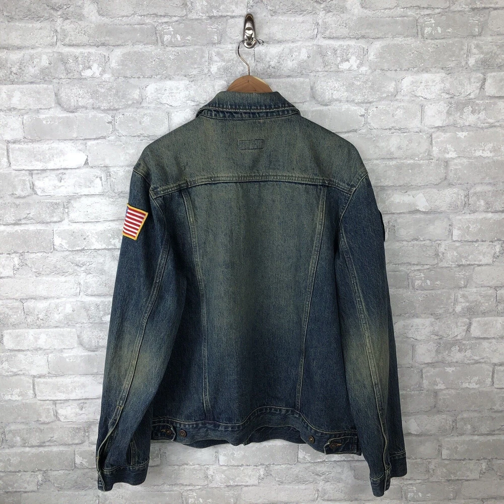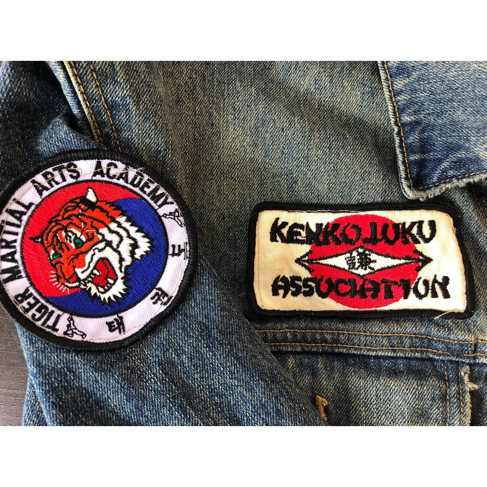 Mid 2000's Old Navy Custom Patched Mens XL Denim Jacket 100% Cotton Kenkojuku Association, Tiger Martial Arts, USA Flag patches. Flat Lay Measurements * Pit to Pit - 23 1/2" * Outer Arm - 26 1/2" * Shoulder to Hem - 27 1/2" * Bottom - 21 3/4"