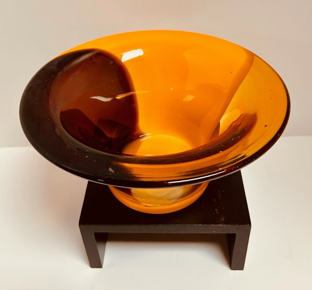 Elevate your home decor with this stunning Mid Century Cased Art Glass Fluted Bowl/Vase in vibrant orange, purple, and brown hues. Perfect for adding a pop of color. The vase is 4" tall and is 8 1/4" wide at the rim. Shipping $19.99.