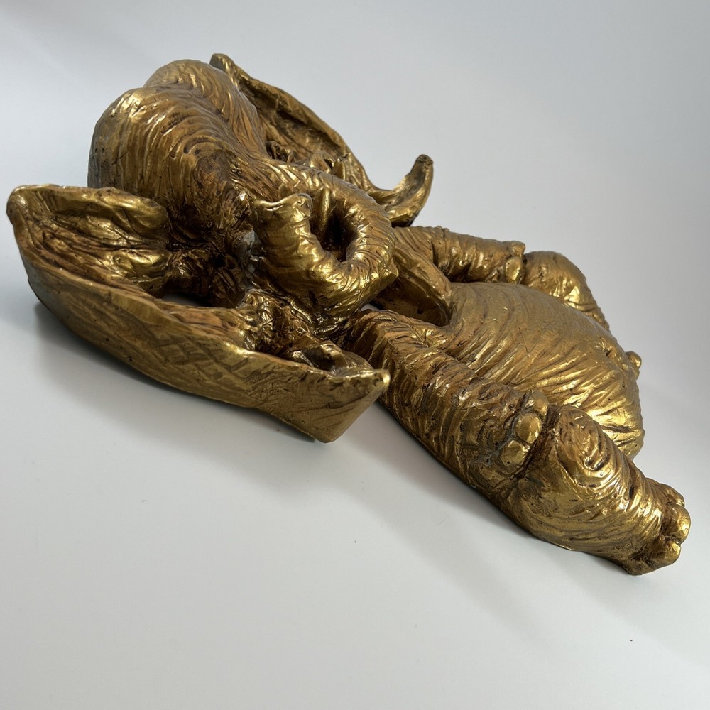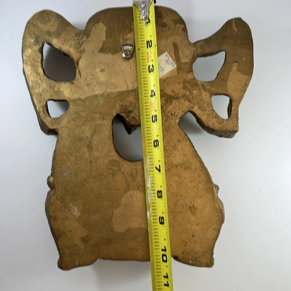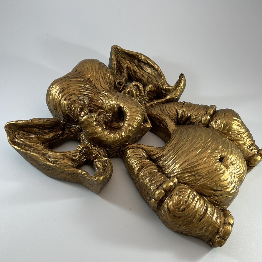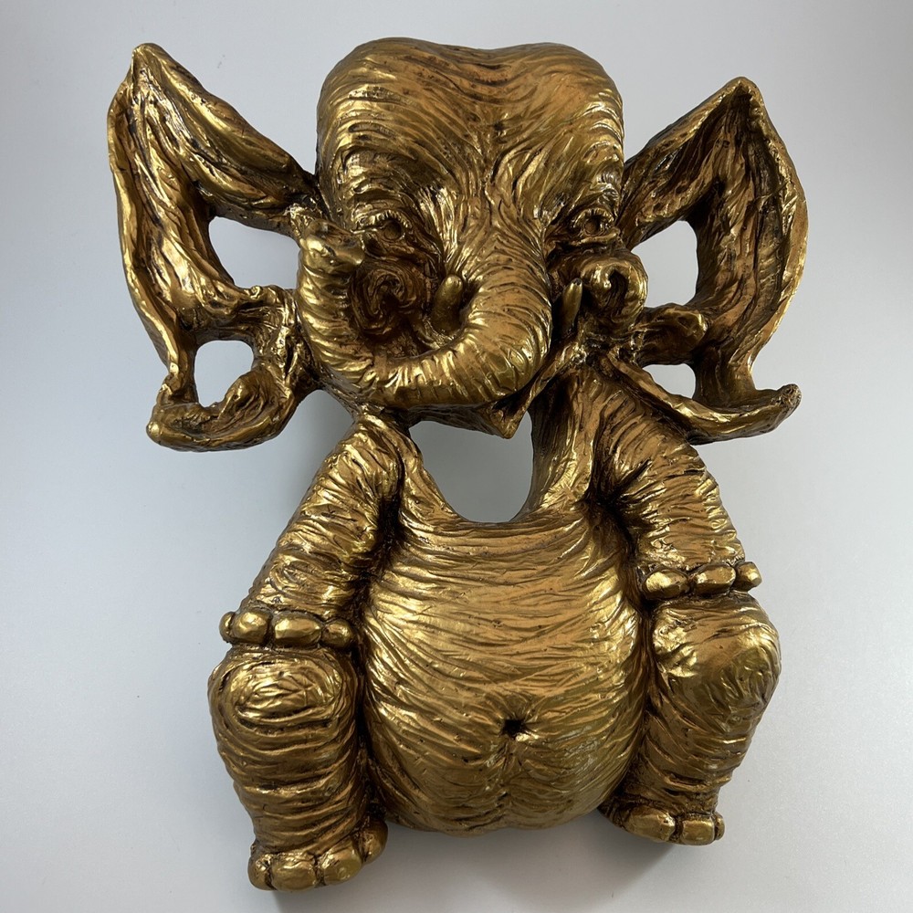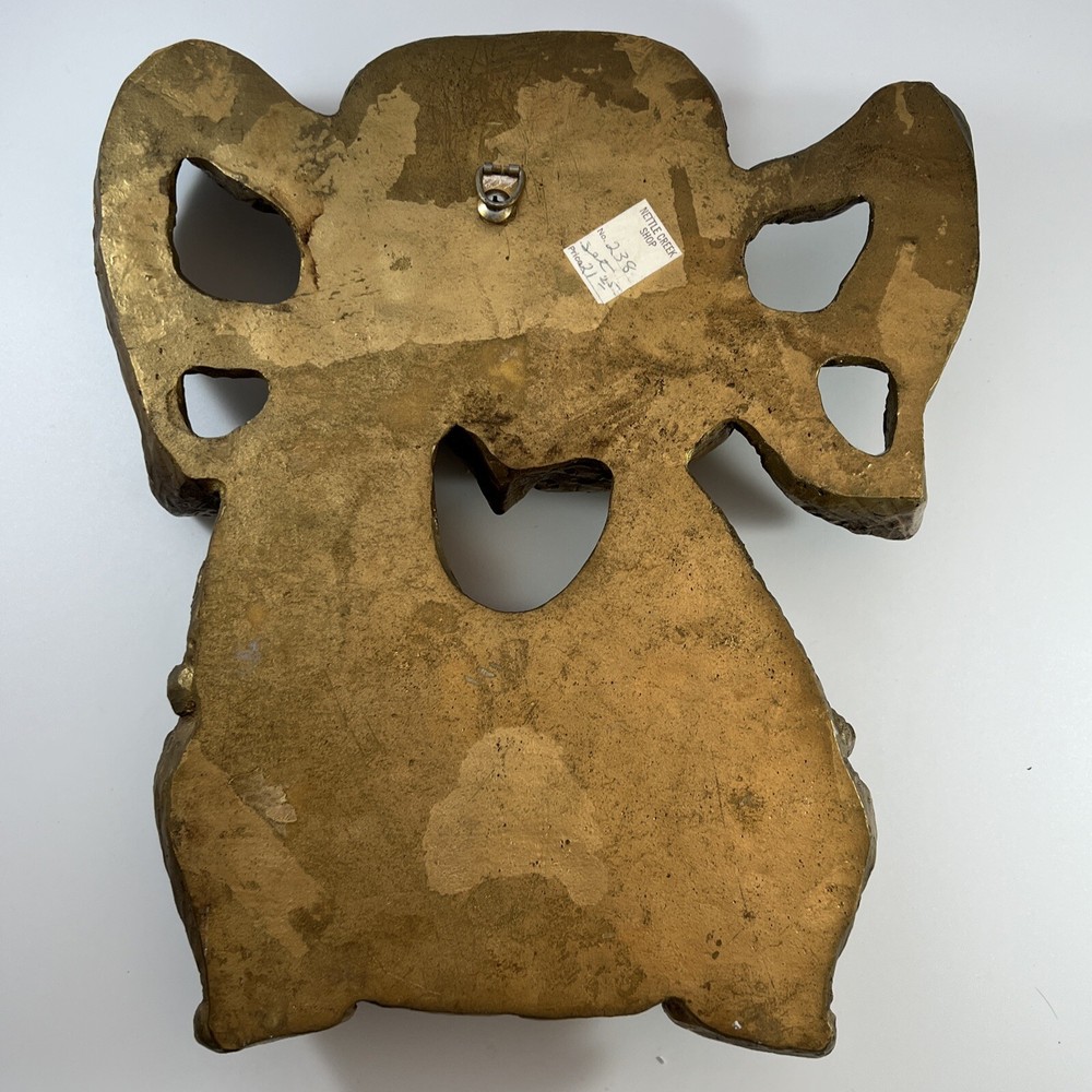 This gold elephant wall hanging is a sculpture crafted in a mid-century modern style, featuring a relief design from 1972. The piece showcases a safari theme, with a sleek and modern interpretation of an elephant. Perfect for home décor, this sculpture adds a touch of elegance and artistry to any space with its unique aesthetic.