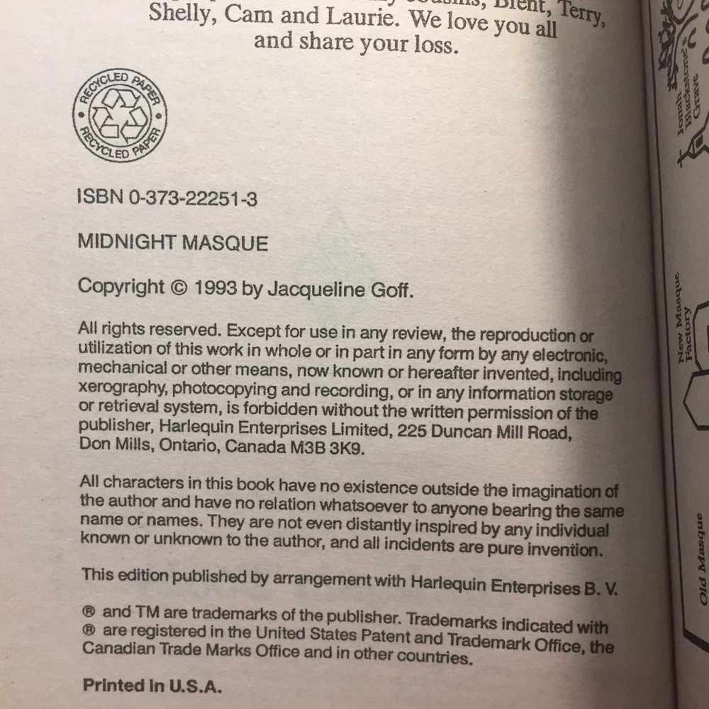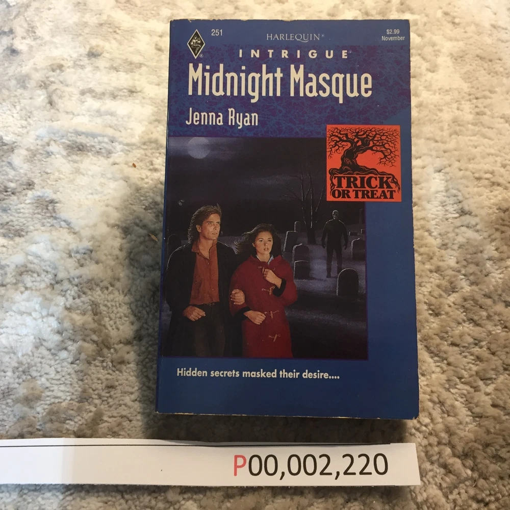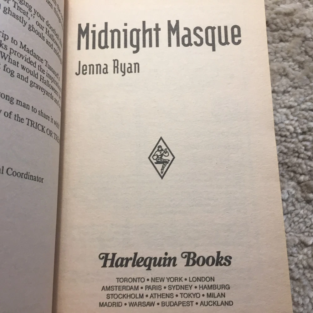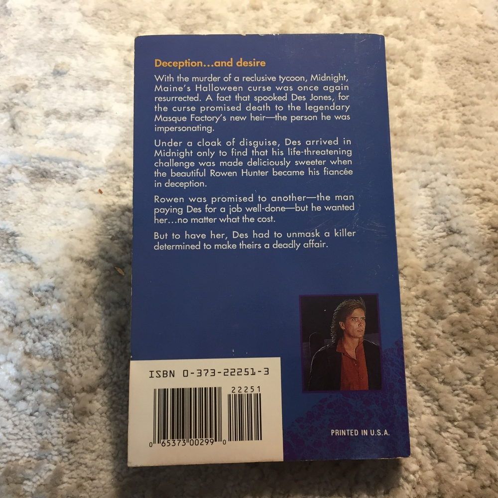 Midnight Masque Jenna Ryan 1993 Harlequin Intrigue Romantic Suspense Thriller When a reclusive tycoon is murdered, Midnight, Maine’s notorious Halloween curse roars back to life. Des Jones slips into town under a false identity—the newly named heir to the Masque factory—to flush out a killer who may be using local legends, old tunnels, and a century of secrets as cover. Rowen Hunter should be planning a wedding to another man, not helping Des expose a murderer. But the fake engagement that keeps them close to the suspects also sparks a very real attraction. As the masquerade deepens and danger closes in, Des and Rowen must decide who to trust—and whether love can survive when every truth wears a mask. Book is in good condition. Photos are the final arbiter of condition. Please see photos for details, and let me know if you have any questions. Shipping and Return Details Use Coupon Code THEBOOKSAVINGS for a Buy 2 Get 2 FREE at checkout (must have 4 books in cart to apply). FREE Shipping if your order total is over $100. We can combine shipping. We ship daily so you can expect a quick delivery! We offer free returns. No questions asked. Please feel free to ask any questions you may have. Thank you from John a small town bookshop.