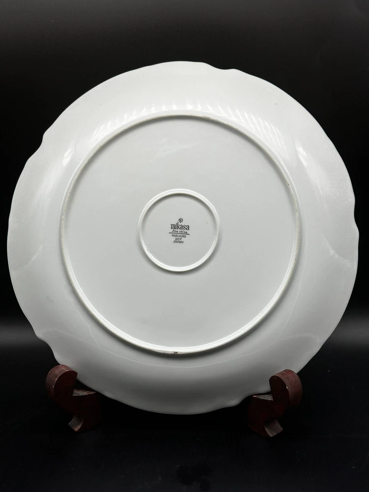 For sale pre-owned and vintage chop plate made by Mikasa in the 1970s in Japan. This bone china chop plate has a glossy white background featuring platinum trim and verge on the scalloped rim. This patter has been discontinued. Details: 12 inches diameter 1 1/8 inches high 2 pounds 5 ounces weight
