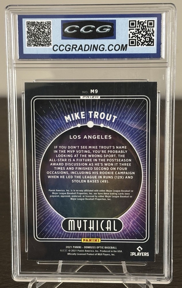 The product is a Mike Trout CCG Gem Mint 10 Mythical Silver Holo trading card from the 2021 Panini Donruss Optic set. This highly collectible baseball card features the Los Angeles Angels player in a rare silver holo parallel variety, making it a sought-after item for fans and collectors. With its professional grading and inclusion in the Mythical insert set, this card holds value for both its rarity and association with a top player in Major League Baseball.